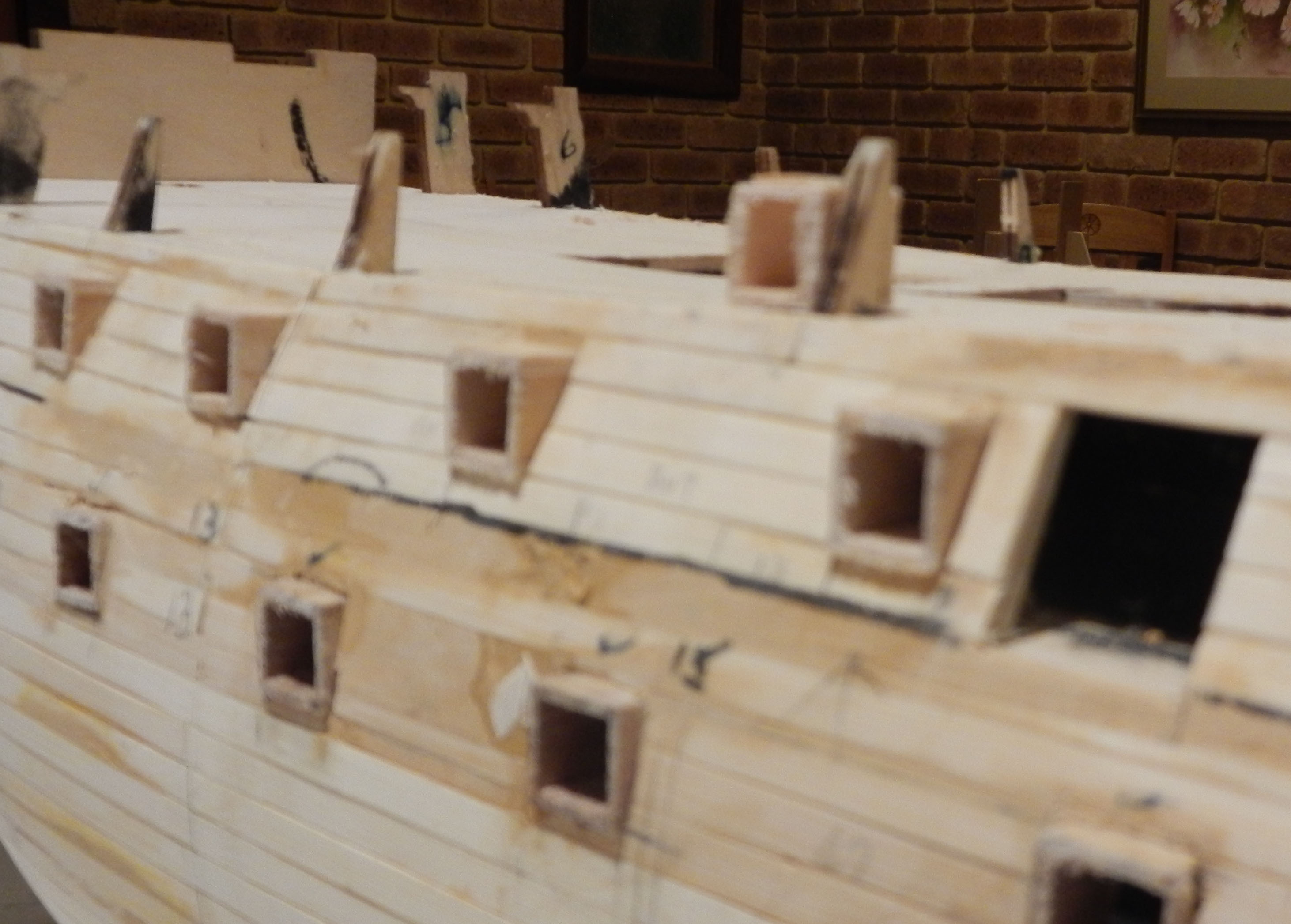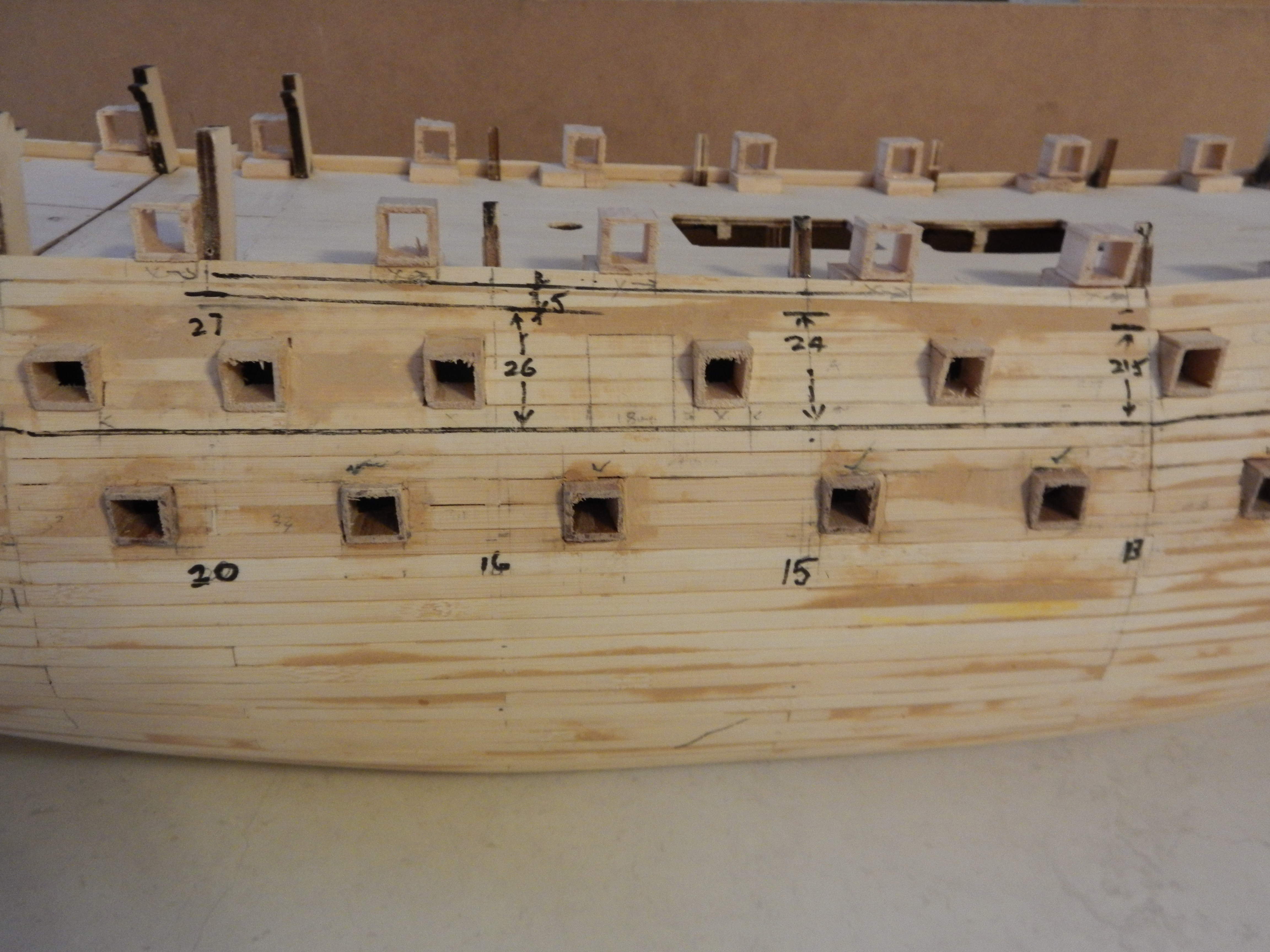 Your centre row of ports look fine so don't see any need to change things here. In dealing with the top row of ports, you could plank the rest of the hull all the way up, again as per the instructions. Plank up above the tops of the smallest ribs by some 3-4mm, can trim this back later. Once planked, mark out the ports giving at least 2-3mm from the bottom of the port to the deck as outlined by Nightwisher. Any lower than this and you will find your gun barrels will be too high, perhaps even touching the tops of the ports and this just wouldn't look right. You also have to consider the ornamentation to be fitted alongside the hull. Cutting out the gun ports is not difficult on bamboo. Drill a series of 1mm holes all the way round the port, drill inside the marked port outline. Then using a fresh blade you will find the port easy to cut out. Trim the port near the outline and finish off using a fine file. Using this method you will find cutting the ports out very easy.
