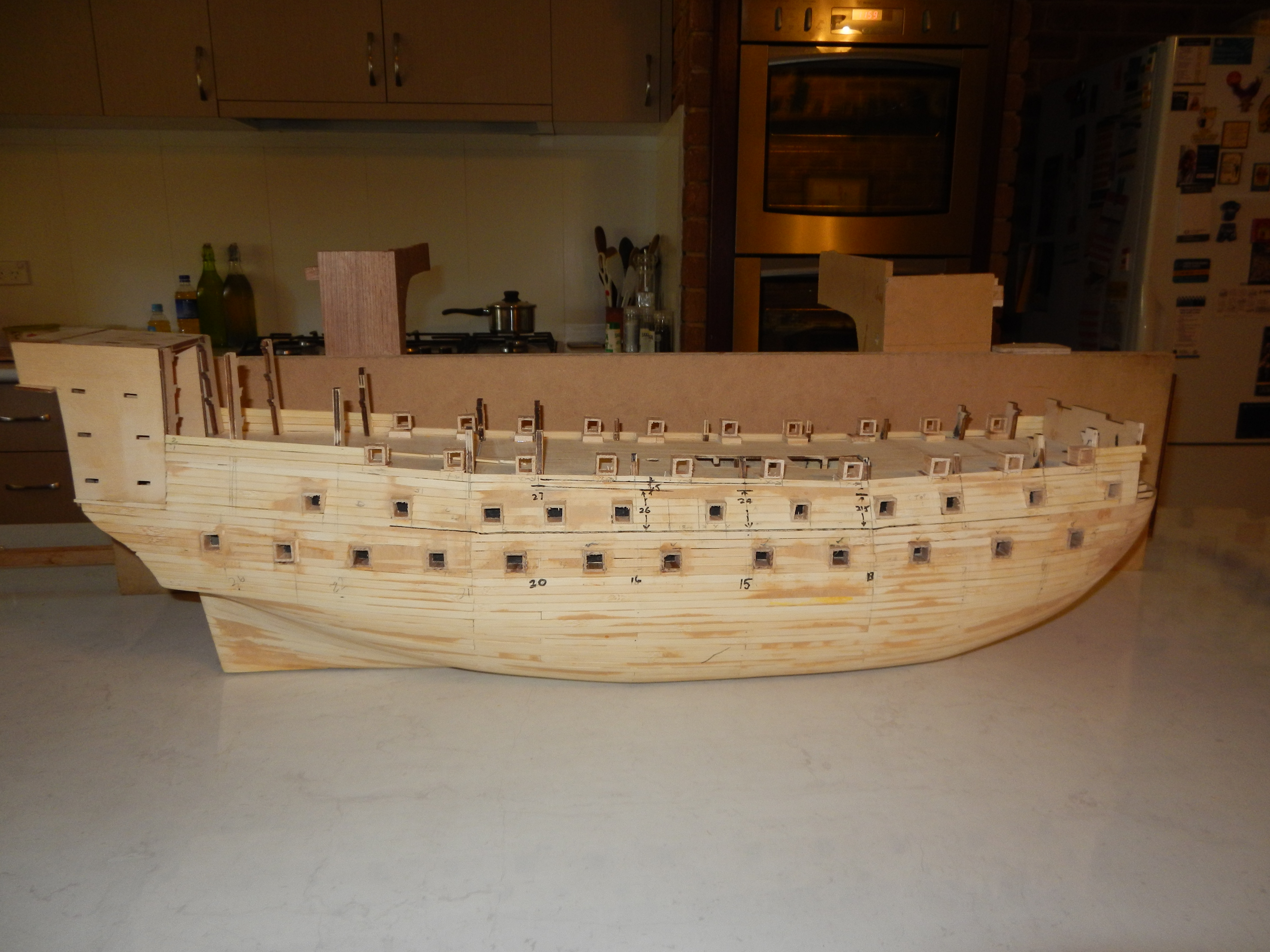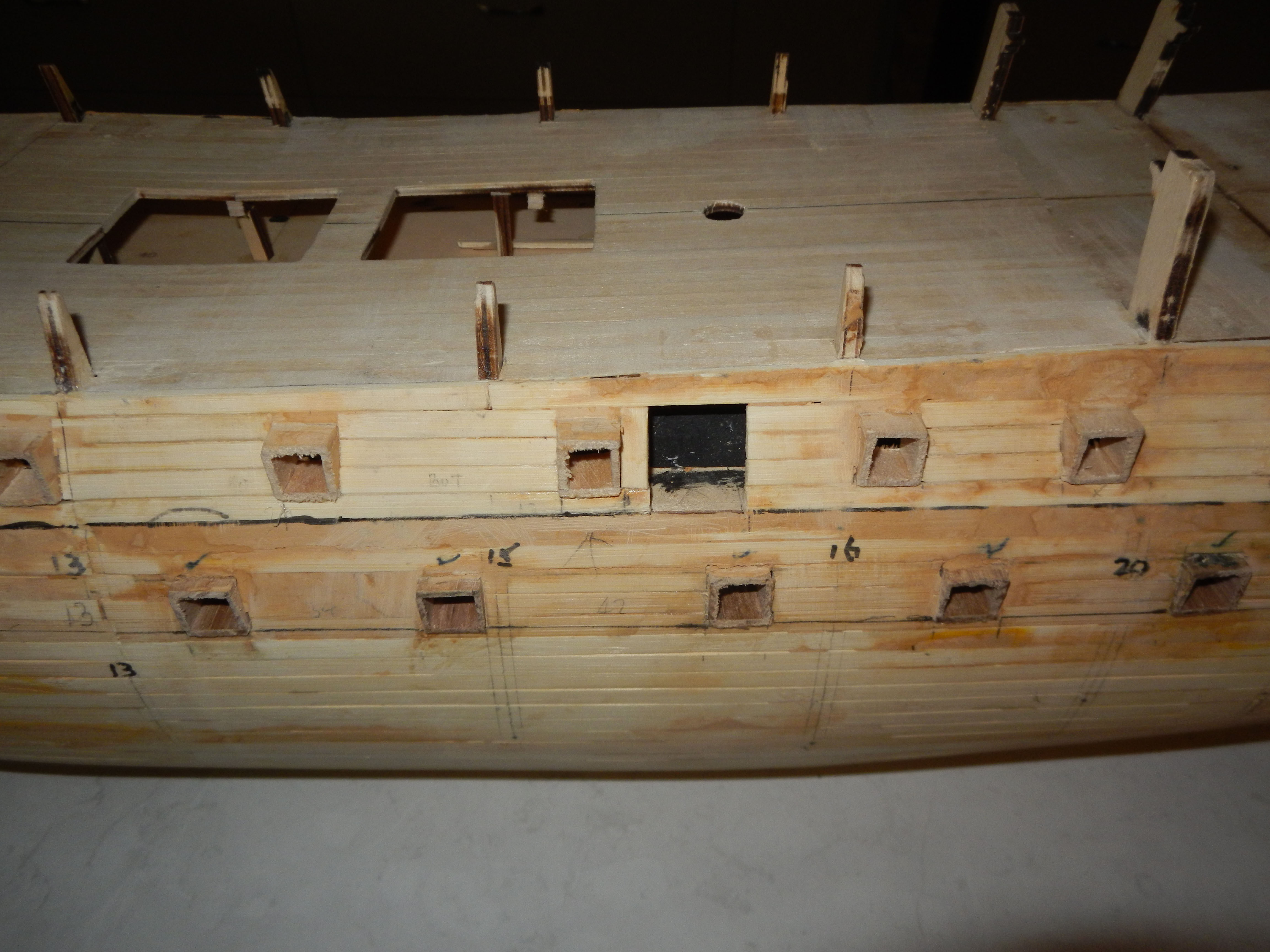 G’day Peter, I have just finished this portion of the build so I may be able to offer some assistance if I can. It looks like your middle row of gun ports are about 5mm too high which has a knock-on effect of raising the height of the top row of gun ports by 5mm. I am unable to see where your fwd to aft reference lines are that are used as the baselines for measuring the height of the gun ports, so I am judging by your photos. It looks as though you have a 15mm gap between the top of the lower row of gun ports and the base of the middle row. This is based on you having three planks between these rows (assuming that they are 5mm wide bamboo planks as supplied). On my build I have two rows of planks separating the lower and middle rows of gun ports (approximately 10mm). I have provided a picture of my build showing similar area. Recommend that you check and double check you measurements starting with the reference lines then the height of the gun ports with respect to the reference lines. Hope this helps. Regards, Adam AdamHall attached the following image(s):