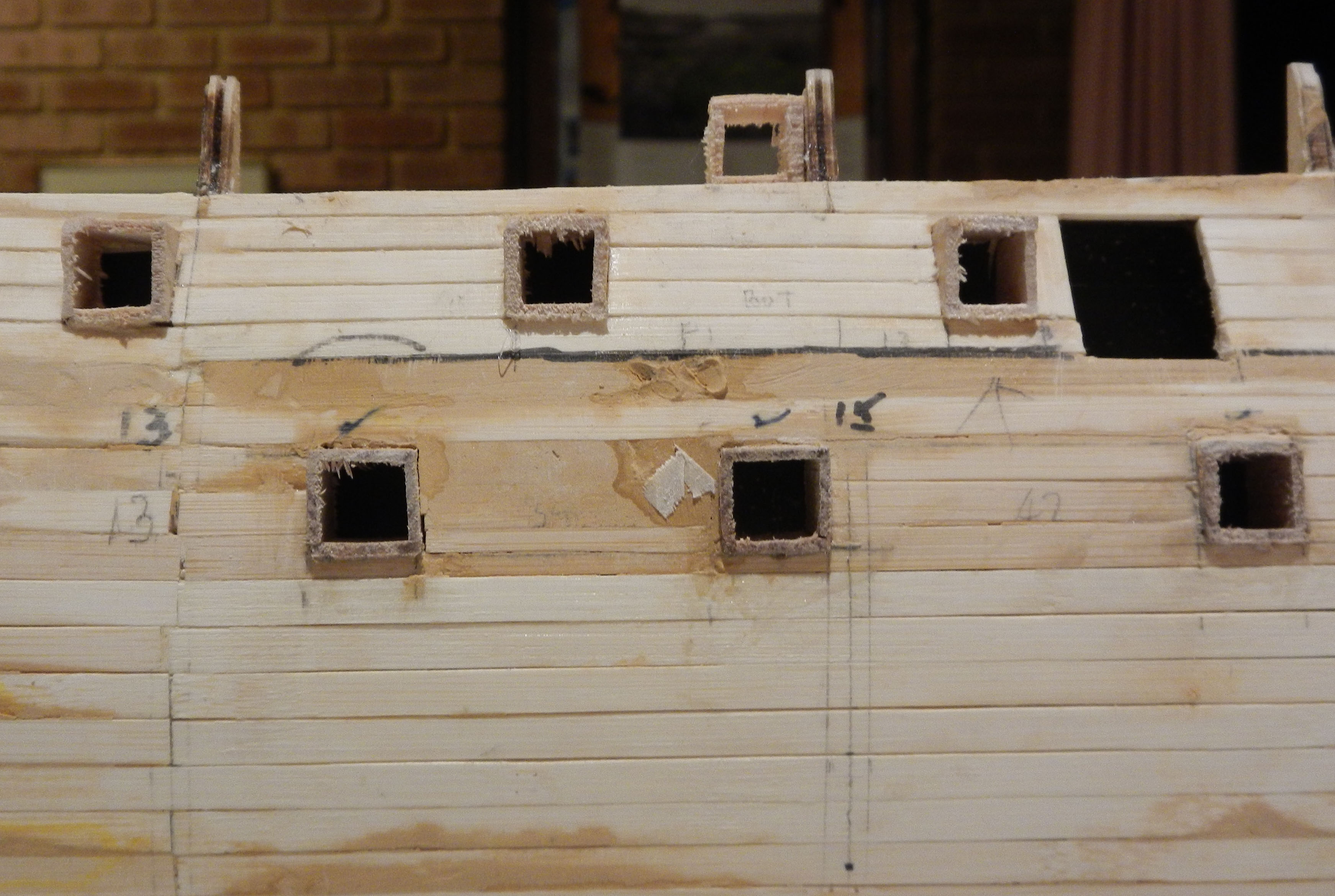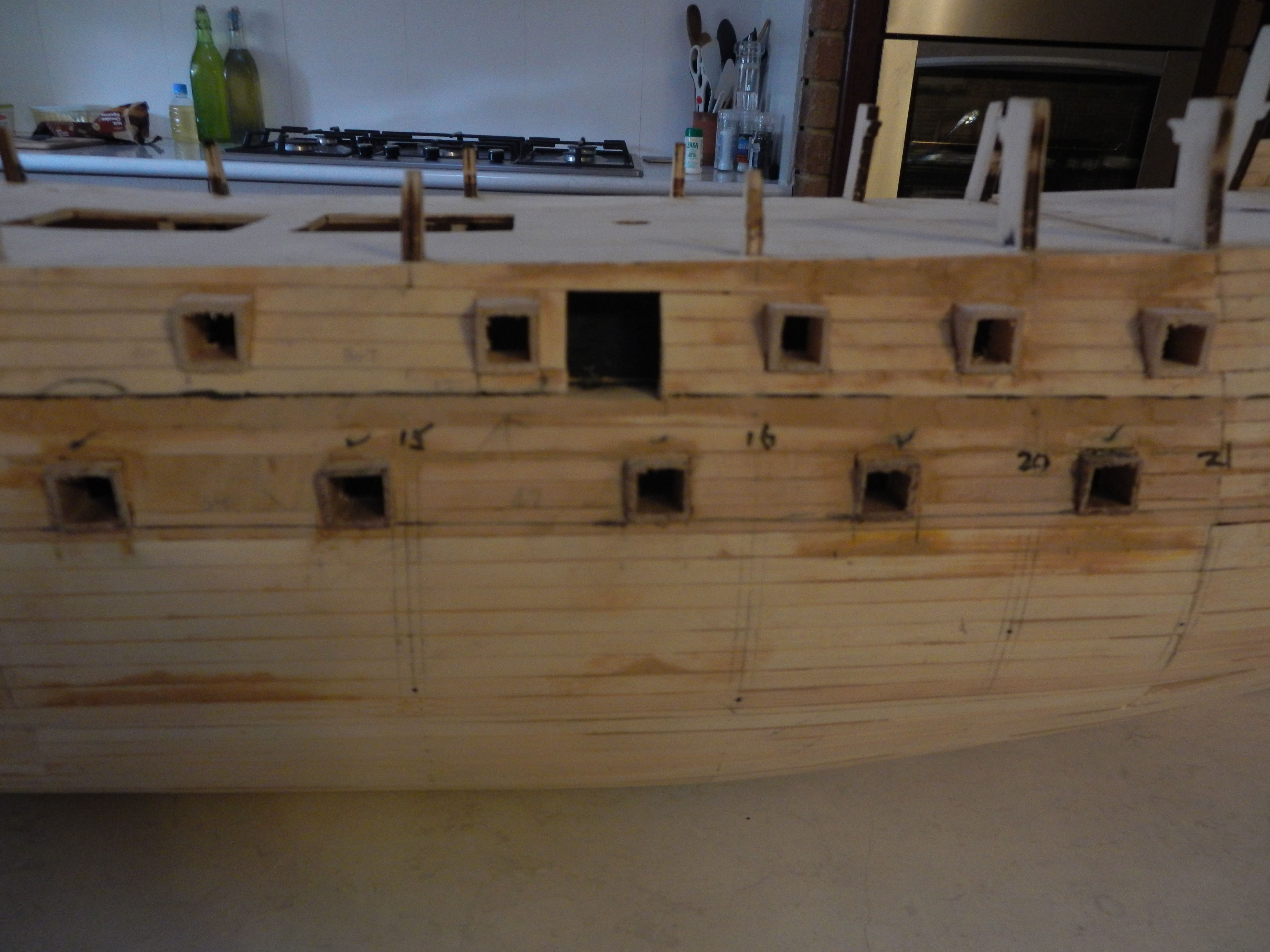 Hi Peter I've been looking at your little problem re the gun ports and would offer my two pennies worth... For cutting of the holes in the bamboo strakes have a look at my thread, page 8, post#145. (sorry, I don't know how to put a link in). I found things a lot easier drilling the little holes and then "joining the dots" - so to speak...  Hope this helps Best regards JohnP