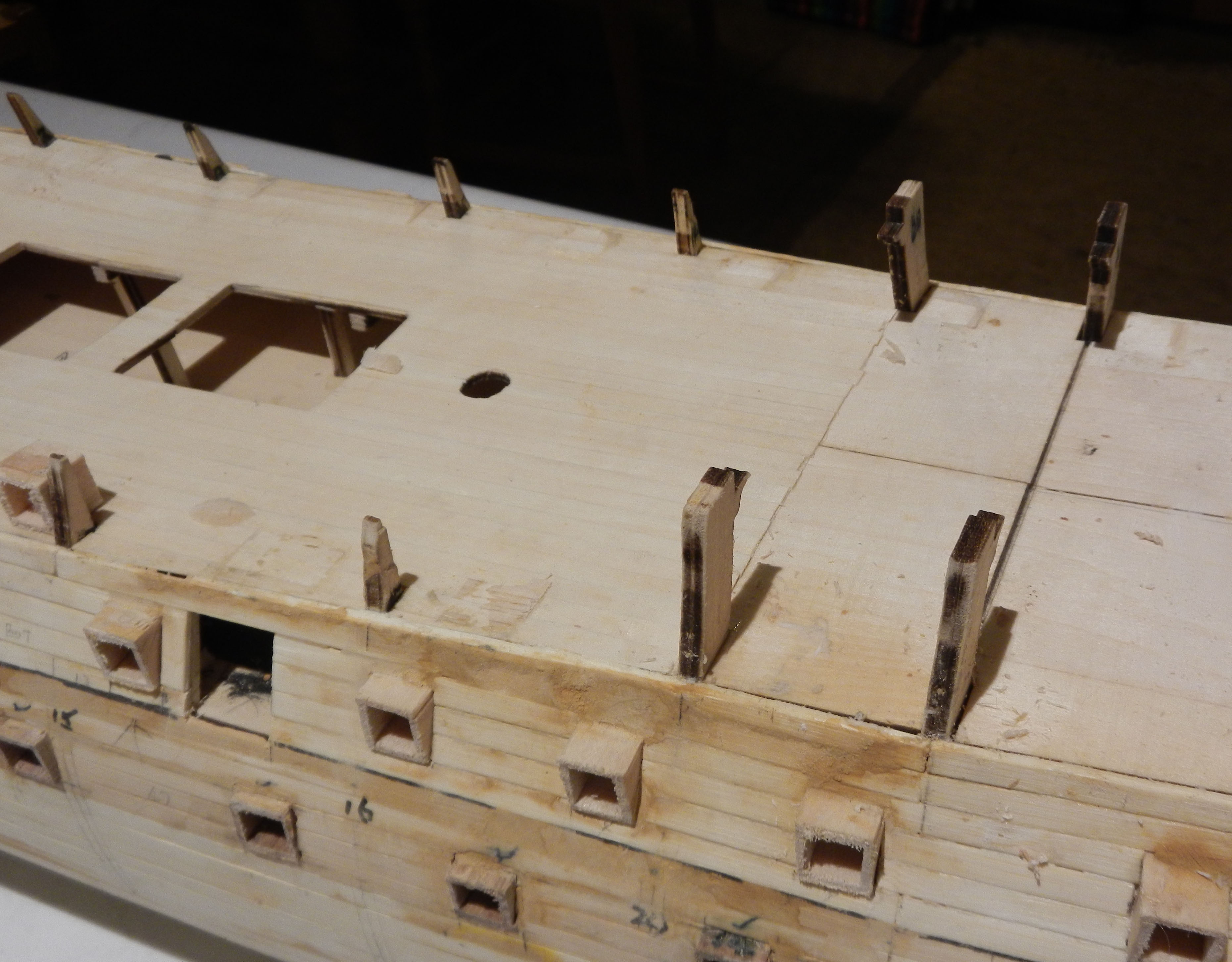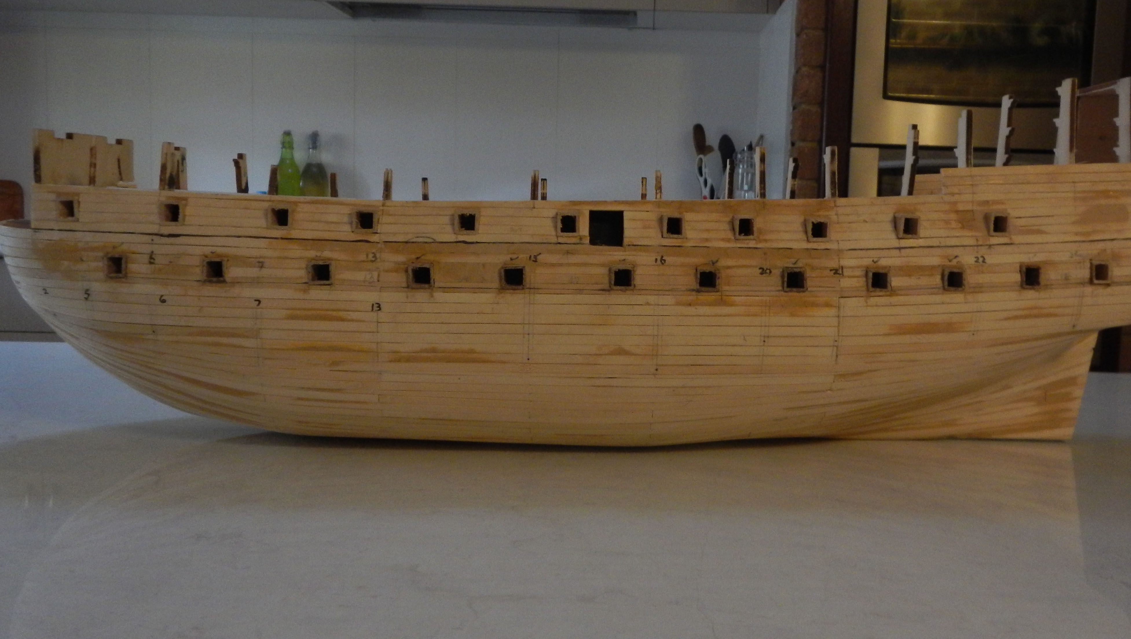 Hi Alan, The lower row of gun port linings are sitting on the lower deck. The 23mm line has been drawn and is visible in the photos. Also, the lower line and the deck can be seen in the middle photo of the hatch. In cutting the holes for the linings, the lower edge was on the level with the deck surface except the for and aft sloping sections this had to be marginally altered due to the angle of the deck. I put the leading edge or trailing edge on the deck level with a small spacer under the opposite edge to get the port linings horizontal. An easy way forward might be to confirm a dimension from the tip of the short ribs to the top of the linings?? I say this as there are no strakes to draw lines on! Regards, Peter