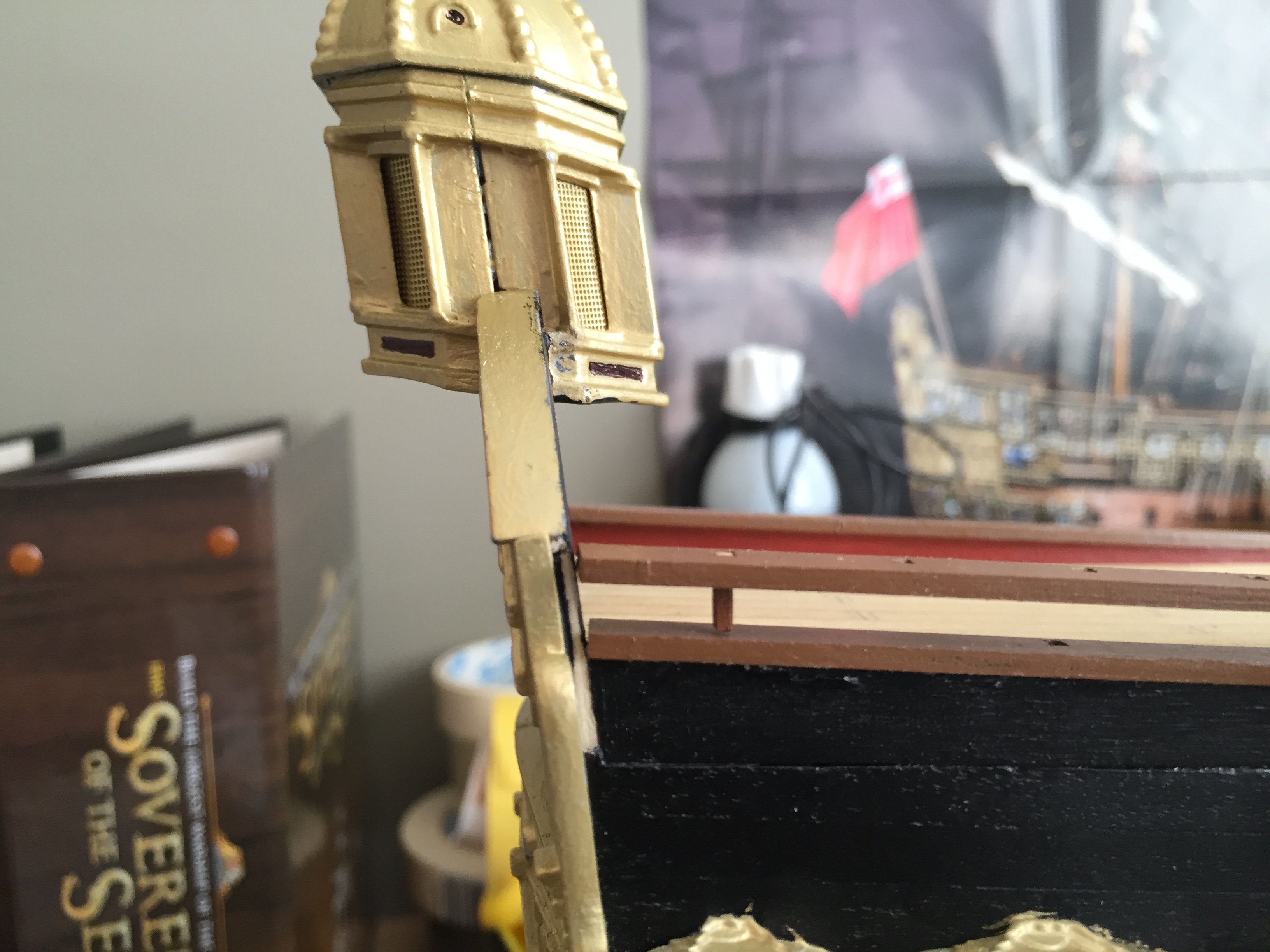 In the assembly guide pictures the gunwales of the upper quarterdeck look like they reach the curved part of the stern crown (step 18)