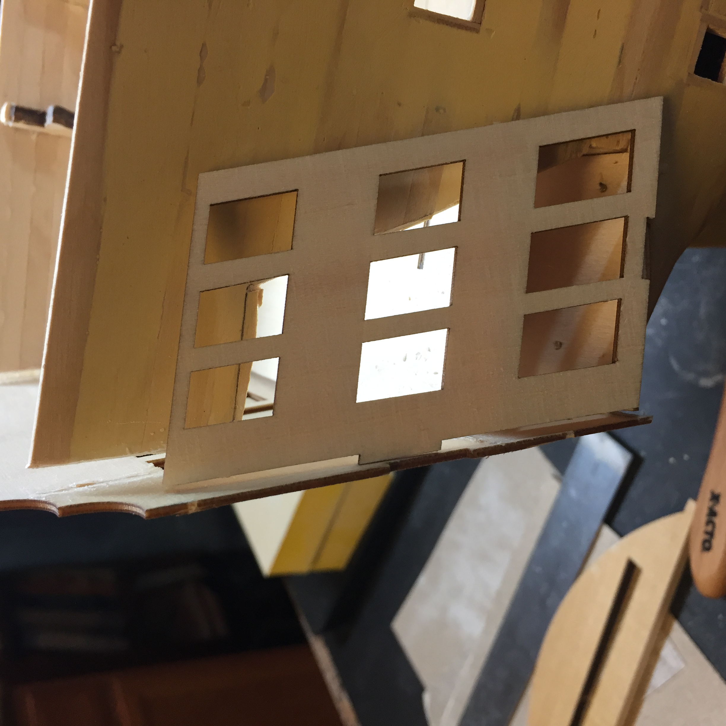 I had a similar issue and I found it was my fault because I hadn't read the instructions properly and didn't soak the lower false deck to bend it. Also I didn't sand the edges of the gallery supports. So the lower false deck didn't follow the curve of the lower edge on the main gallery back piece. So this inturn pushed the sides up like yours has.