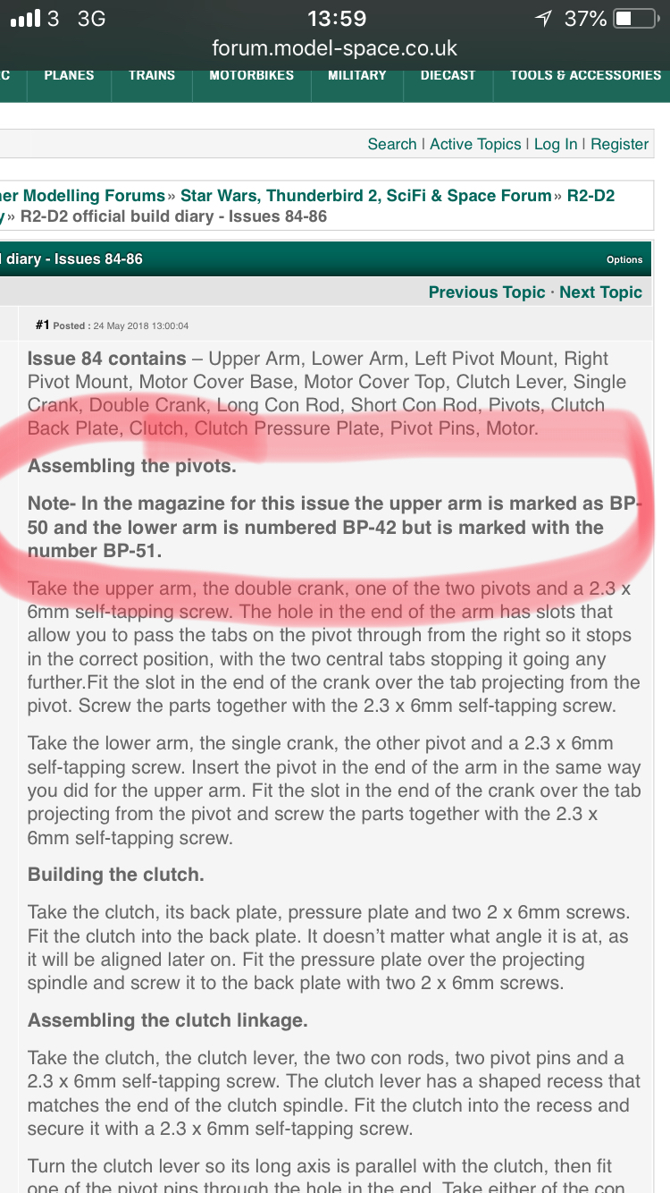 However, logic aside, the pictures in the issue resolve this problem as the pivot ends of the arms differ and as long as people follow the pictures and take notice of the position the arm is in and the number of slots around the hole (2 OR 4) then it should be easy to get the arms correct.