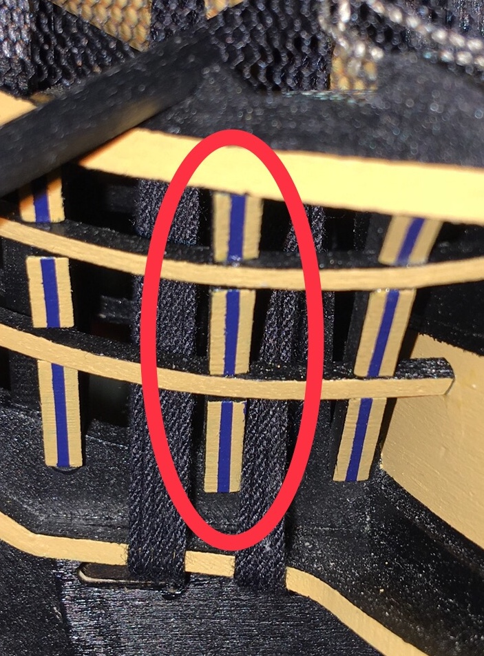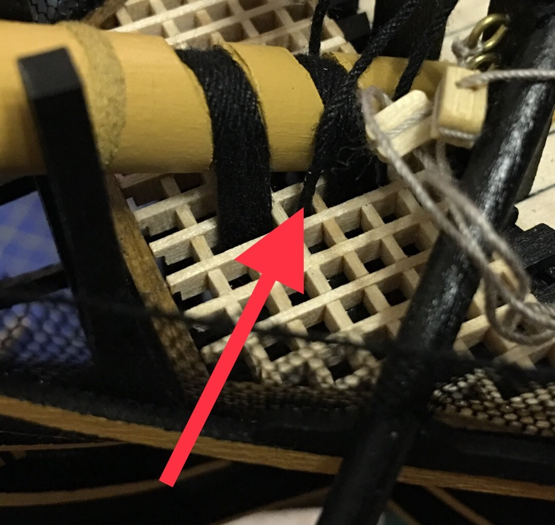 However the second one, which supposed to be go through the hole between the two gammoning openings, impossible to make. Those holes are fully blocked by the bow frame between the two gammonings.