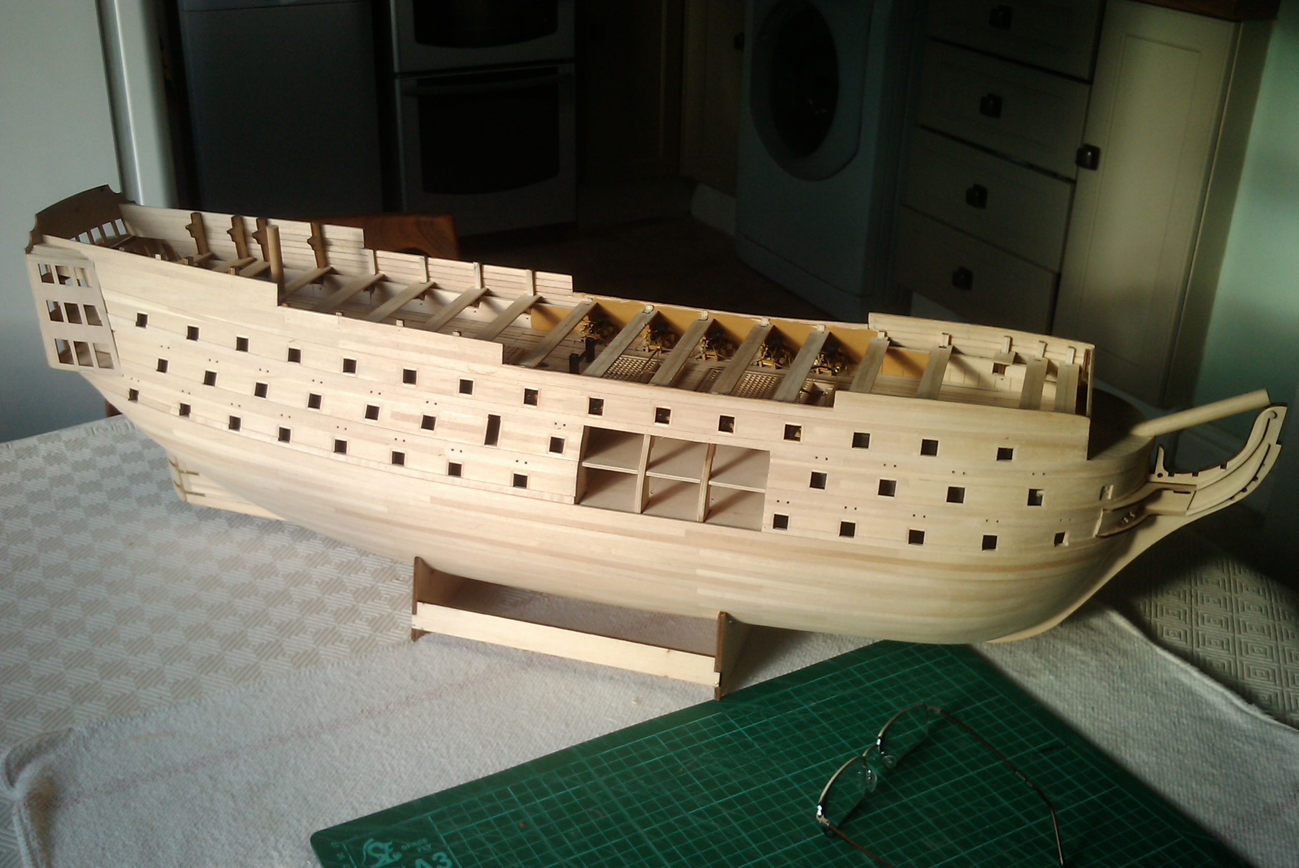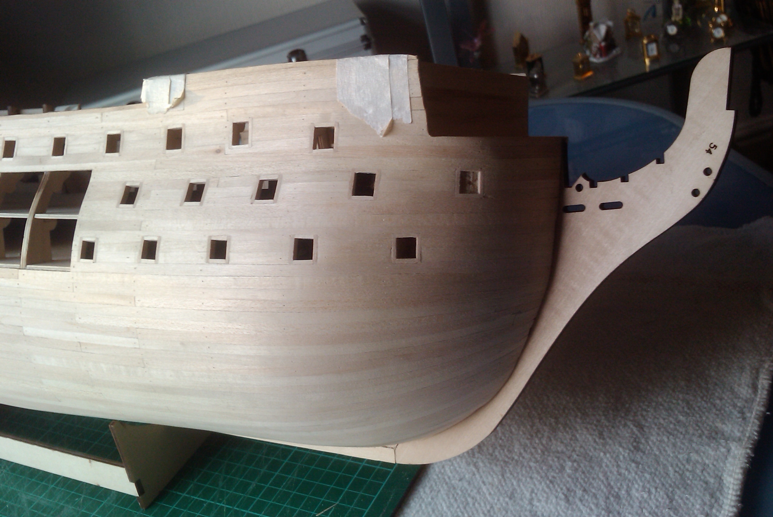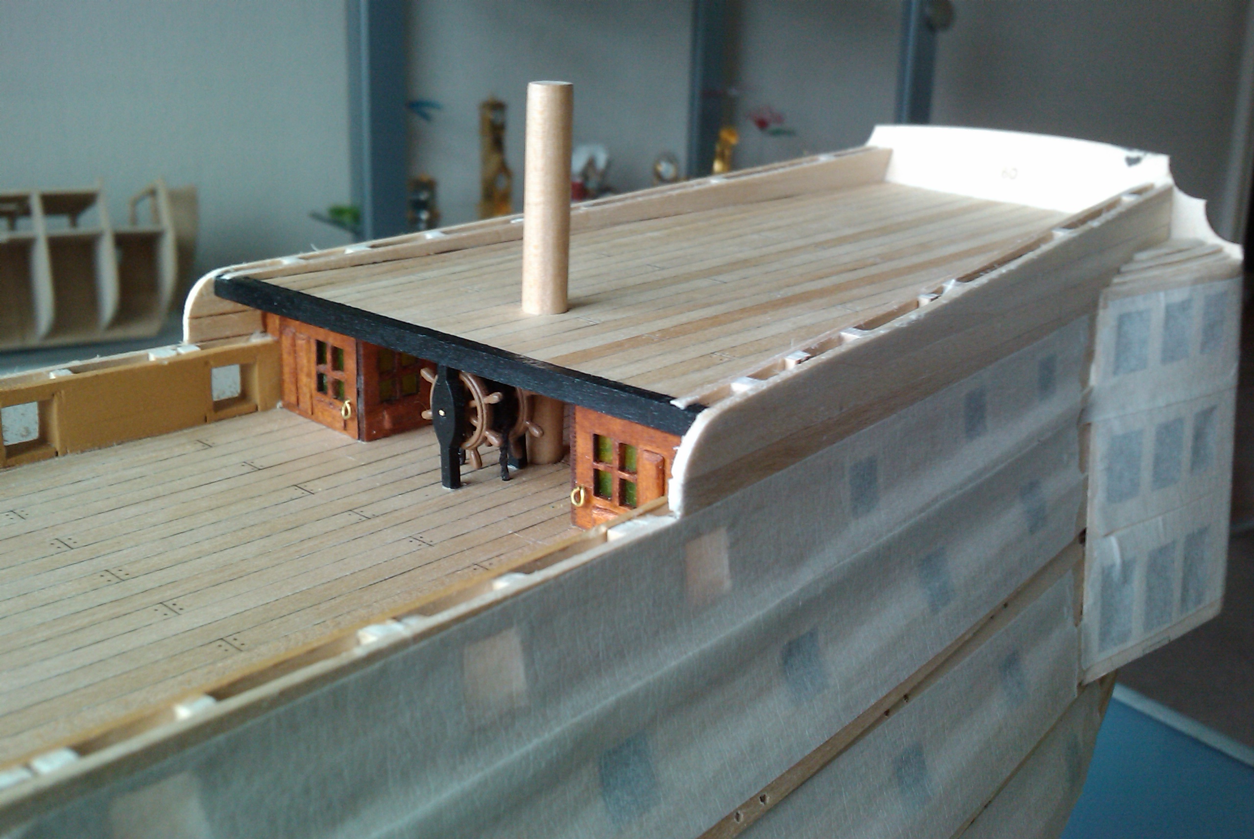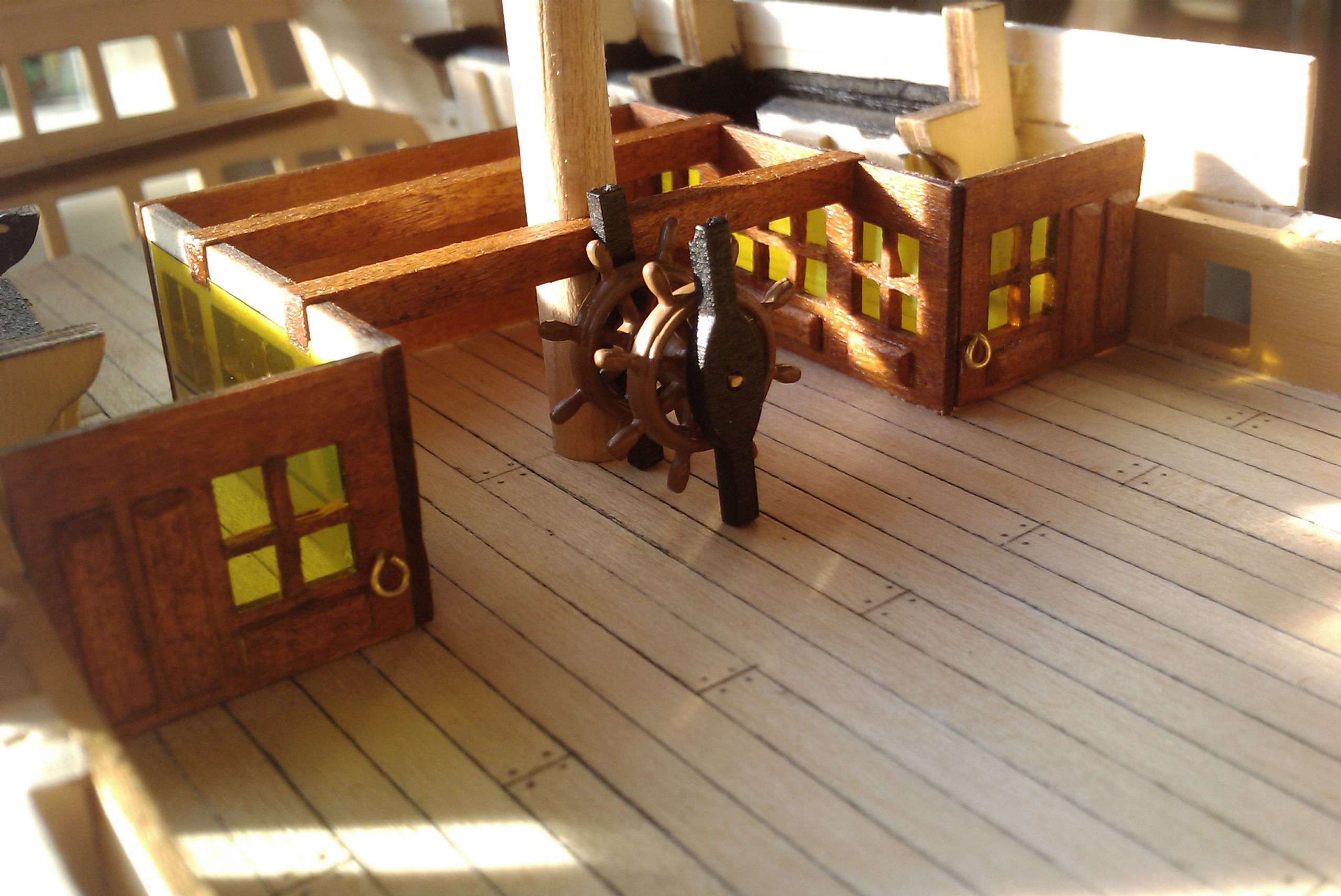 Now that i am half way more or less in the build i thought i would share it with you. I had a few problems with the planking of the bow to start with but after stripping several rows off and fairing some more i eventually overcame that issue. I have found that as i have progressed i have gained confidence in overcoming obstacles and trying things a little for myself. For instance, due to the invaluable input from other members,without which this would have been a long , hard and uphill struggle, i put window frames into the quarterdeck partitions to give them a more realistic look, and also put rope on the ships wheel feeding it down through the deck. Cant remember who posted this but thankyou.
