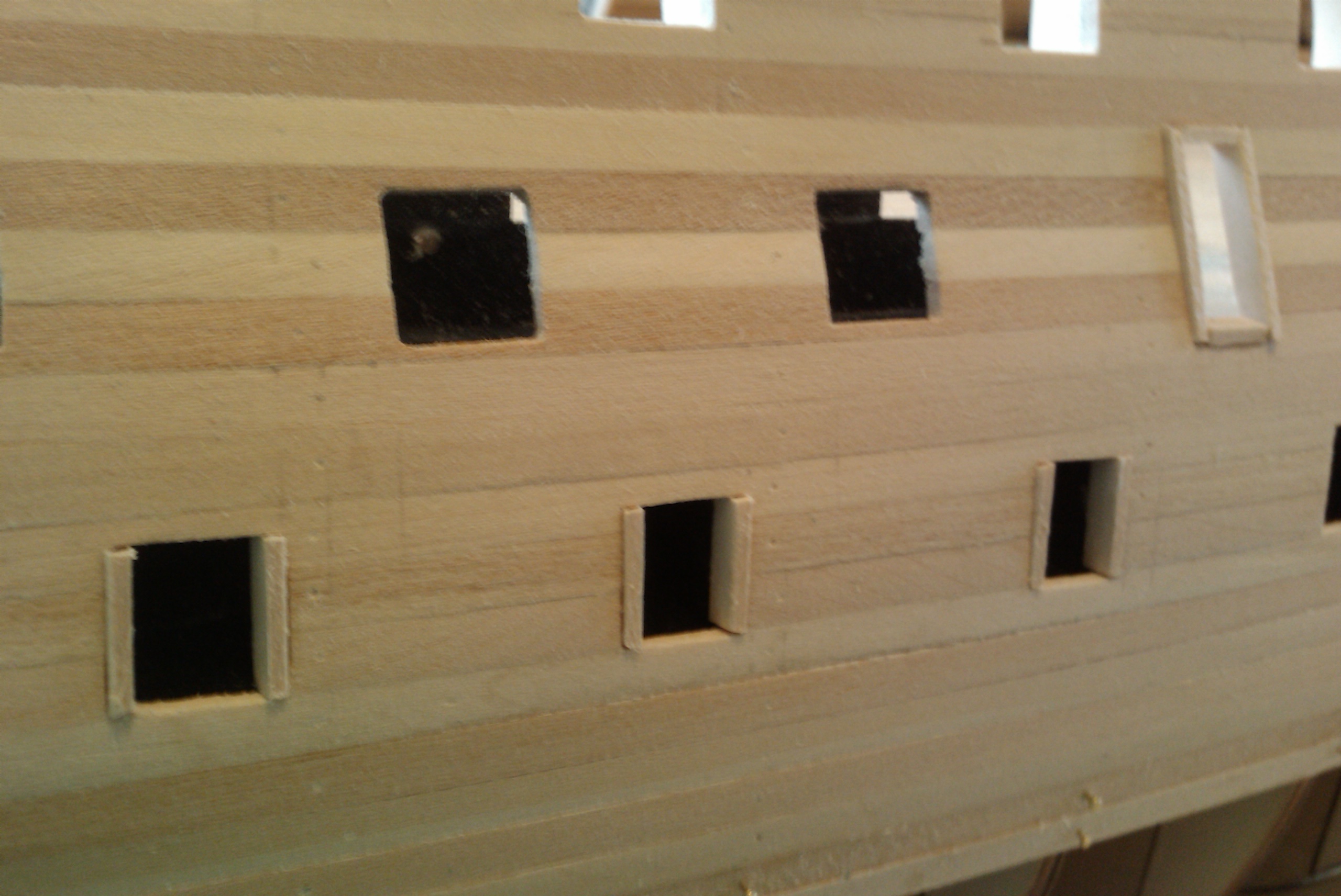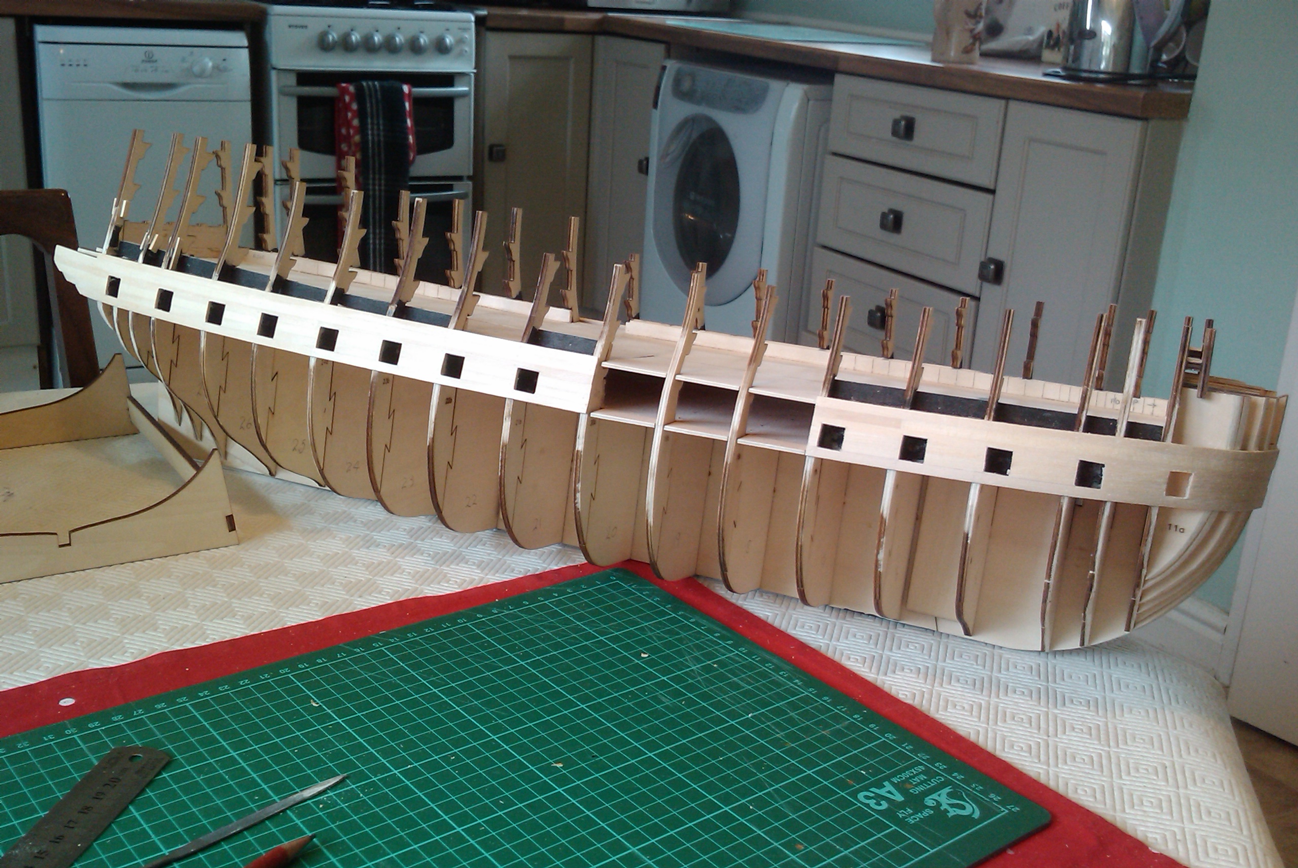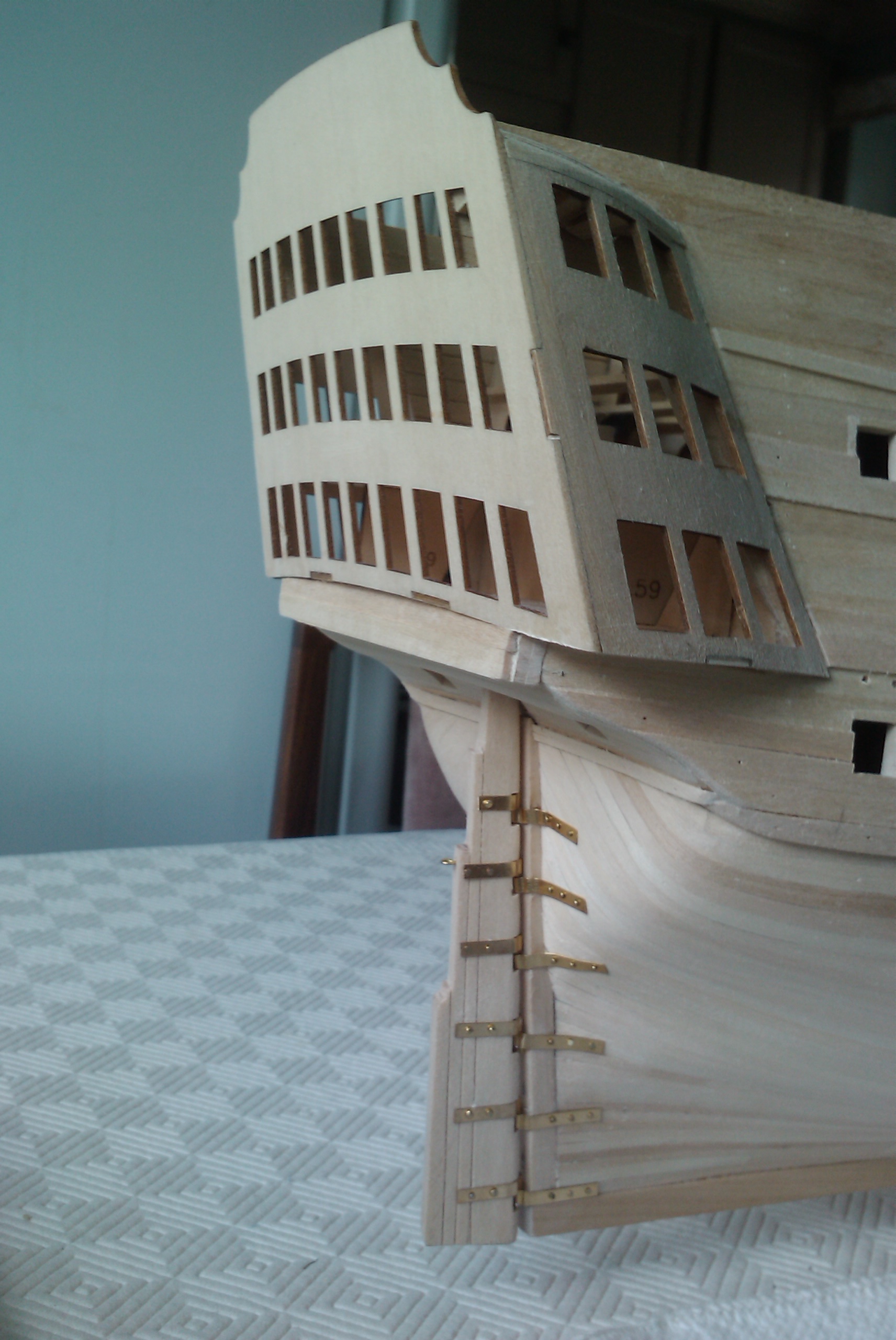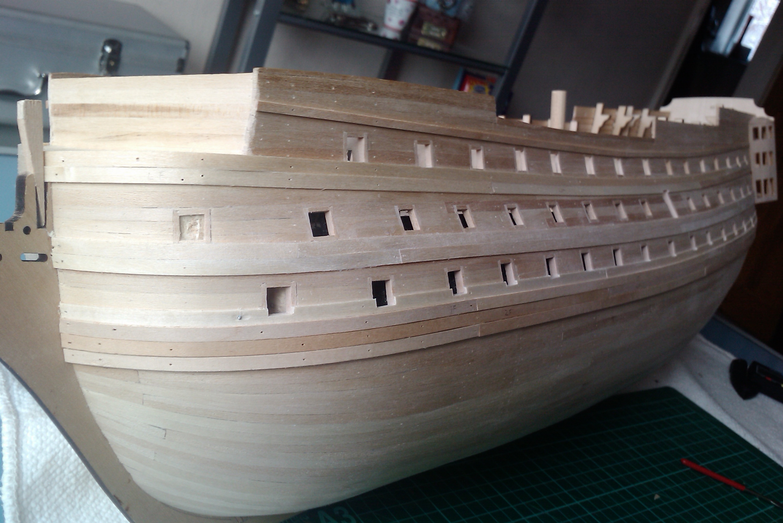 Now that i am half way more or less in the build i thought i would share it with you. I had a few problems with the planking of the bow to start with but after stripping several rows off and fairing some more i eventually overcame that issue. I have found that as i have progressed i have gained confidence in overcoming obstacles and trying things a little for myself. For instance, due to the invaluable input from other members,without which this would have been a long , hard and uphill struggle, i put window frames into the quarterdeck partitions to give them a more realistic look, and also put rope on the ships wheel feeding it down through the deck. Cant remember who posted this but thankyou.