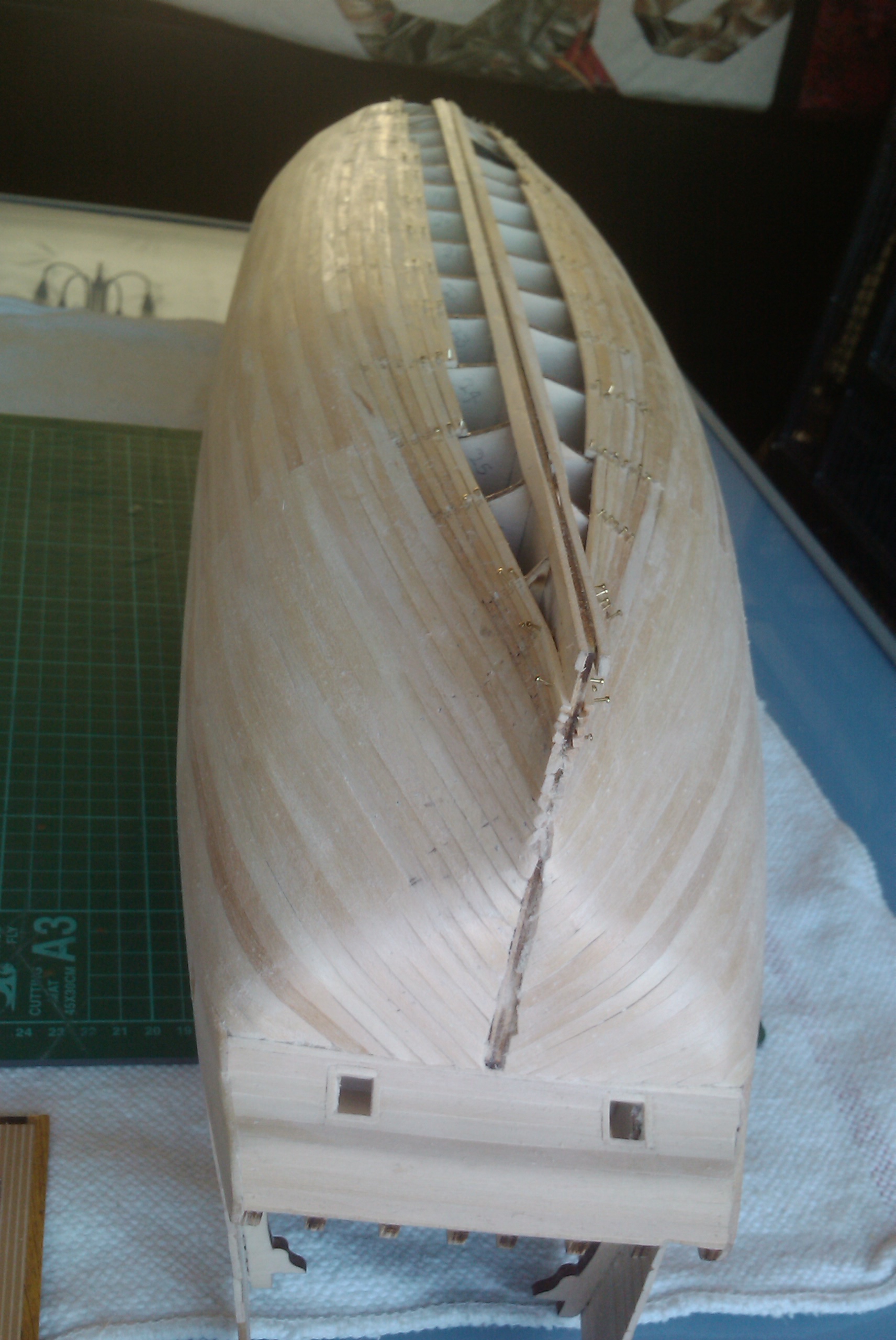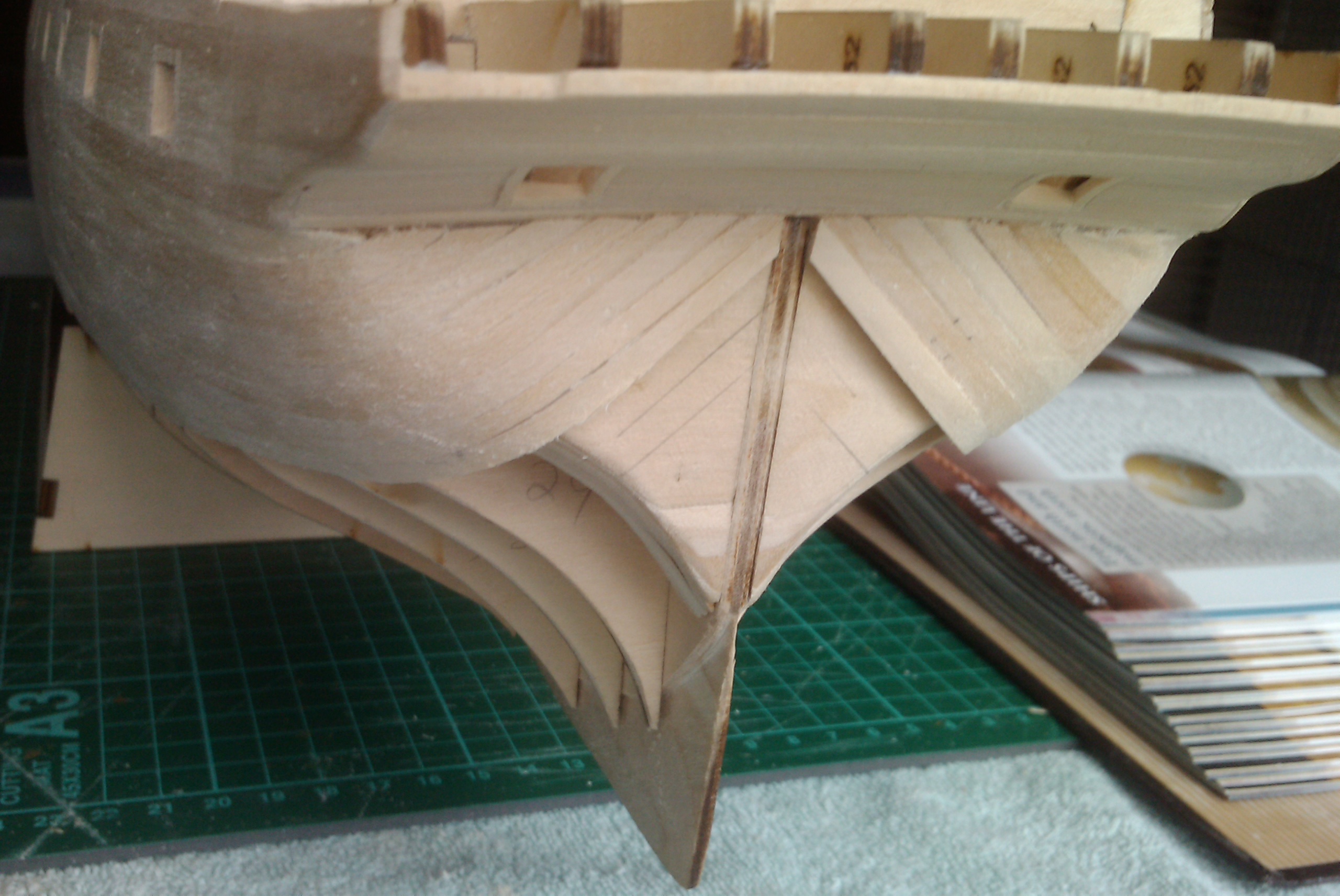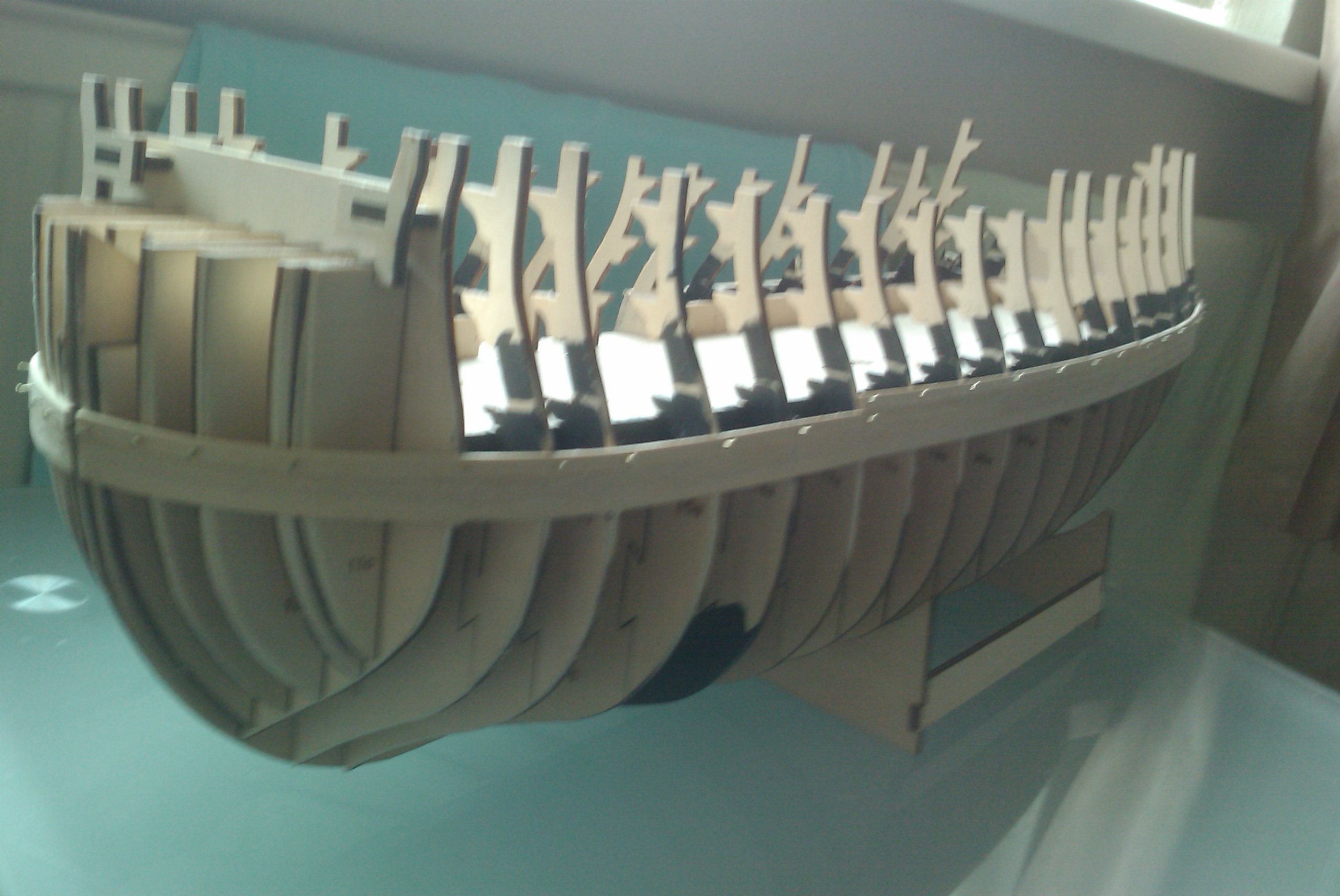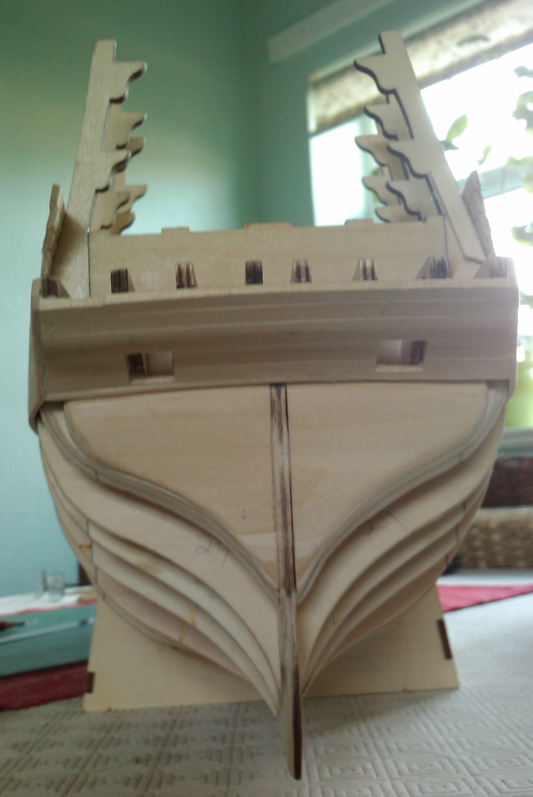 Now that i am half way more or less in the build i thought i would share it with you. I had a few problems with the planking of the bow to start with but after stripping several rows off and fairing some more i eventually overcame that issue. I have found that as i have progressed i have gained confidence in overcoming obstacles and trying things a little for myself. For instance, due to the invaluable input from other members,without which this would have been a long , hard and uphill struggle, i put window frames into the quarterdeck partitions to give them a more realistic look, and also put rope on the ships wheel feeding it down through the deck. Cant remember who posted this but thankyou.