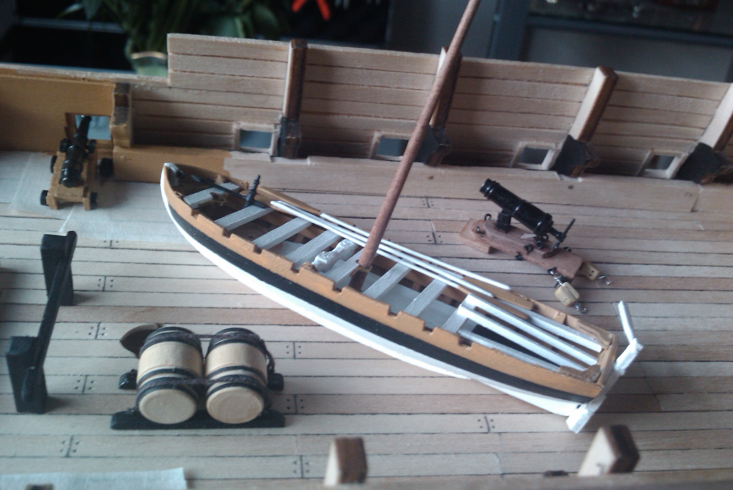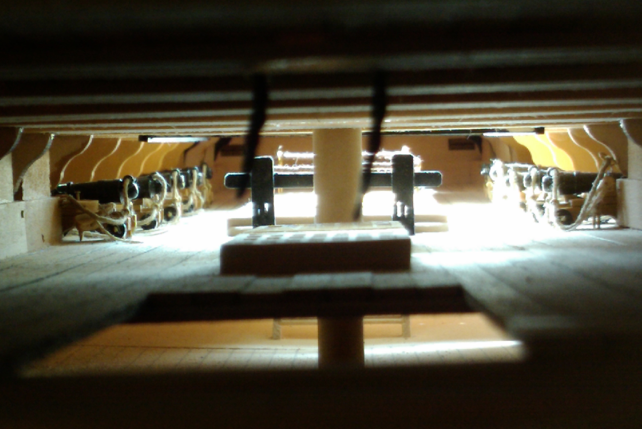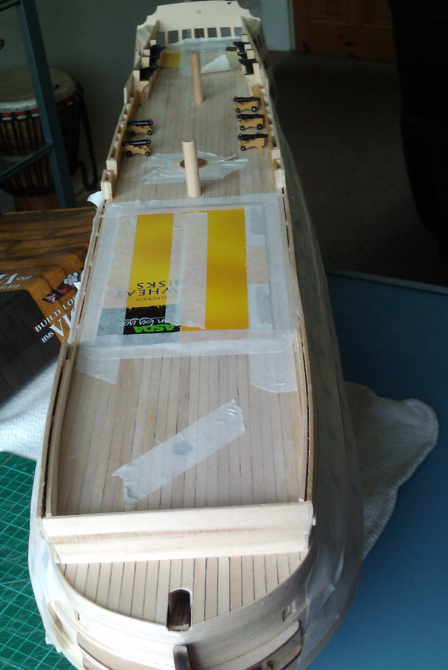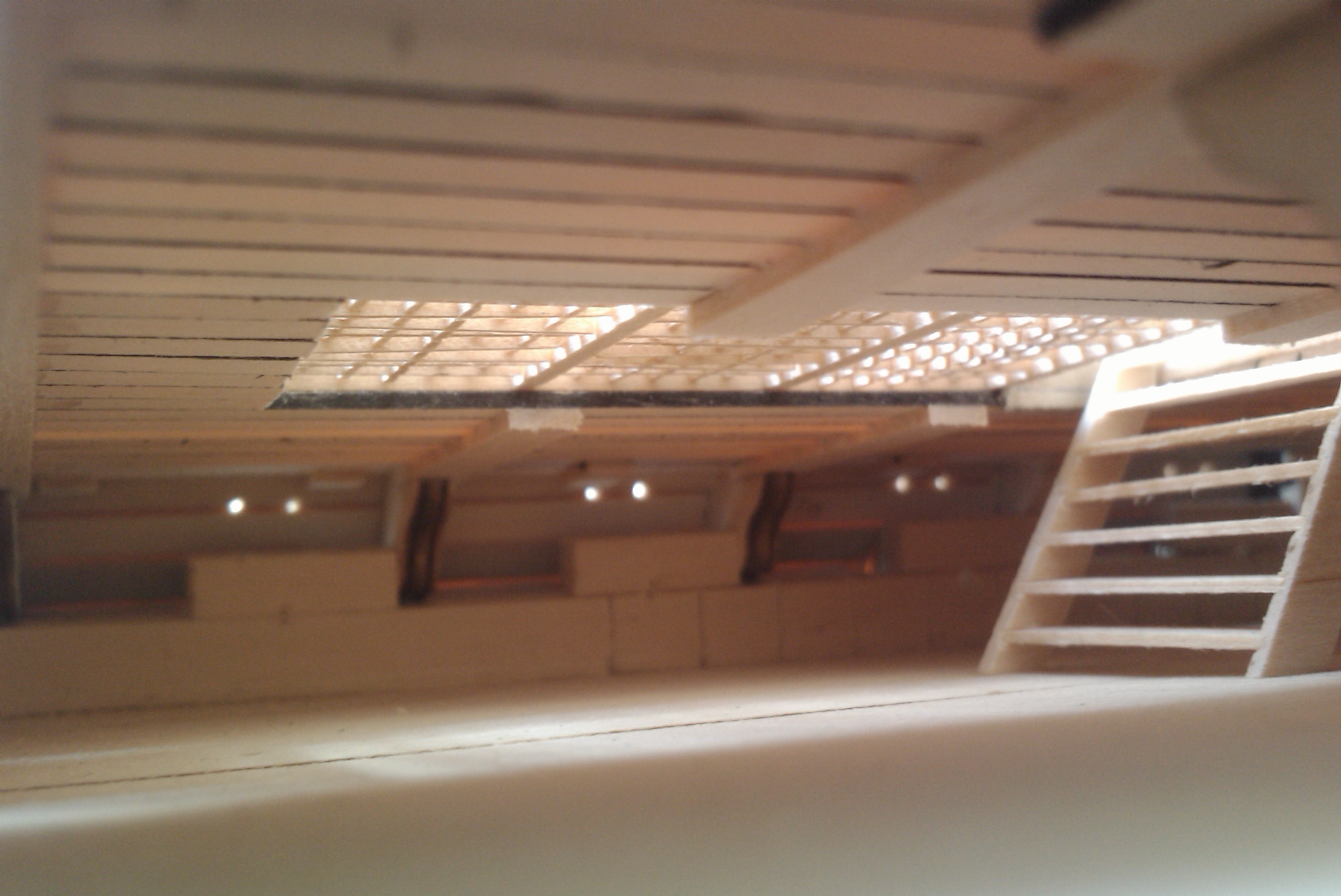 Now that i am half way more or less in the build i thought i would share it with you. I had a few problems with the planking of the bow to start with but after stripping several rows off and fairing some more i eventually overcame that issue. I have found that as i have progressed i have gained confidence in overcoming obstacles and trying things a little for myself. For instance, due to the invaluable input from other members,without which this would have been a long , hard and uphill struggle, i put window frames into the quarterdeck partitions to give them a more realistic look, and also put rope on the ships wheel feeding it down through the deck. Cant remember who posted this but thankyou.