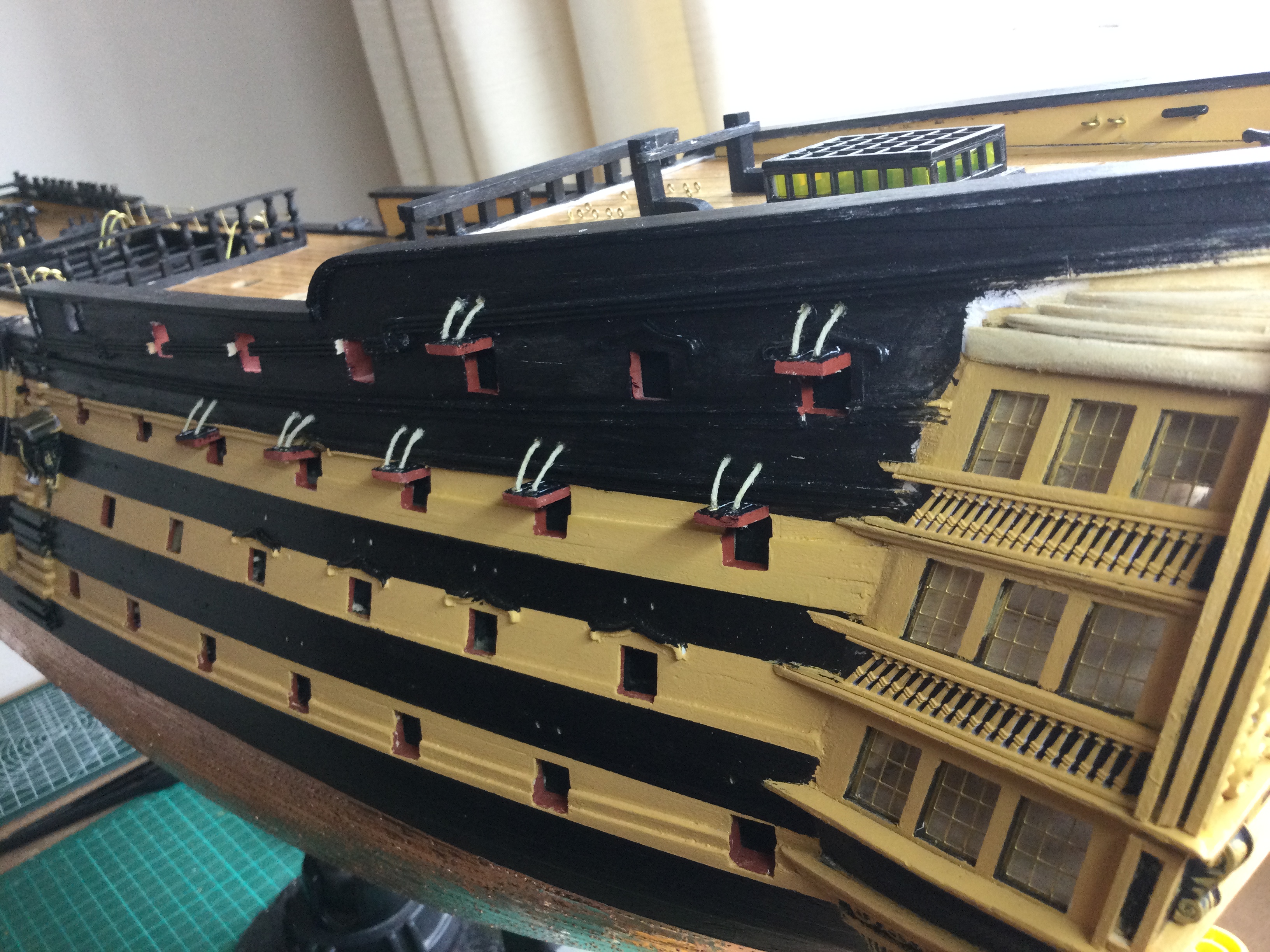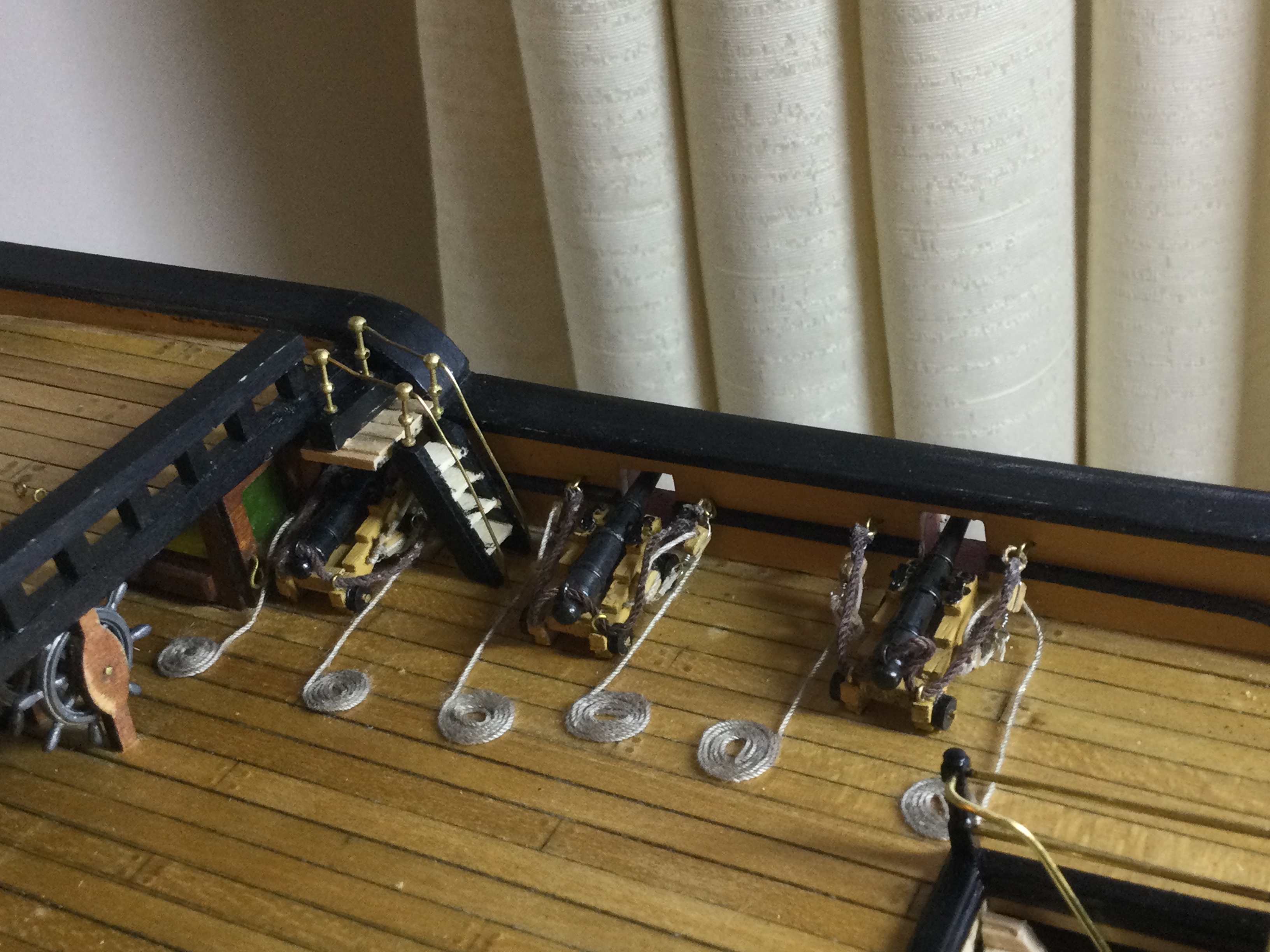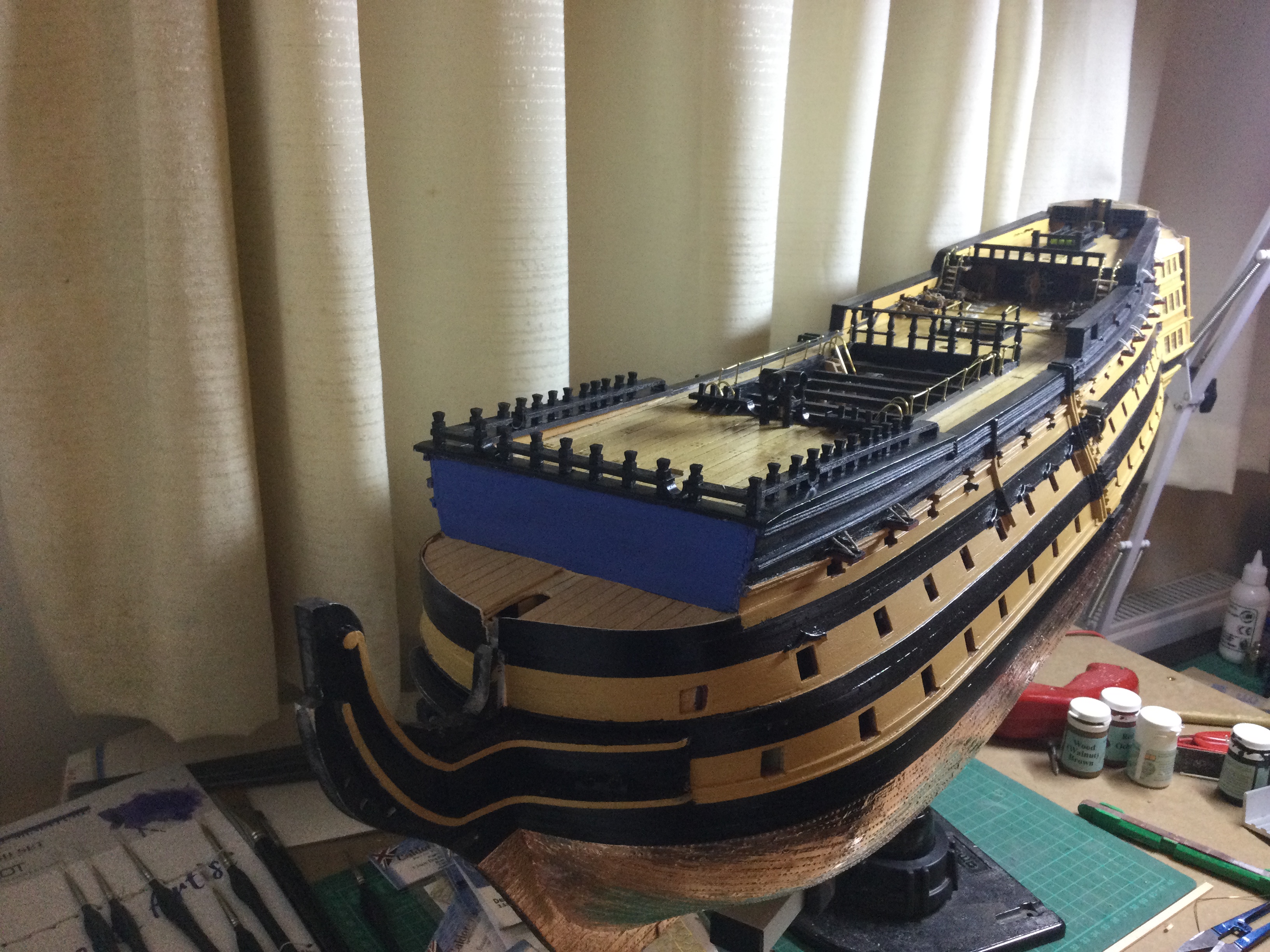 I am back at work again, so with the summer months approaching the build will be at a snails pace again, but I have enjoyed the last 10 weeks solid building on the victory. I have just reached issue 85 and will delay the beakhead until I have made the bowsprit and gammoning as I have gone for the upgraded resin printed curves. just a few pics sorry I tried resizing a few but they still don't show I will look at it again some time. I have added the Roman numerals to the water line on the bow and stern.