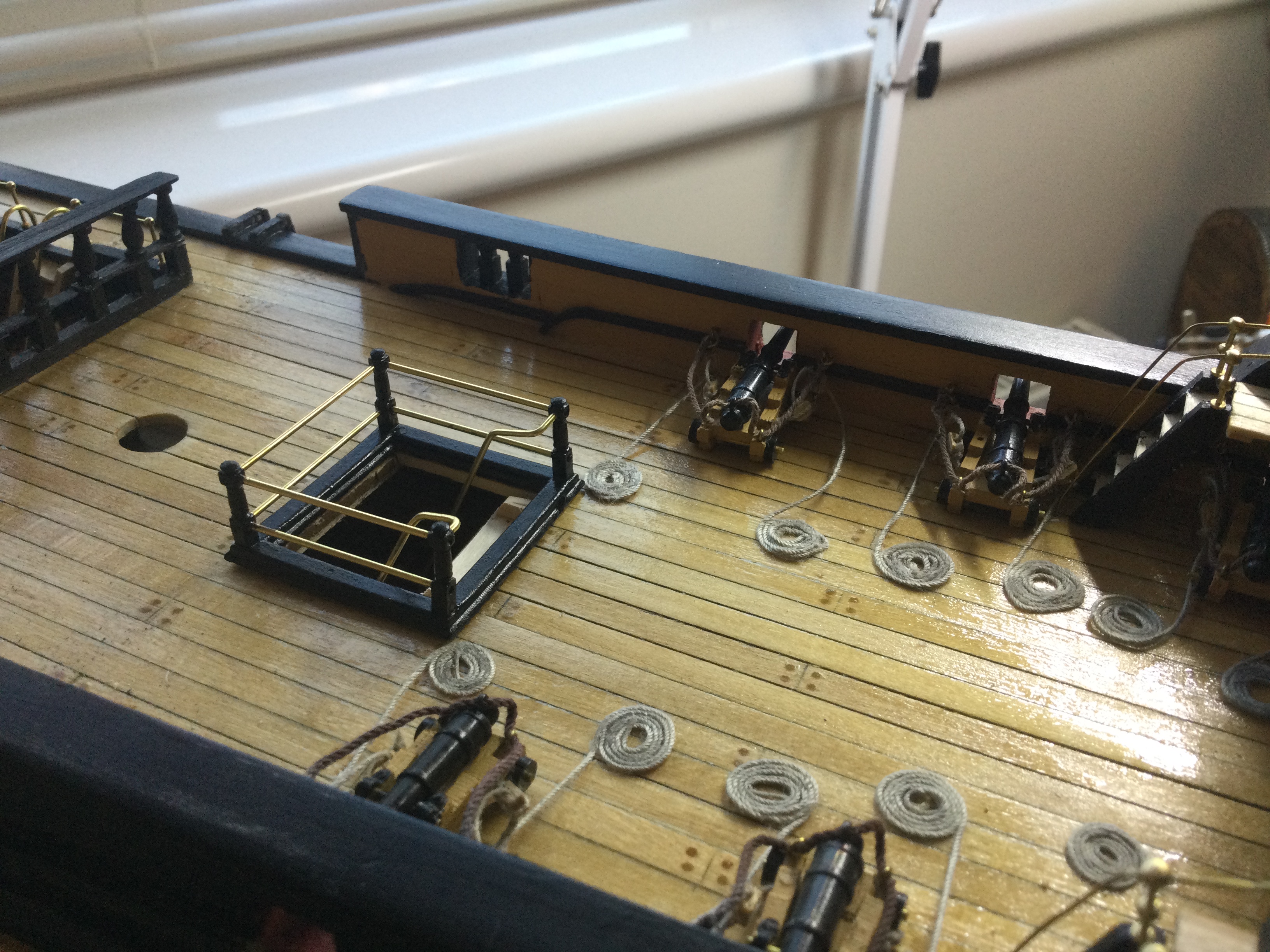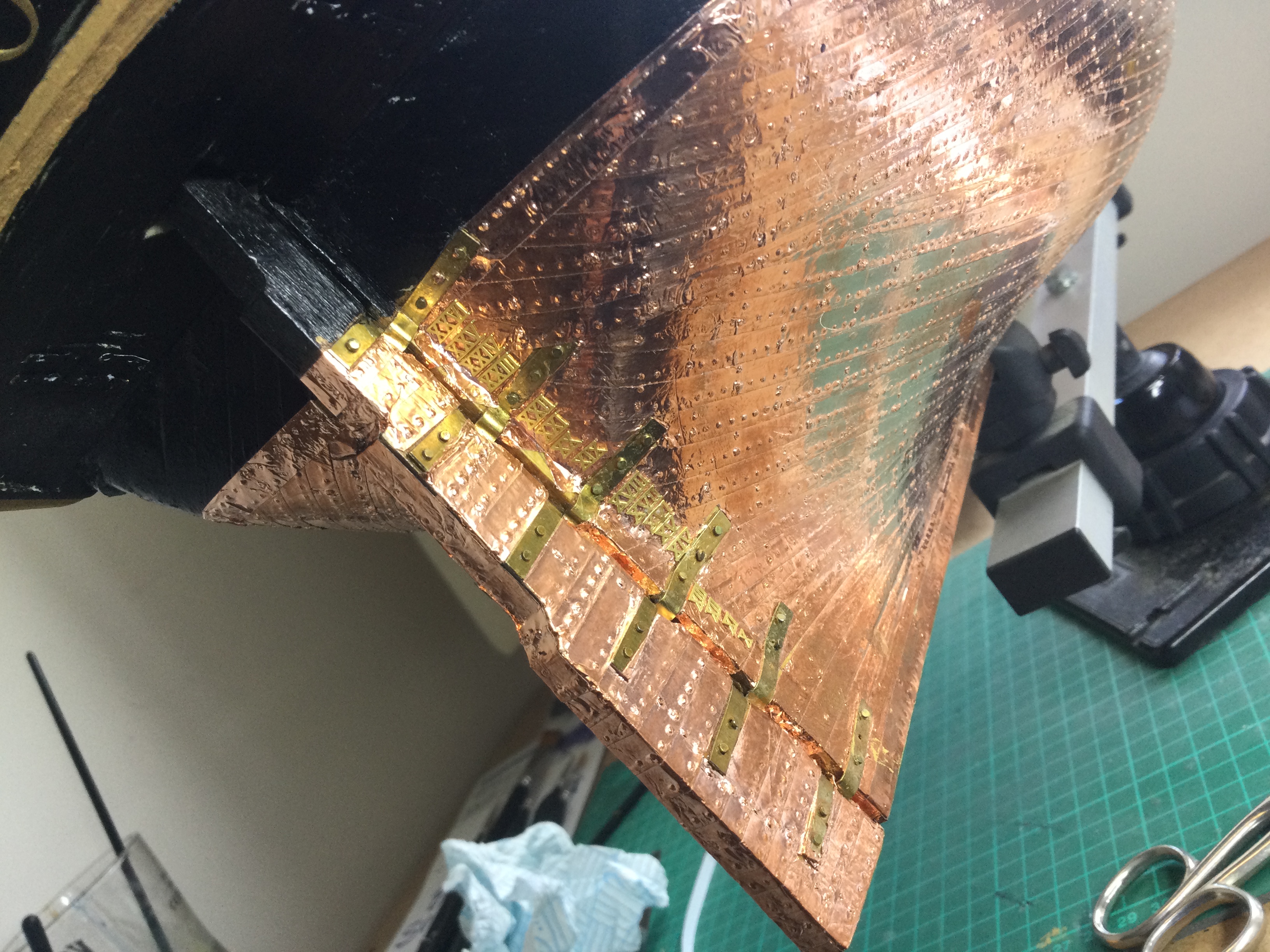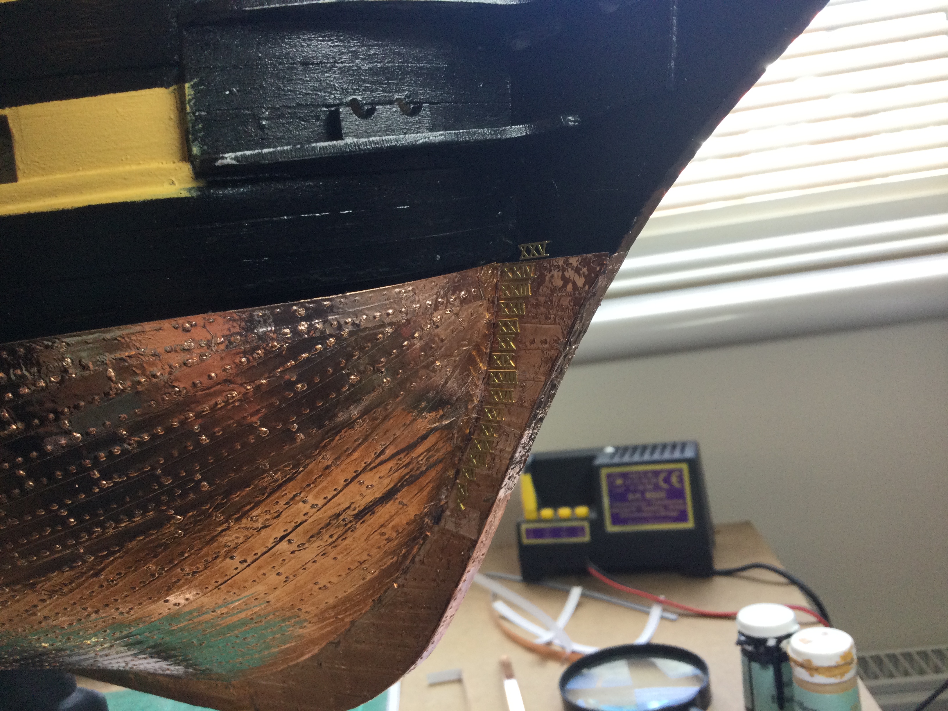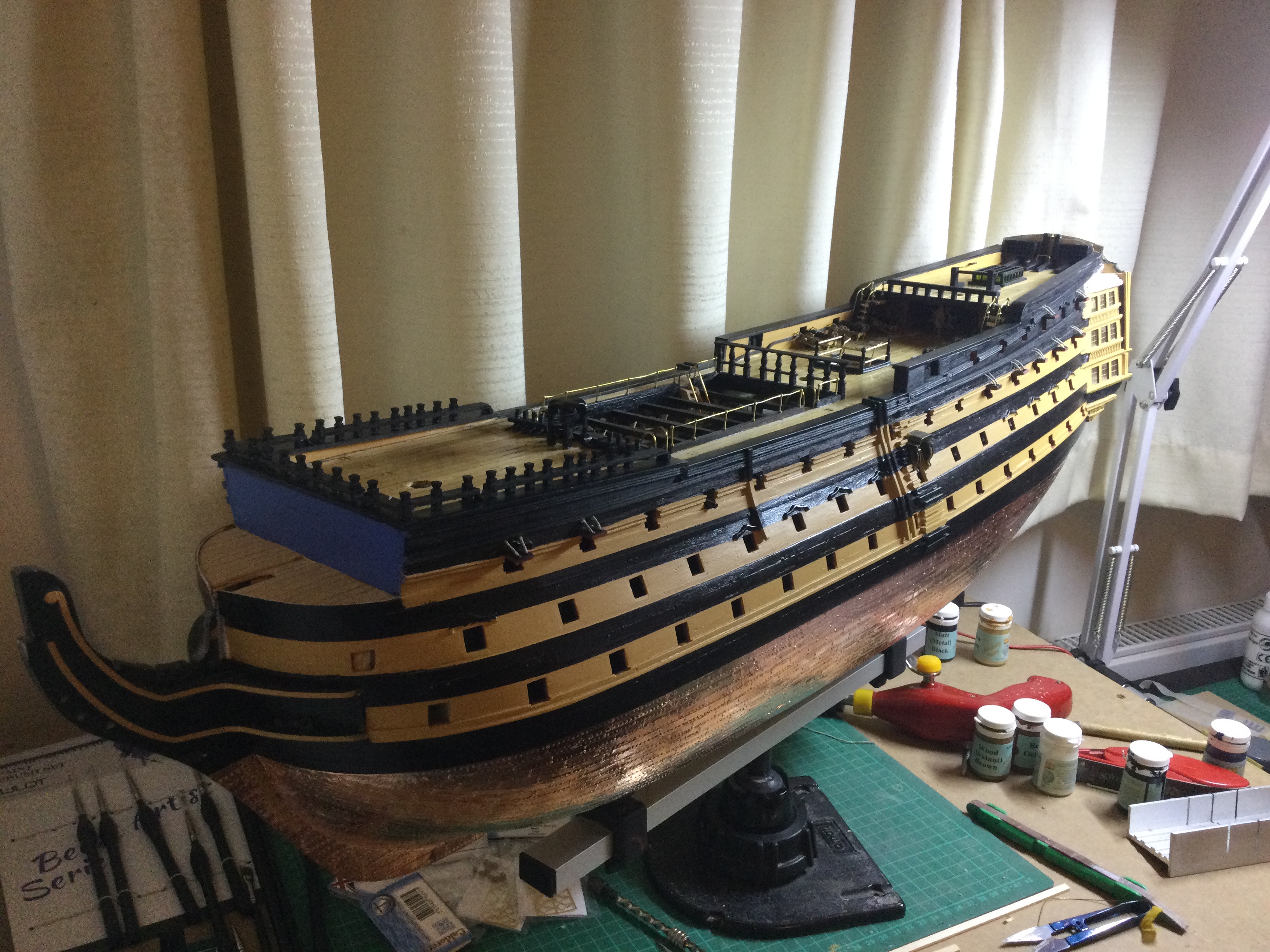 I am back at work again, so with the summer months approaching the build will be at a snails pace again, but I have enjoyed the last 10 weeks solid building on the victory. I have just reached issue 85 and will delay the beakhead until I have made the bowsprit and gammoning as I have gone for the upgraded resin printed curves. just a few pics sorry I tried resizing a few but they still don't show I will look at it again some time. I have added the Roman numerals to the water line on the bow and stern.
