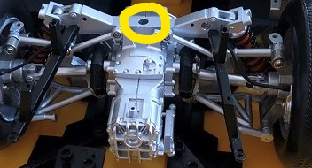 So what I did was drill through the plastic top cover in the existing hole and through the metal transaxle case with a .085 drill bit and insert a M2.5x8 allen head self-tapping screw into the hole to secure the crossmember to the transaxle.