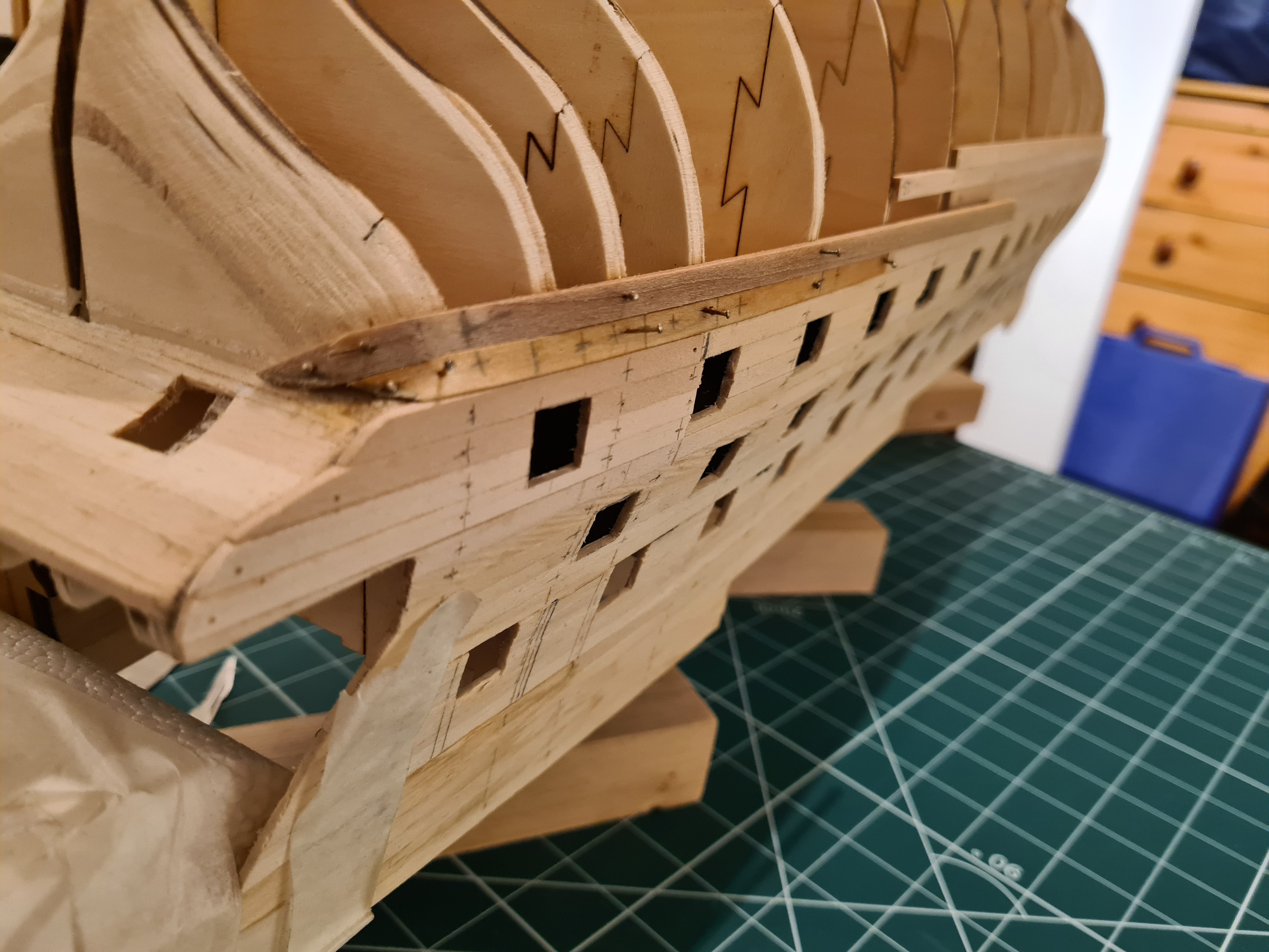 Finally all the canon ports are cut out. Now its time to complete the planking which im dreading to do on the bow and stern... Building. HMS Victory..... Corel Albatross 1840......Completed Hindenberg Zepplin museum piece..Completed Artesian Latina Sopwith Camel.....Completed Bismark.........