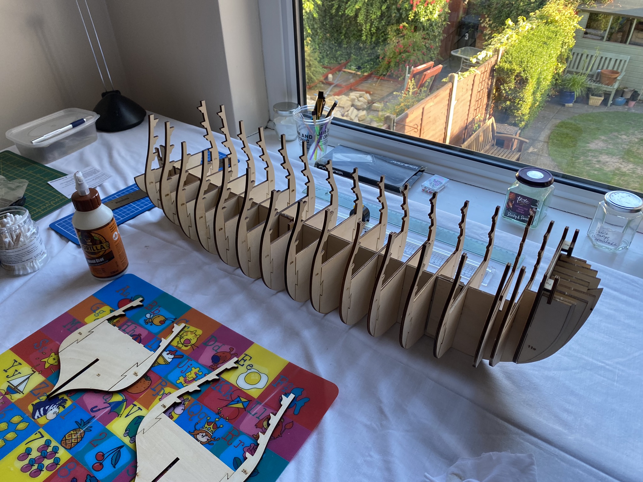 I have also fixed the keels three sections together flat, with a weight on top, and it seems to nice and level. And I have assembled it all, without glue, of course.