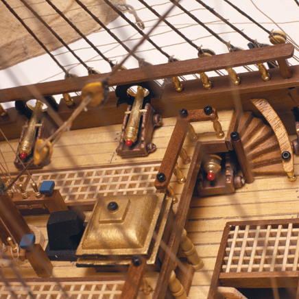 The kit features a double plank-on-frame hull construction, plywood framework, pre-cut gun ports, burnished metal gun barrels, cannon carriages and gun port frames, cast metal transom detail, hardwood masts & spars, brass beakhead rails & fittings, blackened metal anchors, turned brass pillars, stitched sail set, silk screened flags, assorted rigging threads and a pin-pusher tool.