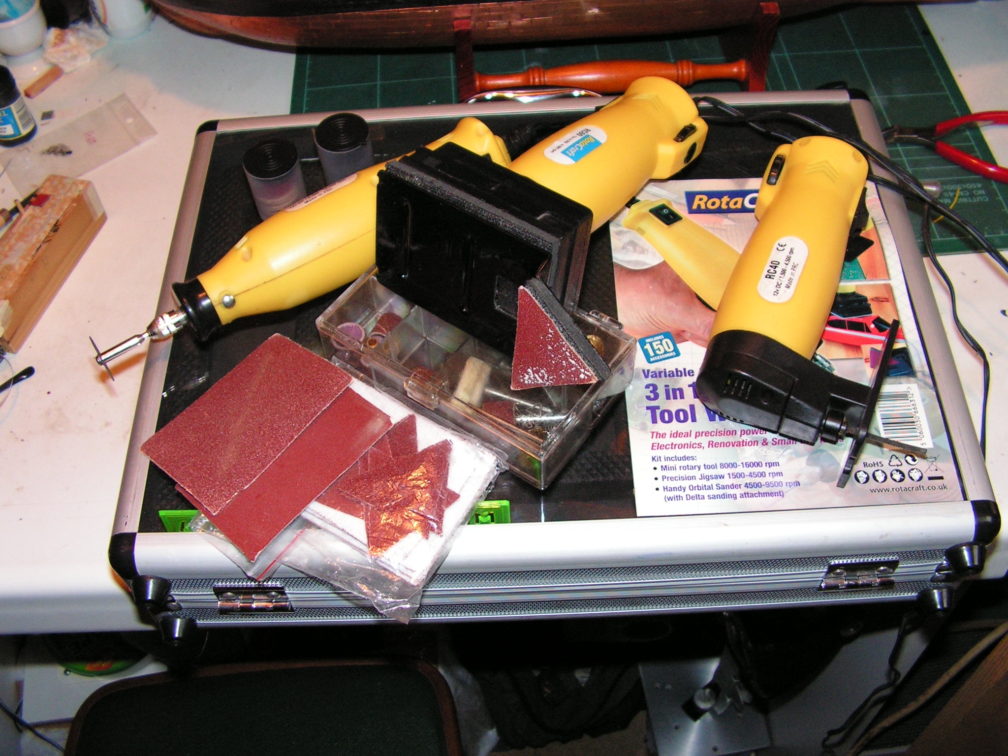 I have used the rotary tool for all the usual tasks and also the sander for finishing the hull and shaping the ribs. I haven't used the jigsaw as much yet but that will come in to its own once I start on the fighting tops.