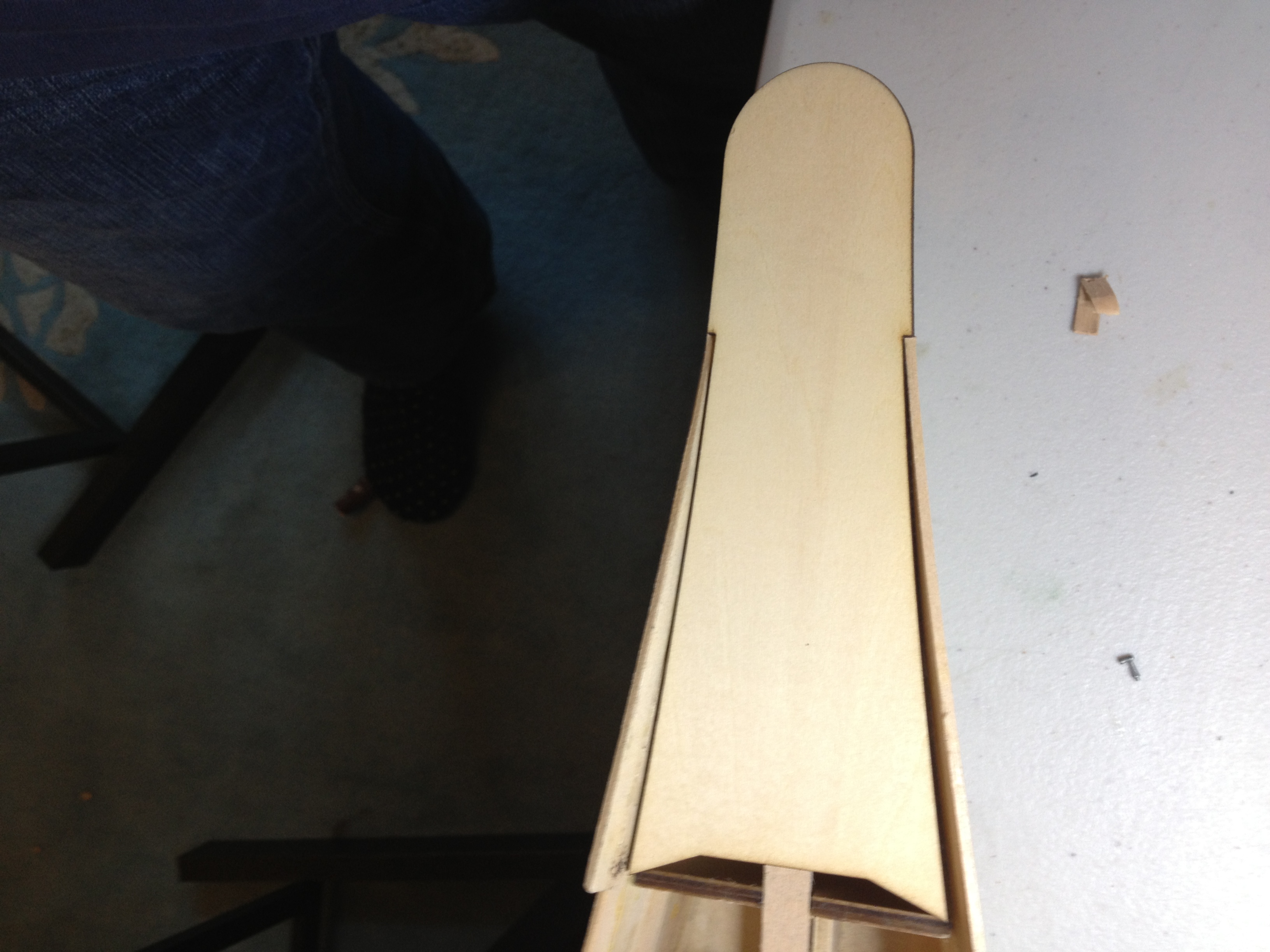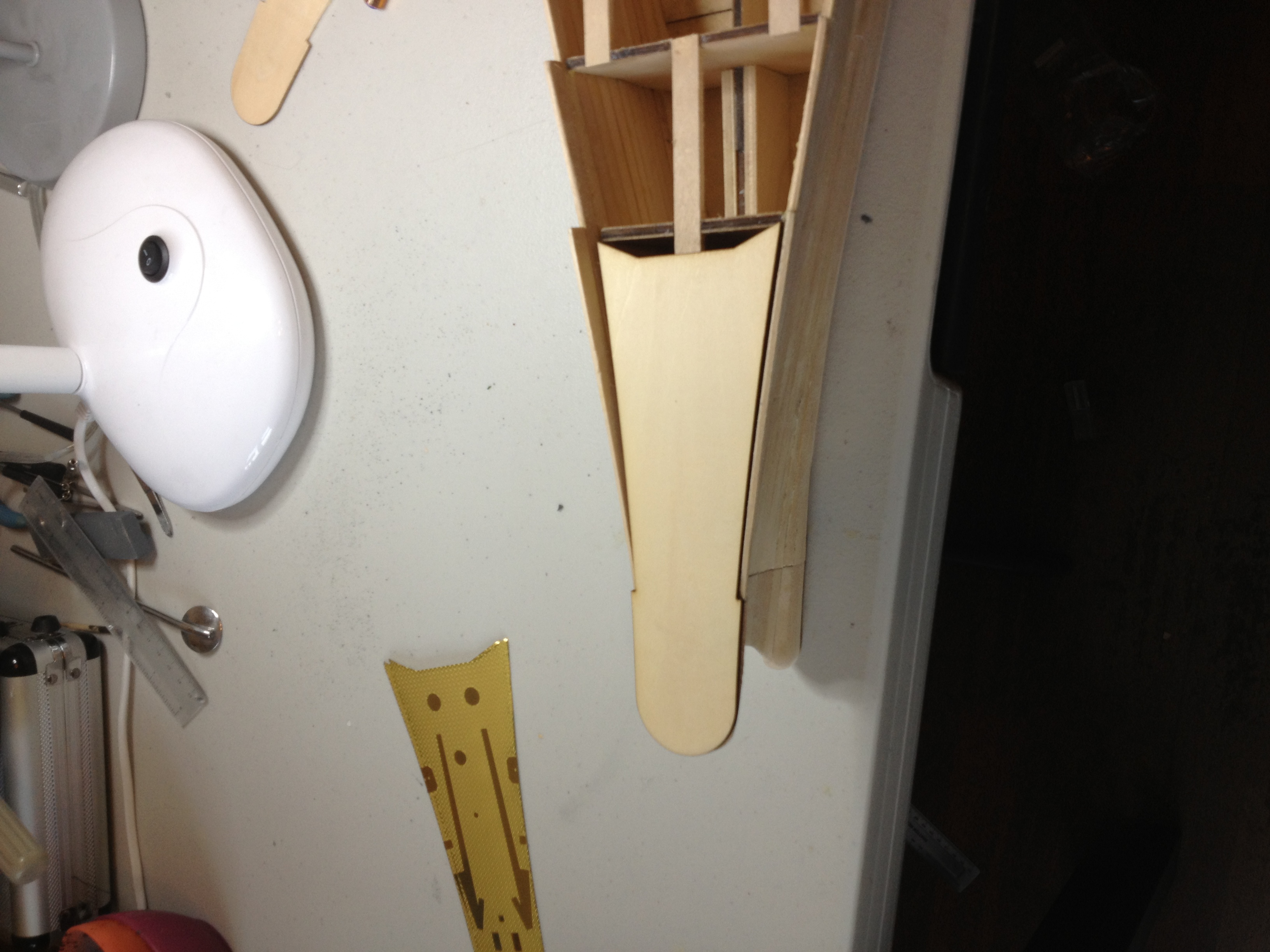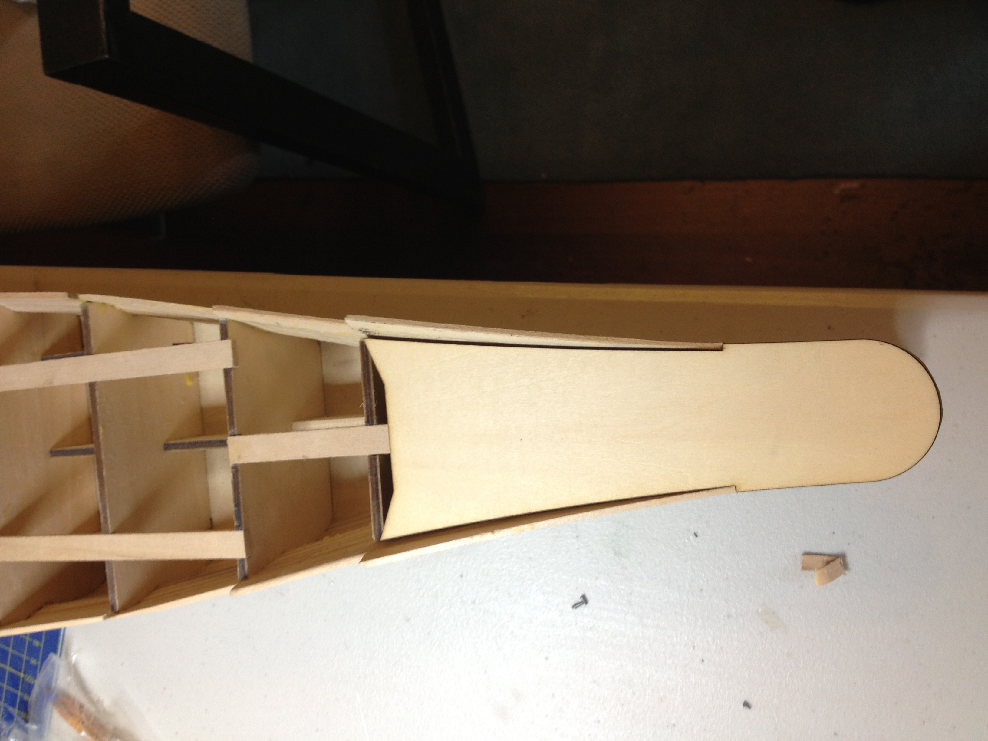 the strakes when fitted to the bow are built up to be higher than the hull formers because of the curve from bow to stern,after the horseshoe [part 8] is fitted and sanded back to the profile shown you can dry fit or glue the wooden bow deck to the hull and then sand back the strakes so the meet the profile of the deck piece [part 6].Just be carefull here when sanding back and try to keep the strakes square to the deck part so the etch deck fits properly.