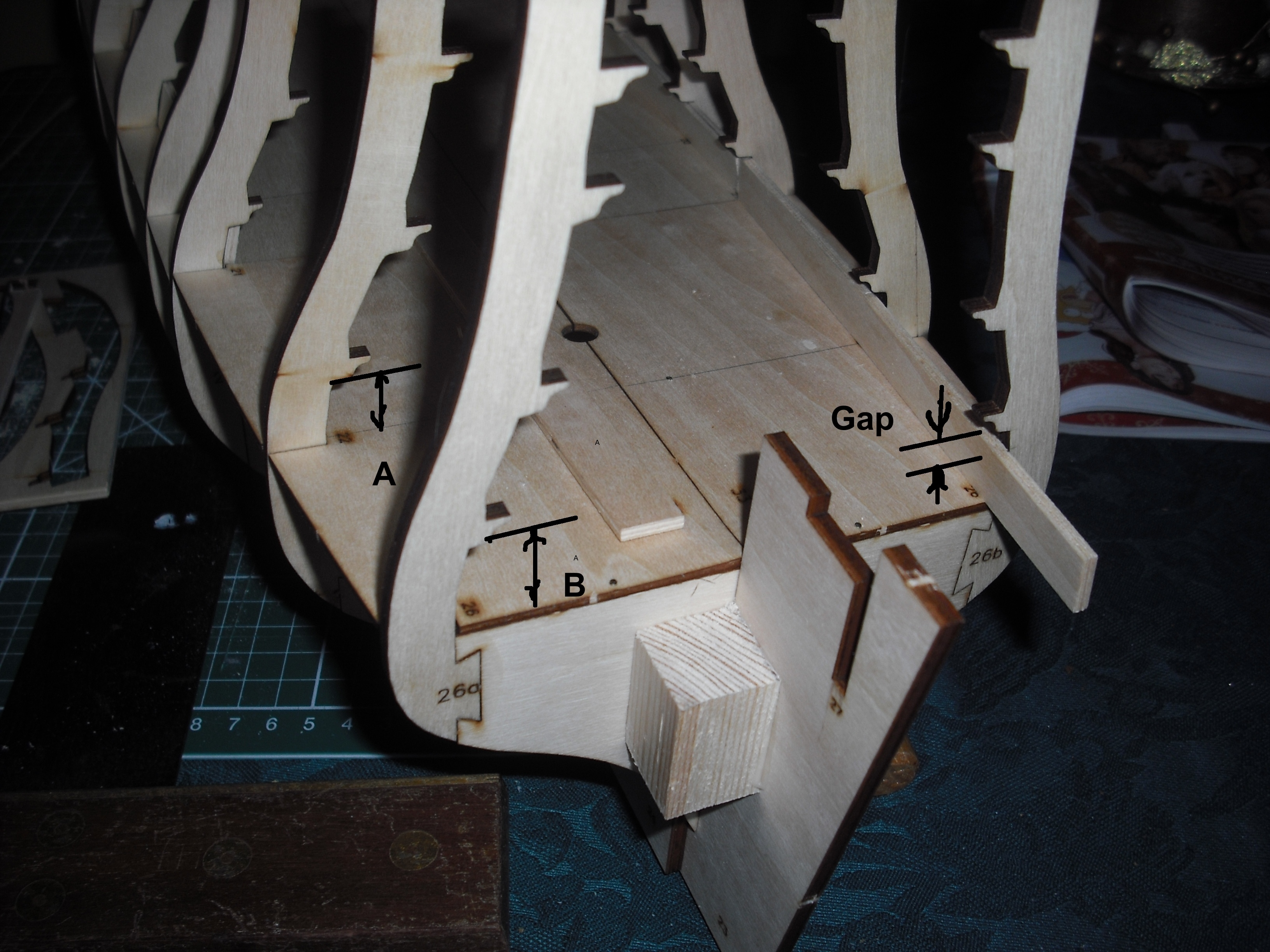 I have attached a photo of the rib frame concerned. I have marked it up showing the distance between the deck and the first deck support on rib 26 (marked as B) and rib 22 (marked as A). You can see that B is noticeably bigger than A resulting in a gap once the 3 x13mm strips are fitted. I hope this makes sense now.