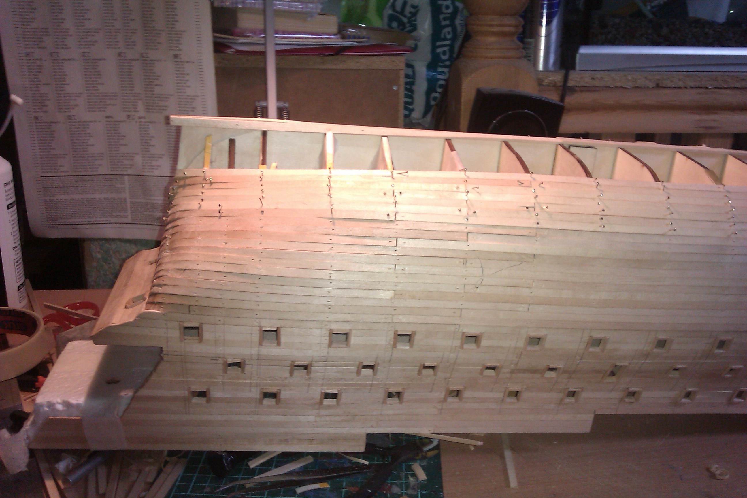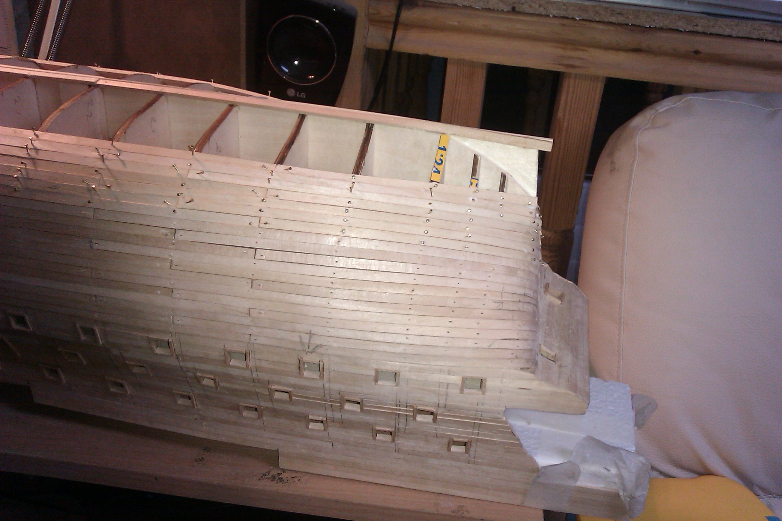 Have fun cal, just finished lining mine...I found it easier to line the left hand side of the ports, then right, (port and starboard) followed by bottoms then tops...took me almost a week, but looks a lot better...Now the lower hull planking...this is where the cursing will start!!...