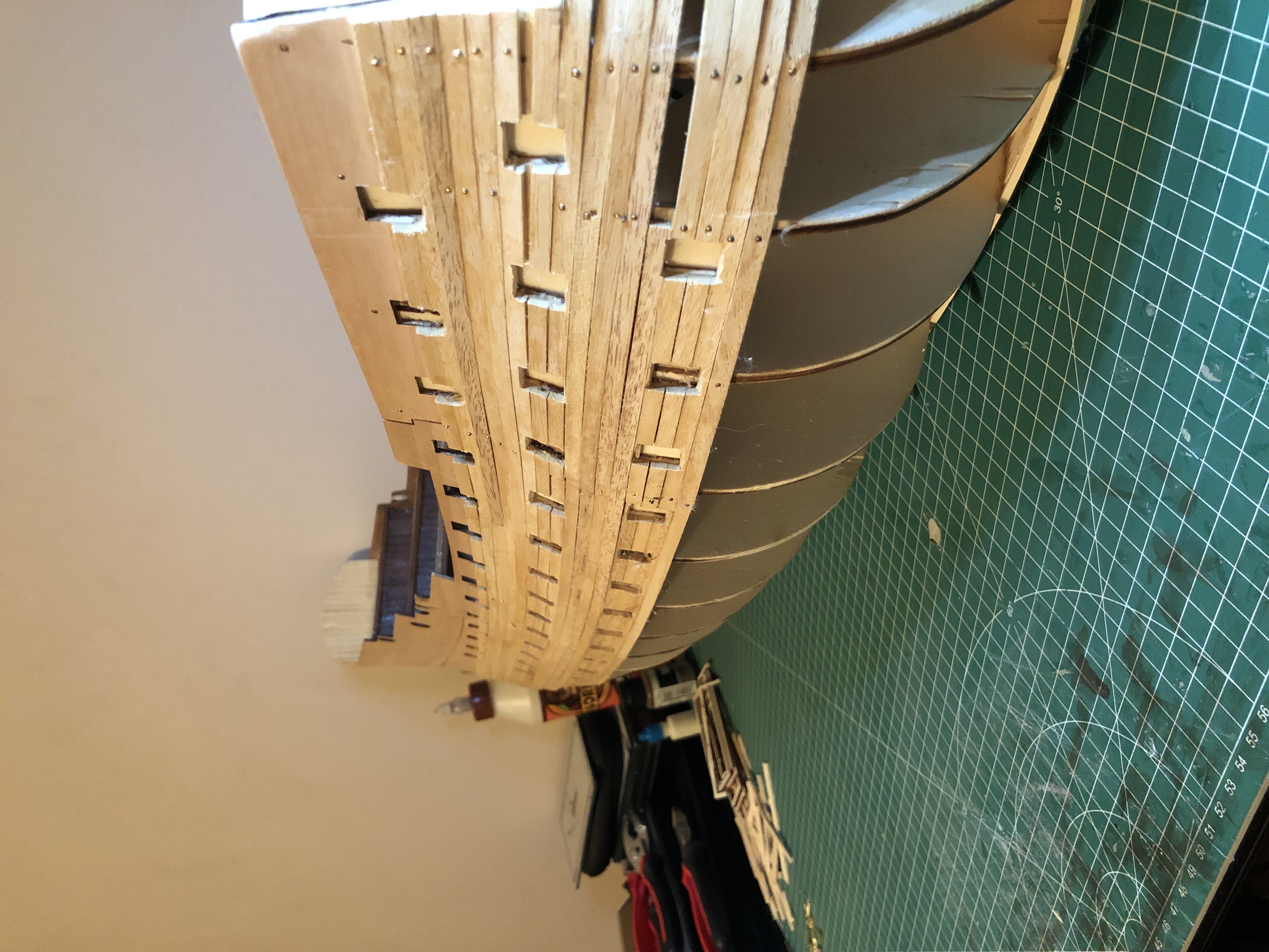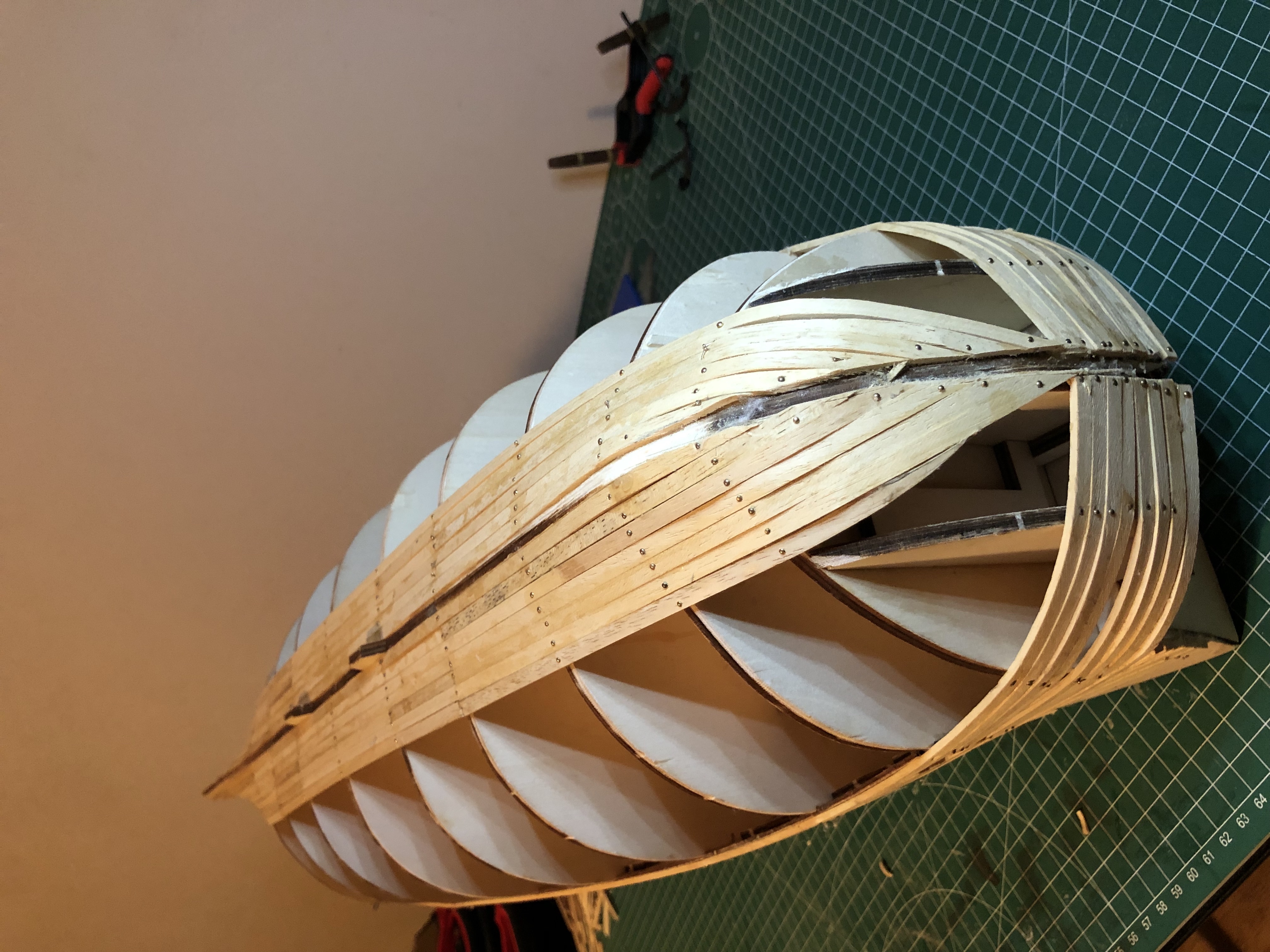 As you see the last plank on the port side is my attempt of trying to correct the mistake, and I'm planning to go like this until I should have finished the bow space to the upper planks. I hope this makes sense.
