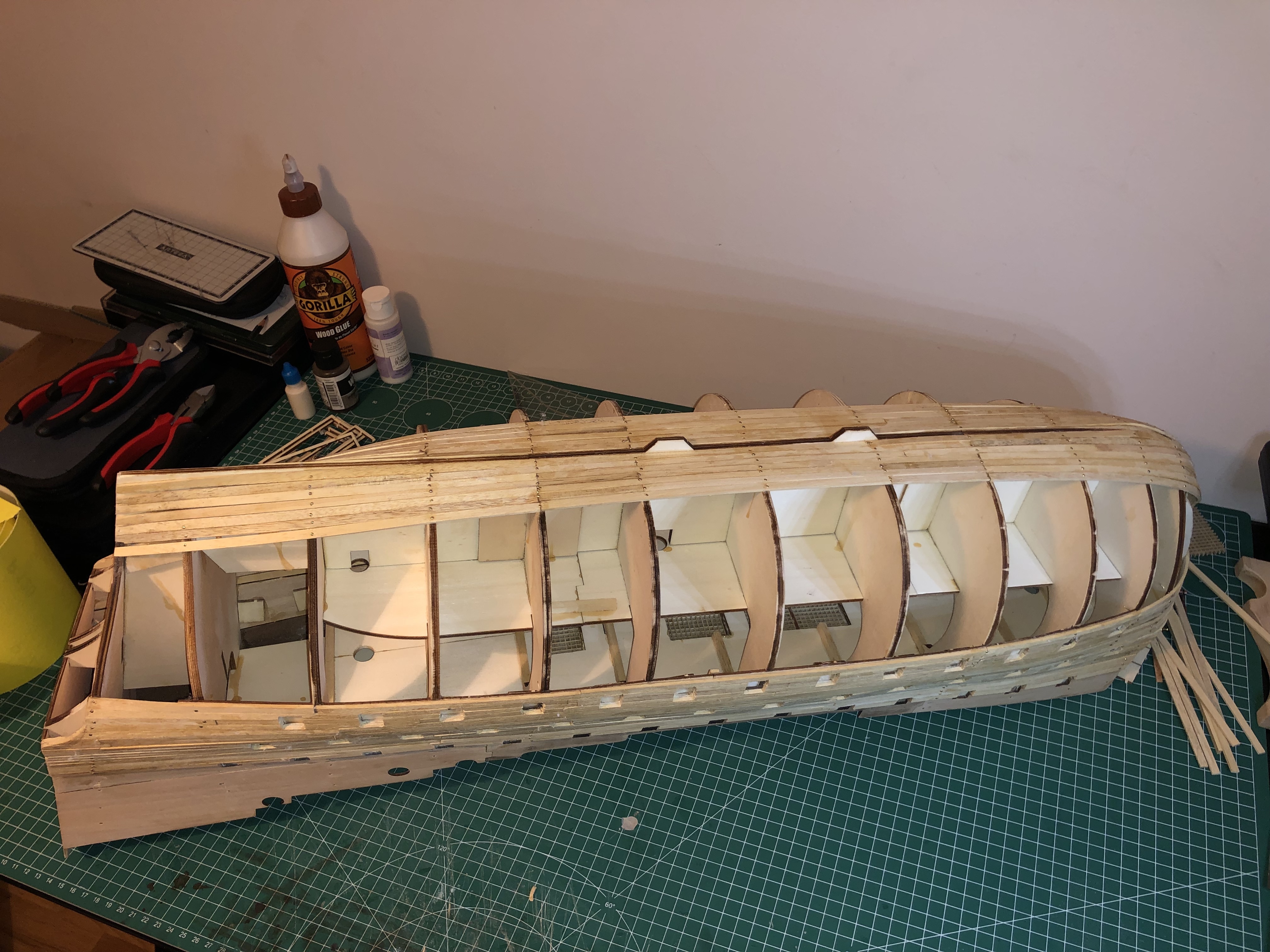 I have also started my second layer and I am struggling a lot because I don't know exactly what glue to use. I have started with gorilla supper glue which I find quite messy, and it is getting dry extremely fast. I have also bought this Gorrila Clear Glue from amazon, but it is drying in about 24h completely, and it is not sticky enough for the bamboo planks to stay attached, especially at the corners where a stronger grip is required. I have done about 6 rows of planks on both sides and I found it so frustrating. I've been looking at the official build video and I don't know what glue he is using because the planks seem to stick like a charm, so I decided to abort working on the planks until I figure out how to proceed, without risking to ruin the built. I will come with an update of the second planks tomorrow, so that you can get a better idea of what I'm talking about.