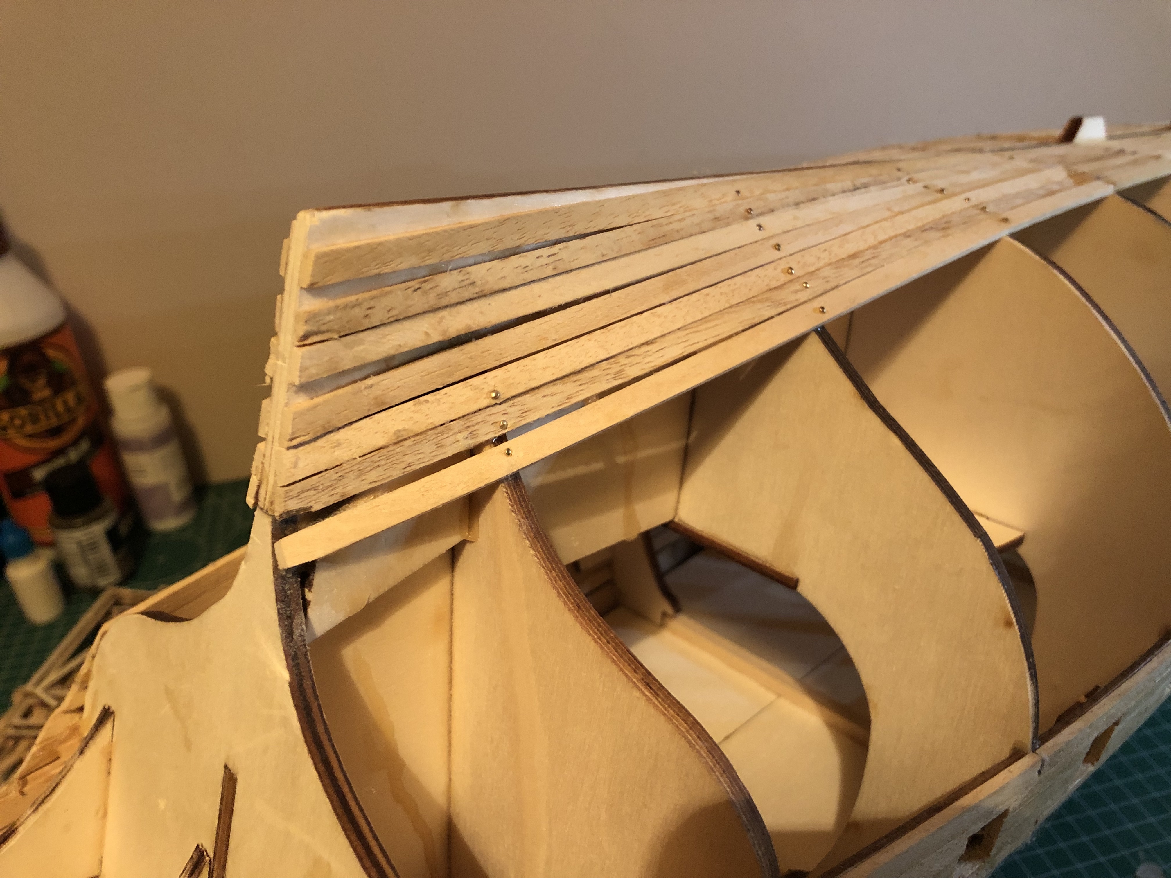 BigGrin Hi Oliver the glue I used was Evostick White PVA wood glue. I think the official build use contact adhesive the trouble with that glue is you only get one chance of getting it right . I always curve my planks so they sit right.