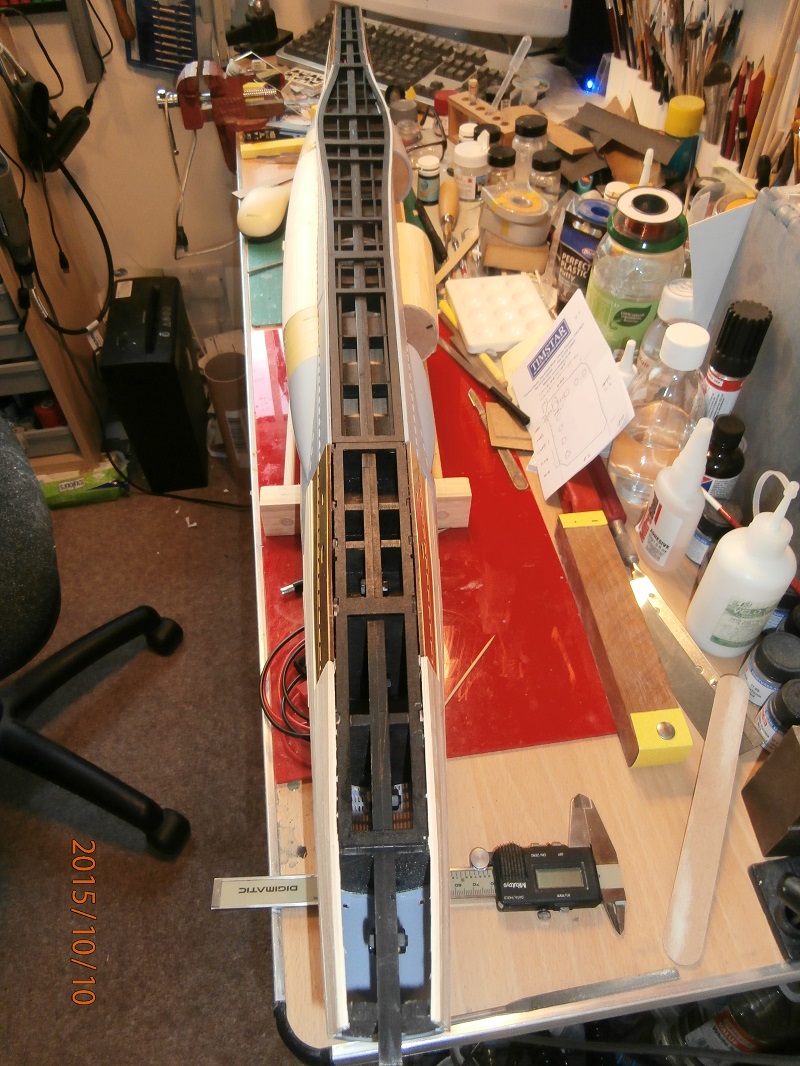 Well done Graeme, it's coming along nicely now. Good to see the front and back end mouldings finally getting built. I have the same problem as you with that protruding piece of the framework at the end of the hull. Had to file seveeral mm's off it before the plastic stern part would sit right. Happy building David
