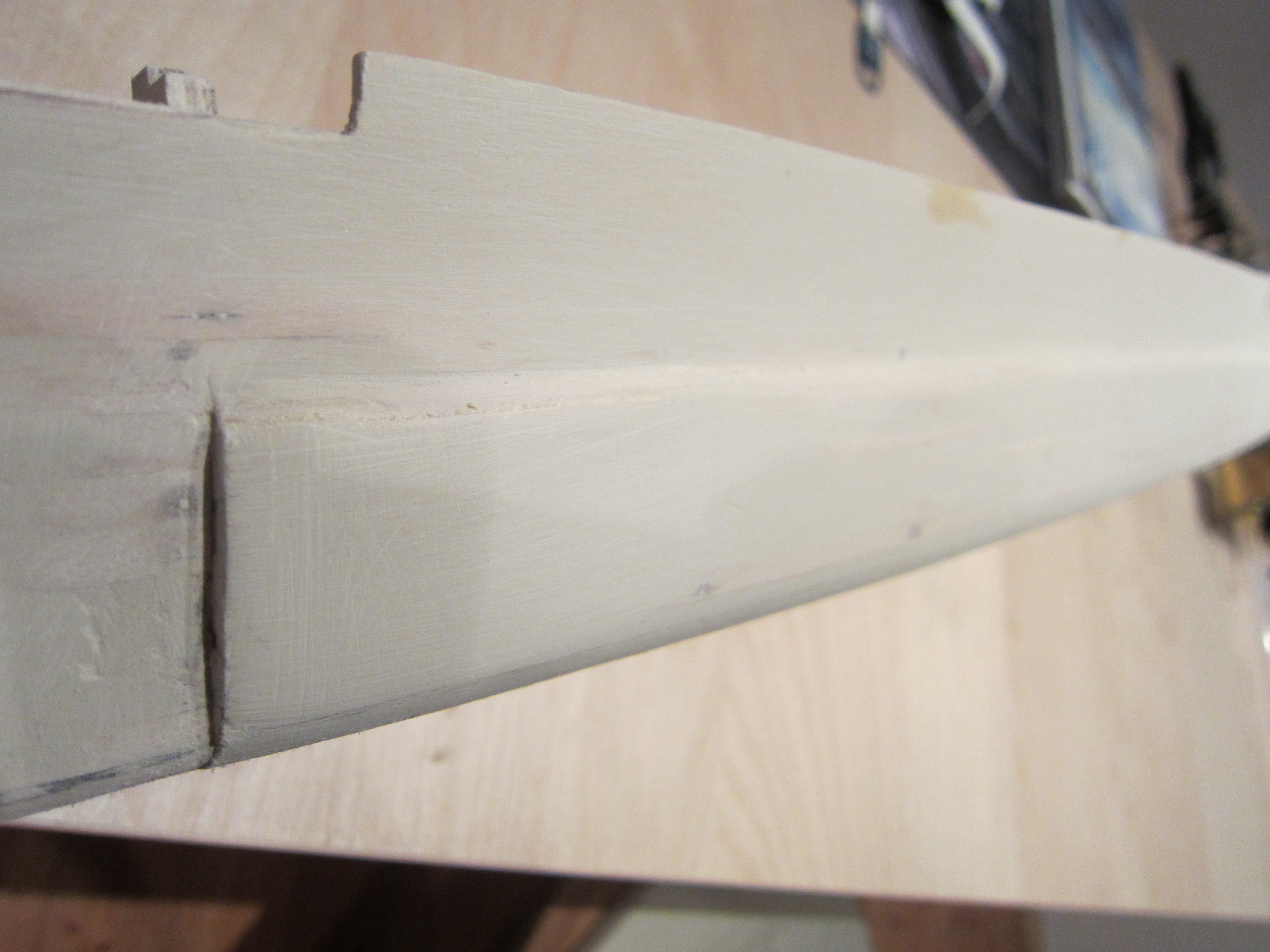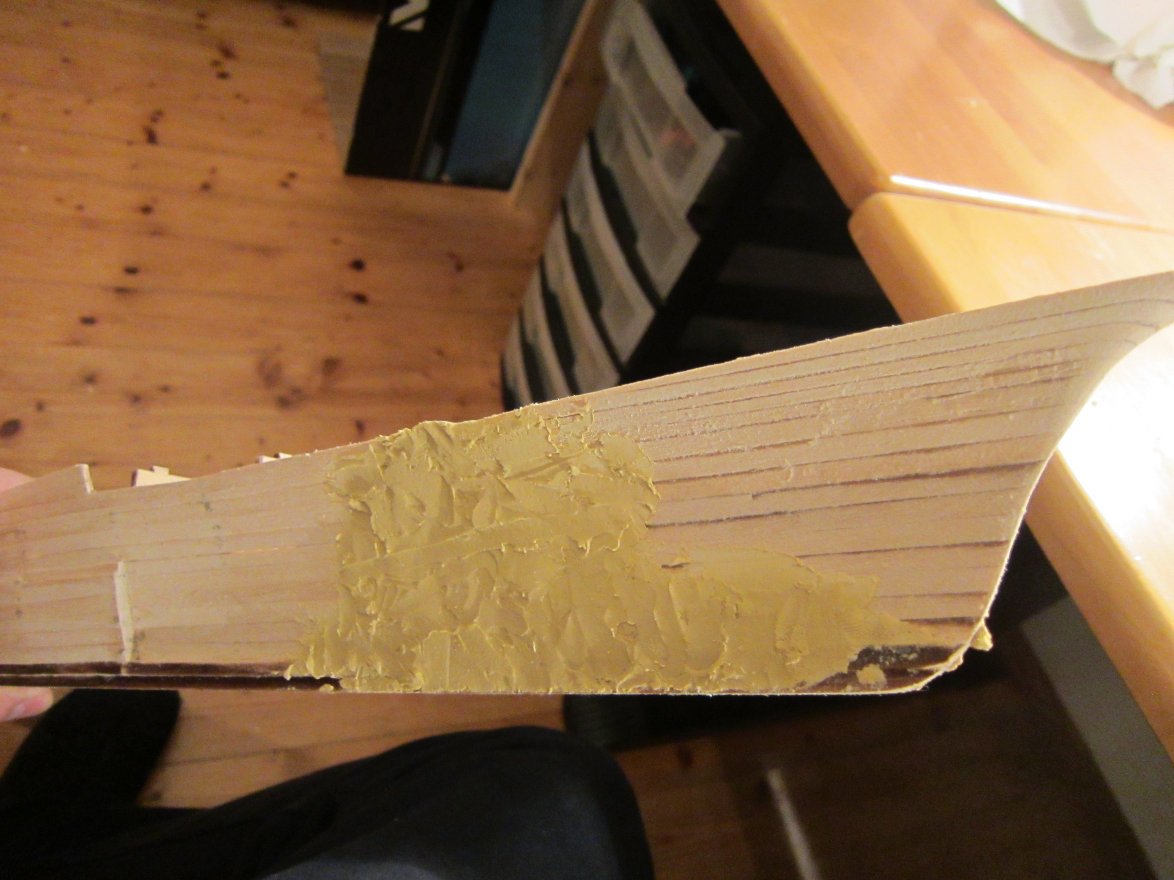 I don`t know if one can see much on these pictures - but this is the result of the first turn of filling and sanding the hull on the port side with a 60 sanding paper.