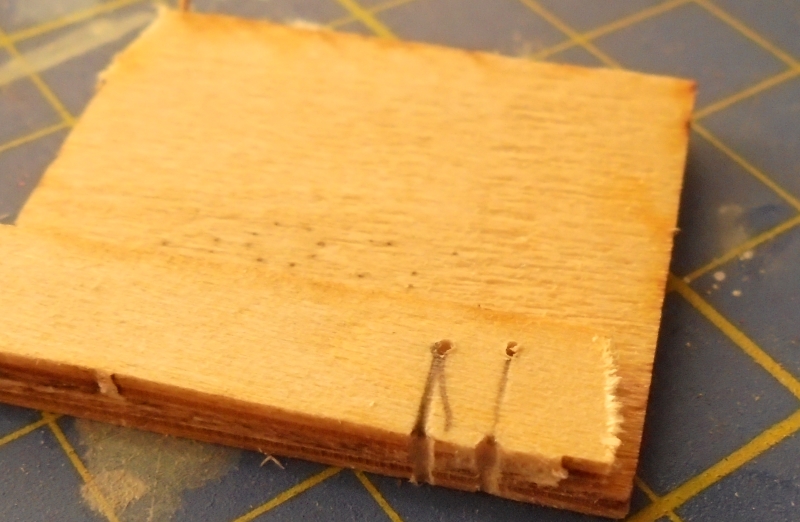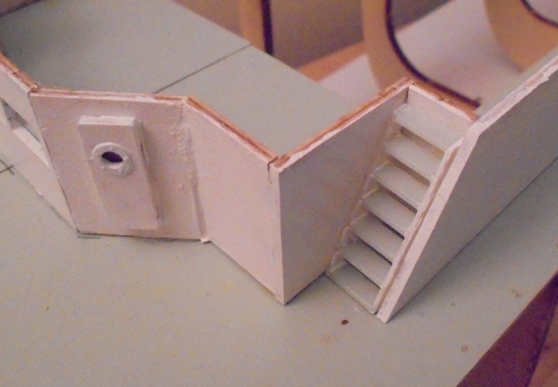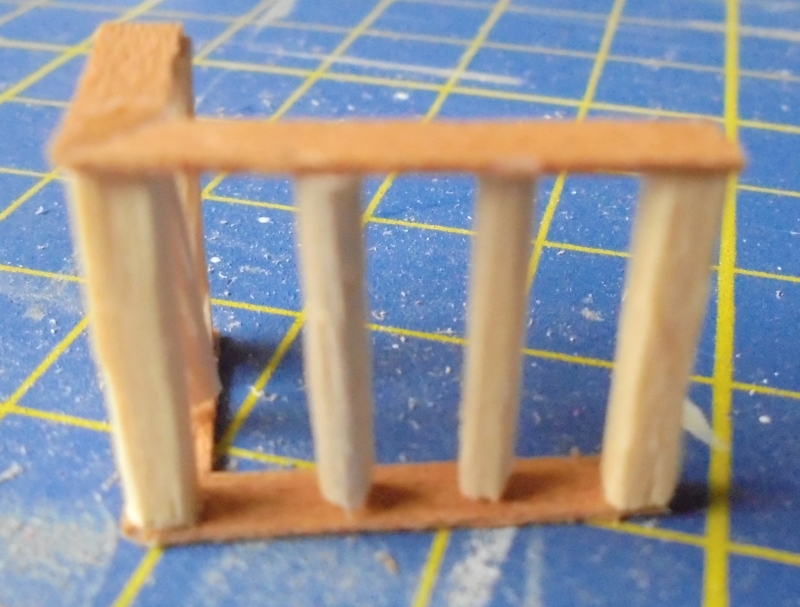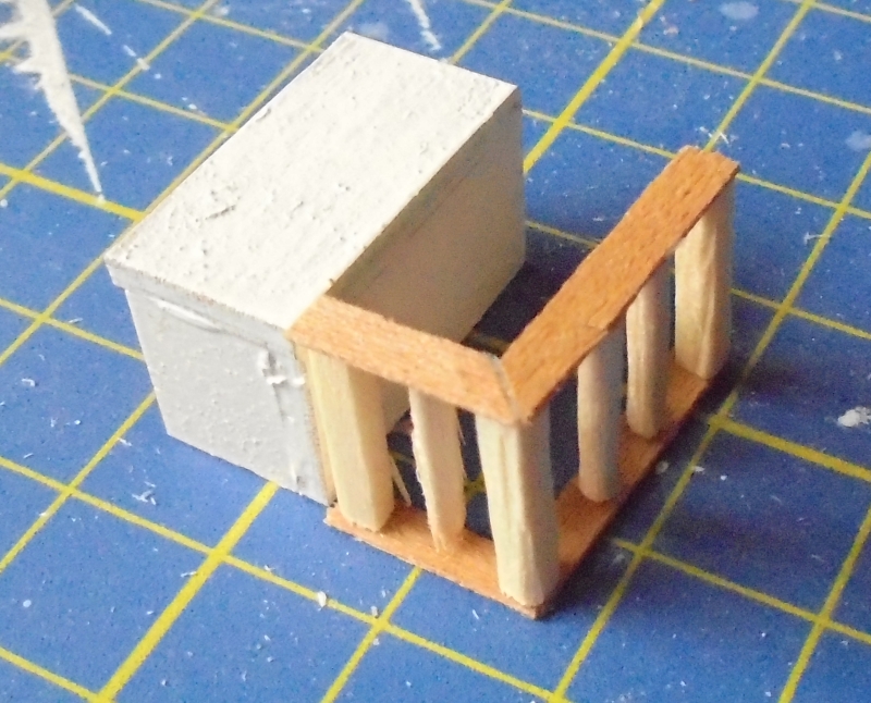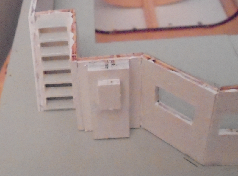 There is an opening in the wheelhouse floor that requires a banister rail, I used three sections on a matchstick for the corner and endpost and pieces of cocktail sticks for the other posts.
