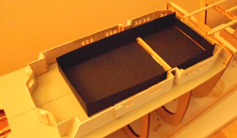 Because I didn't paint the inside of the lower cabin I didn't want to be able to see the unpainted walls on the other side of the ship. Using some black card I made a tray that would fit inside space. If I don't like how this looks when the model is complete I plan on removing it.