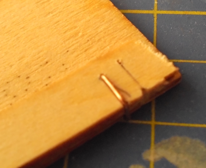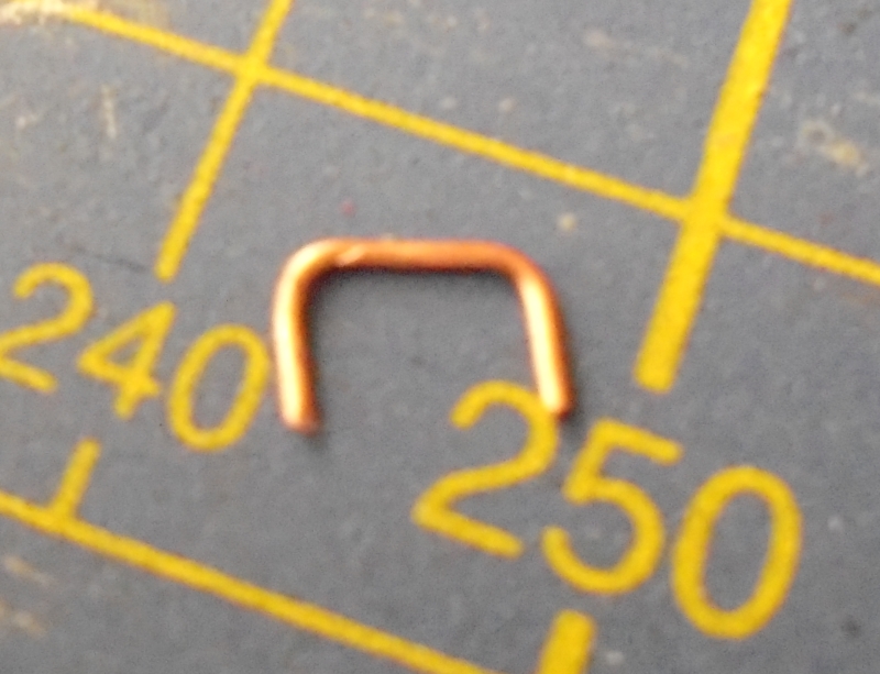 One end of the wire is pushed through the hole (trying not to spear your finger doing so) then bent to go down the cut on the other edge. I used a pair of plyers to flatten the wire against the jig. The wire is then cut and removed from the jig.