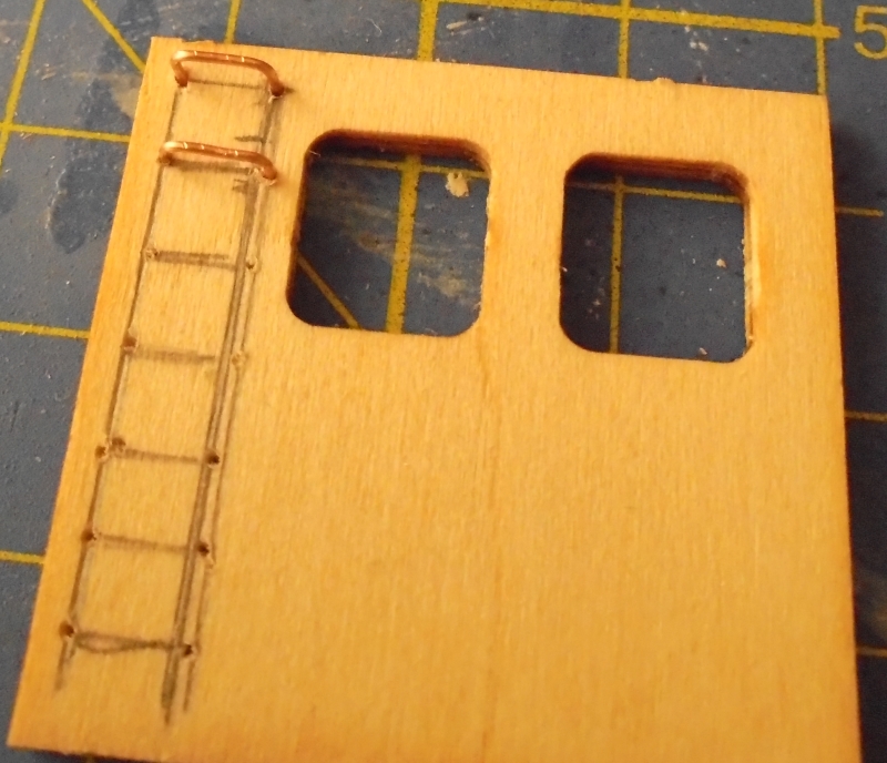 The next level of the wheelhouse has a set of ladders on one side. The rungs are made from a spool of copper wire.