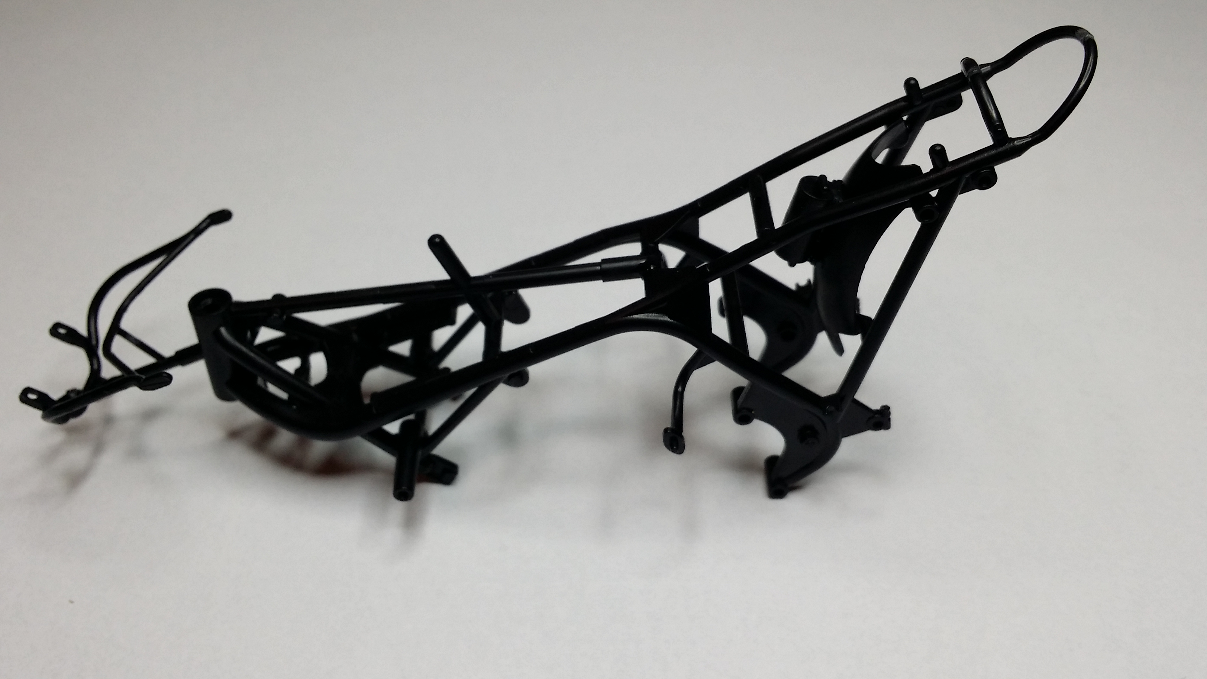 The frame has had the seams filed and sanded, and then a white coat of primer as this shows any marks that need attention really well. Once dried the frame will be sanded with micromesh until I am happy with it, then a coat of black primer and a gloss black top coat.BigGrin