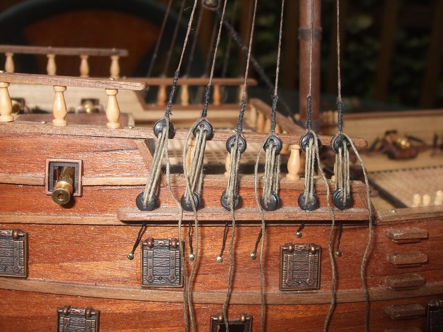 Looking nice! A word of warning though, before you do much more rigging, the rail directly behind the main mast is also a pin rail and will need to be drilled out before you do much more rigging. There are twelve pins to locate they are place in pairs between the columns, this does not appear in the instructions but is shown on the plan which you might not have recieved yet. Hope that is of some help to you, I have included a photo from my build as a guide.  This isn't the best picture but you can just about see the pins? Cheers Steve..