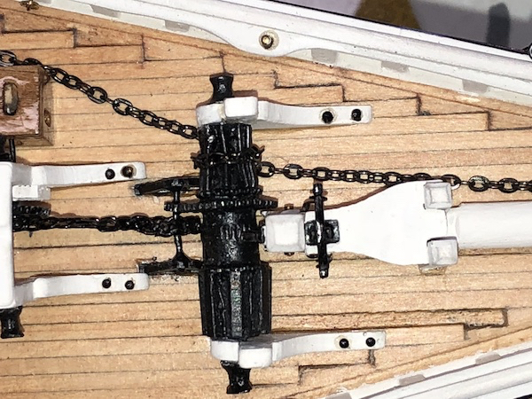 Update two October 12, 2018 Here is another update on my Bluenose build. In my last post I explained how I managed to make my two different types of turnbuckles. In the pictures you can see the small simple jig I used in order to solder the pieces together. I have made some changes to the winch box by completing the hinges and by using a mat finish in order to appear more realistic. It was time to mount the anchors and catheads. After looking at the Britannia fittings, I realized that I would need to create my own version, something a little stronger, as the ones included were not only flimsy but also useless. In completing this I used some 19 gauge black wire, soldered some brass strips one on either side in order to create the top portion with the ability to drill holes in order to mount the chain and the line through a sheave at the top of the catheads. On the port side I ran the anchor chain up through the hawse pipe and around the winch. On the starboard side I ran a line instead of a chain through the hawse pipe simulating a spare anchor. I completed the winch gear cover by bending a piece of brass and soldering a small extension in order to attach it to the side of the Samson post. My next step was to construct the main mast followed by the fore mast. I started with the main mast, as it looked simpler. I cut the bottom and the top portions and installed the trestletree and spreaders. As for the bands, I used brass tubing and cut them at 2.6mm I drilled and installed eyebolts as needed. All other fittings on the mast were made from brass rod and soldered in order to create fittings like the gooseneck, bails and mast cap. I made another small jig in order to solder the mast cap together. I used two different sizes of brass tubing and joined them together with solder. If I had to do this over, I would have installed an outer border in order to make it more substantial. I managed to add a small recessed brass ring around the pin saddle by cutting a larger ring. It would have been too small if I had used the two-laser cut half’s included. This allowed more room for the belaying pins and the brass ring. Instead of creating a mast coat I used brass mast steps in order to finish the base of the mast. I tried several attempts at making the mast trucks, which is a small base for the gilt ball at the top of the mast. I tried shaping a piece of dowel, which didn’t work as it would split. Next was using a hole punch and some thin plywood and left over basswood from the kit. This also split when I tried to file it to size. What did work was the punch method by using 1/16 cherry as this allowed me to shape it and drill the holes for the halyards. A small pin with a white head w]as installed for the Gilt Ball. Completing the fore mast was a little more challenging, as there were many more fittings and moving parts made from brass rod. As you can see, I decided to build a small round hopper described in the plans as an unidentified object. Using a piece of brass tubing and a leftover base from the laser cut mast hoops. I made some small buoys and just inserted them in the hopper just to add a bit of fishing gear. My next task was building the booms. The plans called for a 1/8-inch dowel for the fore gaff, Jumbo Jib boom, and the fore boom, I found this too small and decided to use a 5/32-inch dowel instead. This was much easier to work with and much stronger. I used a 3/16 dowel for the main gaff instead of the 5/32. The main boom is 15/64 supplied with the kit. As for the stain, I used a combination of stains on all the masts as well as on the booms. Stains included Colonial American Minwax, # 230 and Golden Oak Minwax #210B. This allowed me to achieve the color I wanted. These pieces were finished with three coats of gloss varnish then burnished with paper towel. The plans showed two sheaves inserted inside and towards the end of the main boom. I could have just used a small hole with a small piece of brass in order to create the illusion of these sheaves. I considered the possibility of actually making a couple of sheaves. I started out by cutting out 2 rectangular openings in the dowel. Following this I used two small rivets by first removing the nail and then cutting off the shaft. Now I had two saucer shaped pieces that I soldered together. Next I drilled out the center in order to insert a 3/32 OD brass tube, this allowed me to insert another 3/64 OD brass tube inside the first one in order to accept a piece of .032 brass rod as a shaft. In order to finish the area around the two sheaves, I used some thin mahogany left over from the material used to make the two dories. Well that is it for now I am in the process of making an acrylic case in order to protect the model once I start the rigging. I will be away for several months so stay tuned for the next update on my Bluenose build. Thank you for your comments together with your interest and hope you enjoyed the diary.  Marcallain attached the following image(s): Completed Build: Bluenose