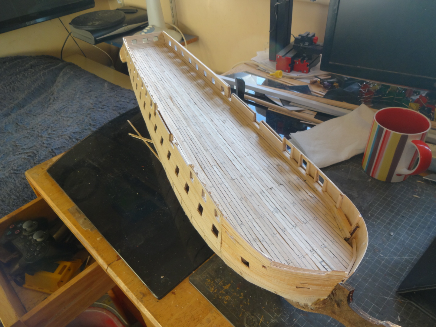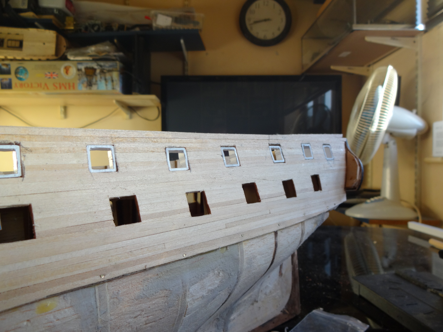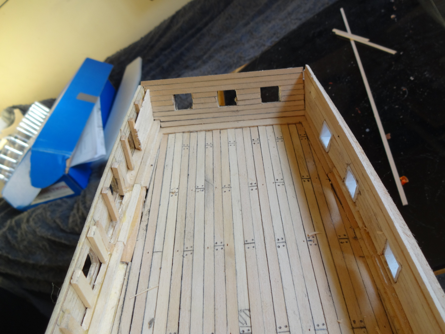 at the mo the stars are paper cutouts,just to see what they look like,will have to make some. right on with the show,this week been busy doing the deck,gunwales/gunports, inner transome,total build time 110hrs. Current builds: SotS, USS Consitution, San Felipe, D51 loco, HMS Surprise, RB7, Arab Dhow, Jotika HMS Victory Completed builds: HMS Pickel, Thermopylae, Mississipi river boat, Mary Rose, Cutty Sark, San Francisco II, HMS Victory x5, Titanic Lifeboat, Panart HMS Victory Launch, Hachette Titanic, Virginia Schooner, Endeavour Longboat. http://www.model-space.com/gb/