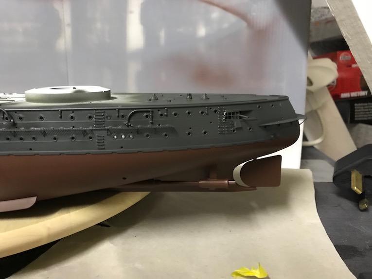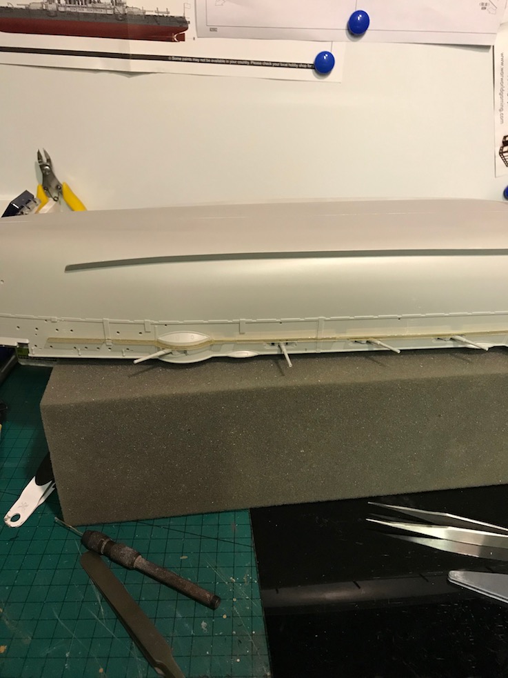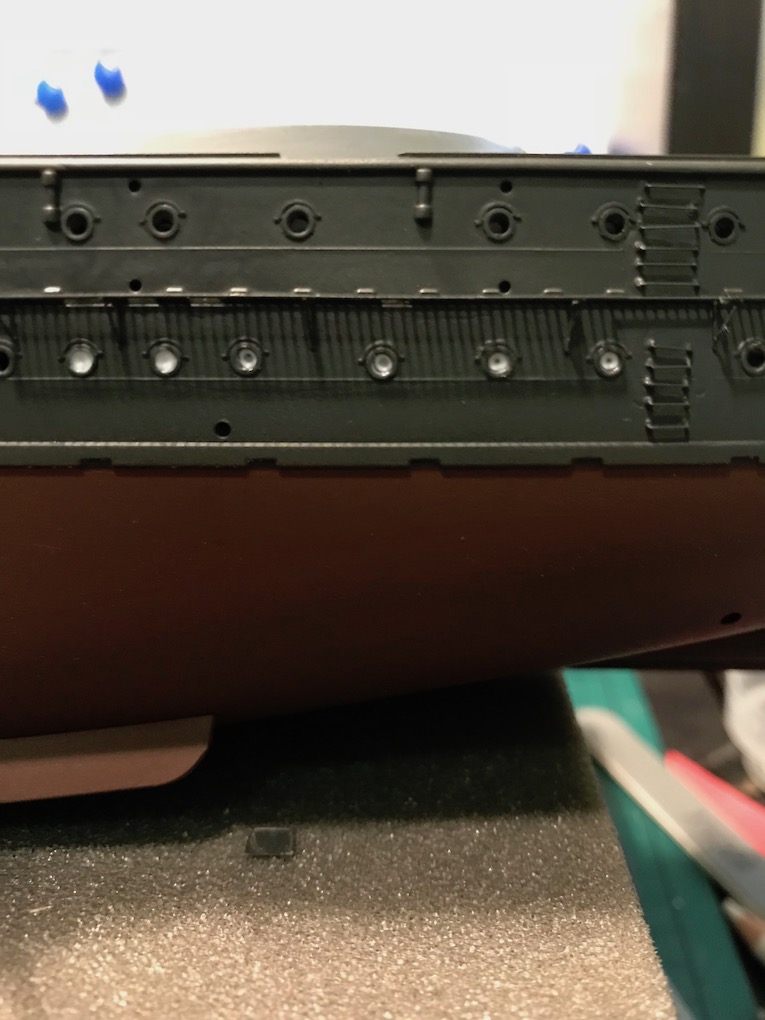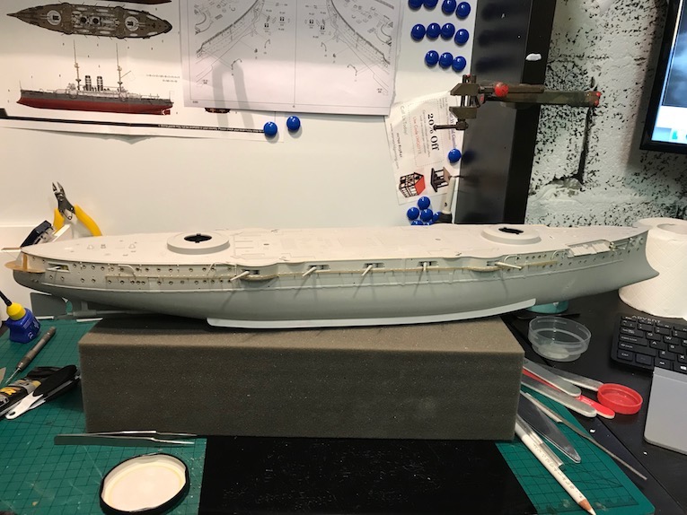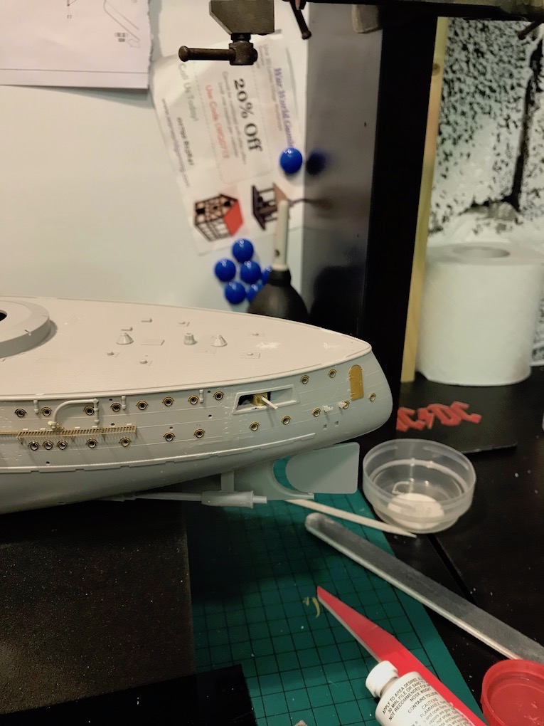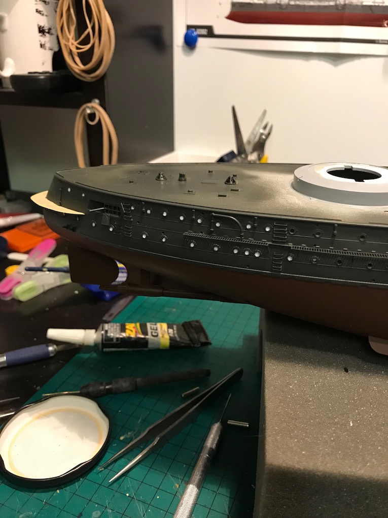 I also noticed an error in the kit at this point one of the coaling shoots, a long rectangular bulge on the hull side, is not accounted for by the etch, ether set!, so a slot needed to be cut in with a razor saw.