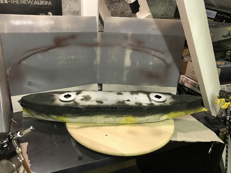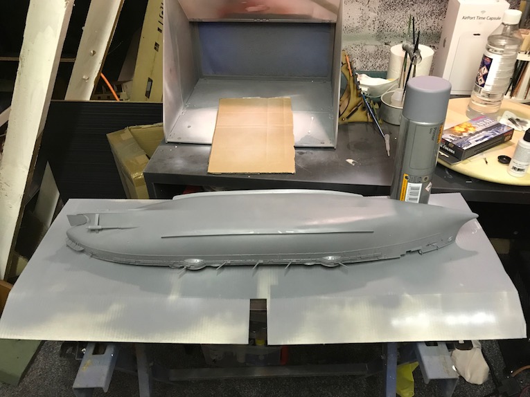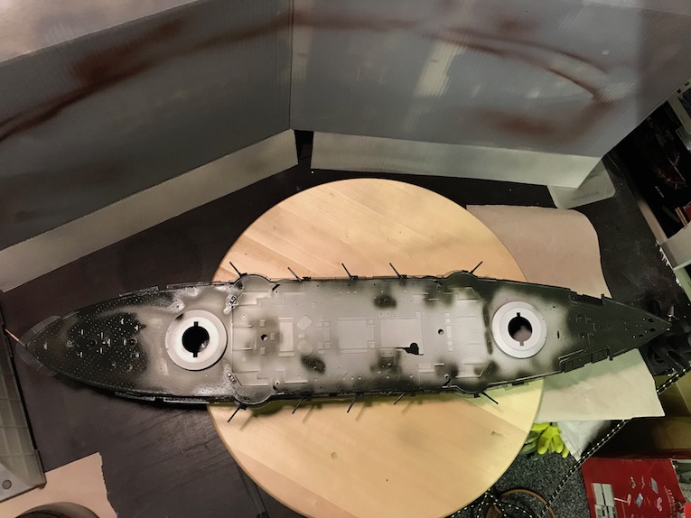 I have used two primers for the hull of this build. The deck was primed using Tamiya fine white rattle can, photo 1. The Turret barbet housings will be a very pale grey so wanted to use a light primer. the outer hull was primed with Halfords grey, photo 2.
