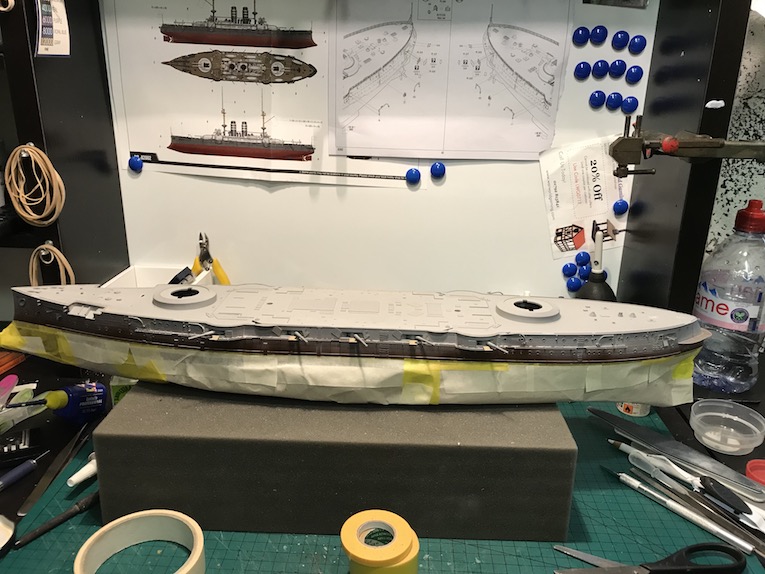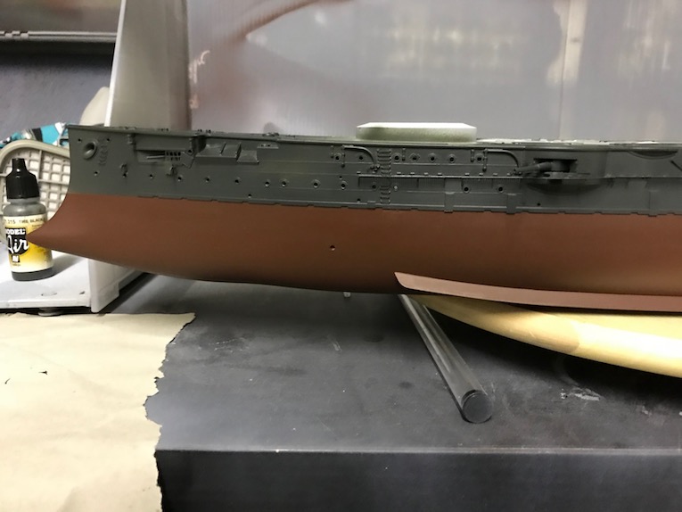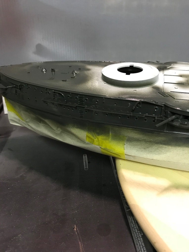As the hull colour is going to be black I dot not go with my normal Hull red and chose a lighter shade to lighten the overall look and give a bit more contrast. Photo 5. two coats were applied, photo 6, and allowed to dry overnight before being masked off to do the upper hull, photo7.