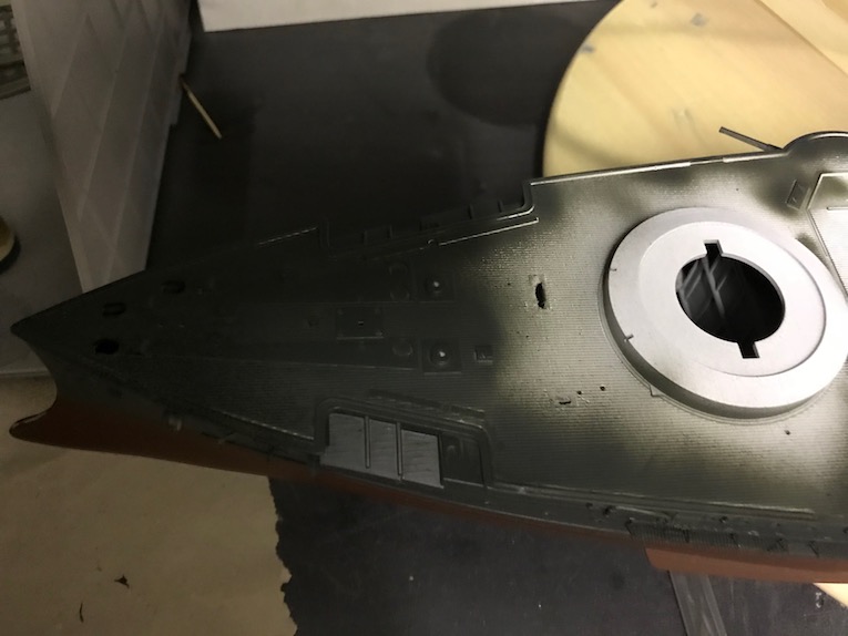 So the hull is black only it is not because I find black to dark for large hulls, detail disappears in the darkness of it all. so I have gone with tyre black, photo 8, which is a satin extreme dark grey. this shows of all that detail wonderfully and gives the hull a nice industrial iron look. not only are the hull sides done in the tyre black so are the deck fittings at the bow and stern. some of the moulded on deck fittings were removed prior ti fitting the deck to allow for replacement etch, which is why there is a small hole in the deck.
