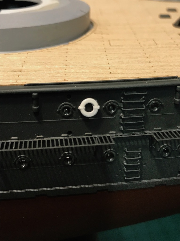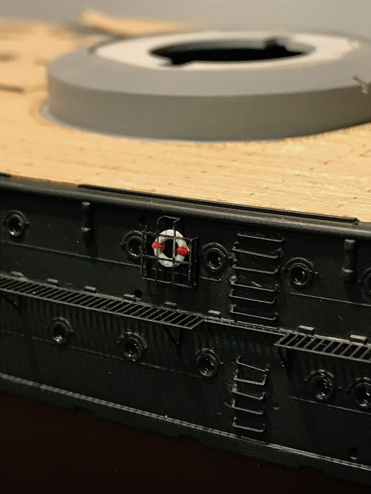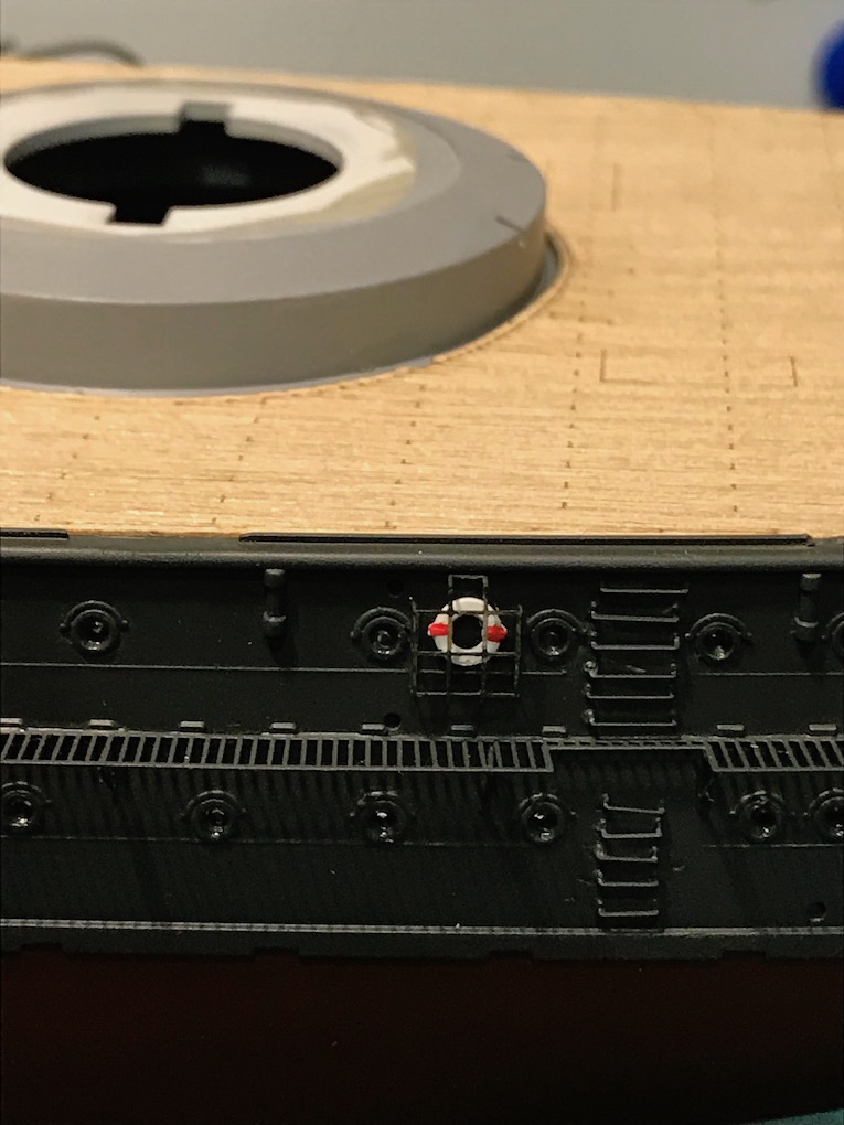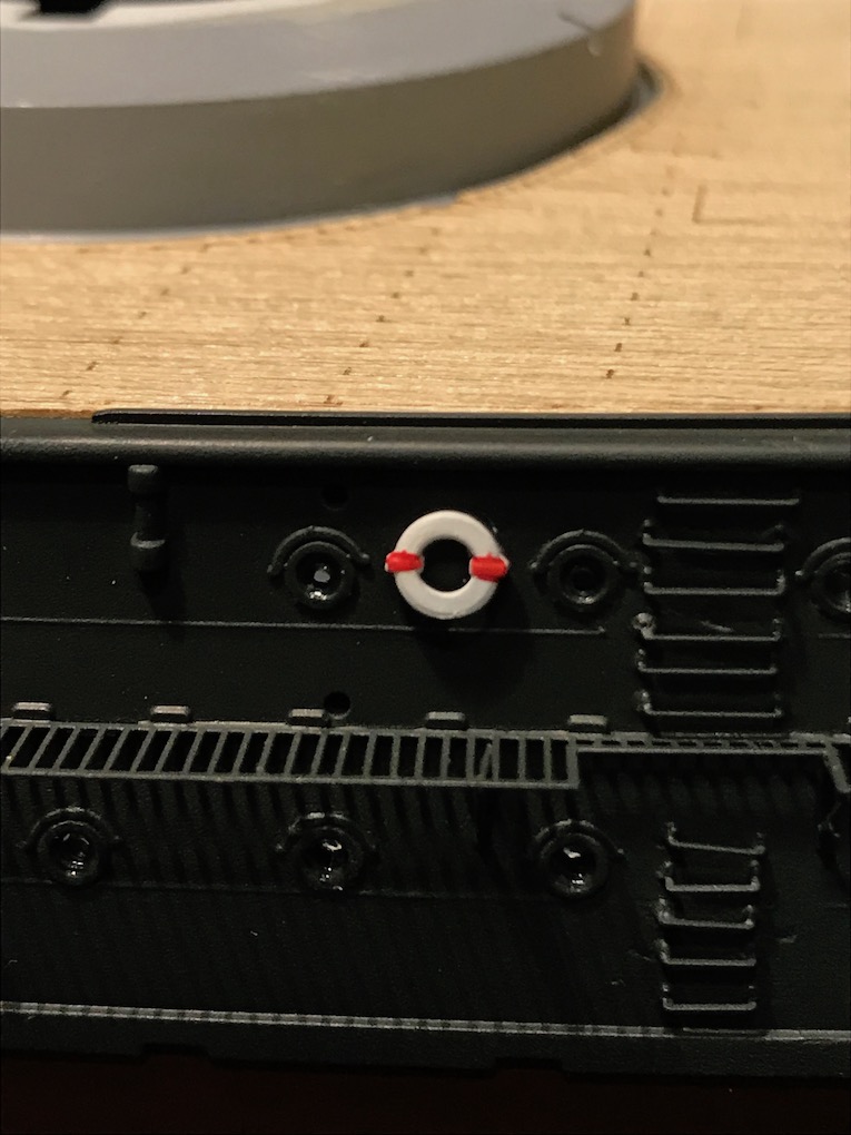 There are two life belts to be added to the hull. they were painted off white first then glued in place with medium CA. once dry the red was added.