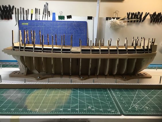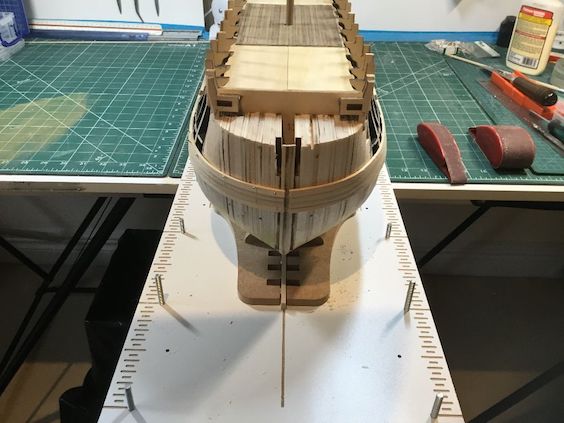 Hi,I found that you need to have a smooth transition across the bulkheads free flowing and with out any bumps or depressions, as this will make it more difficult to correct at a later date. So look at this very carefully from all directions, as it is very important, pin a temporary batten along the bulkheads to check the alignment, if you can see bumps file then off,if you can see a depression use a wood filler.So again take your time. Ps:Make sure the batten has no knots or weak areas. Pin the batten at every bulkhead (it may be necessary to pre drill batten) Use a long batten so it is held in constant contact. Regards Trev Work in progress: Tombstone (Scratch) - San Francisco 2. -The Mayflower ( scratch by plan).