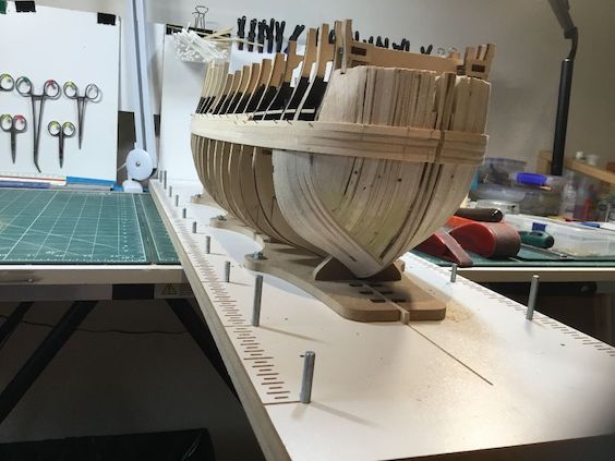 When I lay the very first plank at the bow, I get it to follow the bottom of the gun deck, which is curved upwards, and then let the plank take it's own line around the front of the bow. I was wondering if there is an approximate dimension that I should attain from the top of that first plank up to the top of the false keel? At the moment I have a dimension of 43mm (4.3cm). I realise that this figure is going to vary slightly with every build but a guide dimension would be very helpful to me. Thanks.