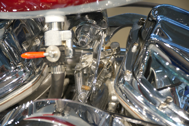 Today was a great day! The Barber Motorcycle reopened and I went right away. Have yet to examine the photos and cull bad ones but I will have a file of RAW High Res set up should anyone wants it. Some will be knocked down to size for posting now. So, the engine is cast iron and definitely a darker color than the kit's. The thumb rocker switch was not even there. An expert there said that as this is a total custom from the frame up, it was probably a manual choke on the engine used. (1962 variant?). So we are good with or without it! Lots of carb linkage to add if you wish. The rear foot rests are as per kit but the right one was twisted side ways so it could fold. Mark was correct in that arrangement would warm you right ankle! Only have time for this today with one pic.