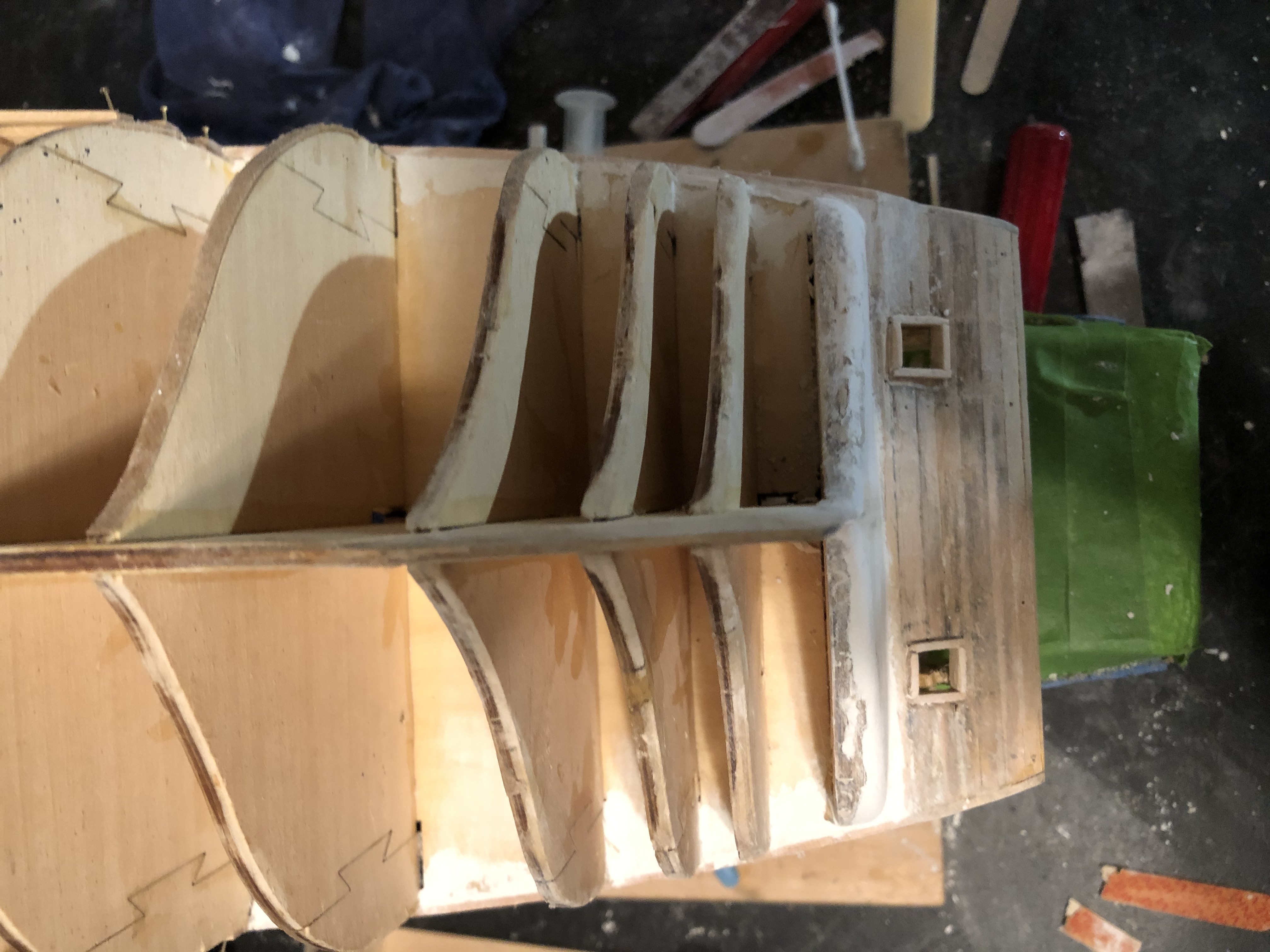 I finished filling the right side of the stern with wood putty but had to spread some putty on the front because it was un even as seen in the photos