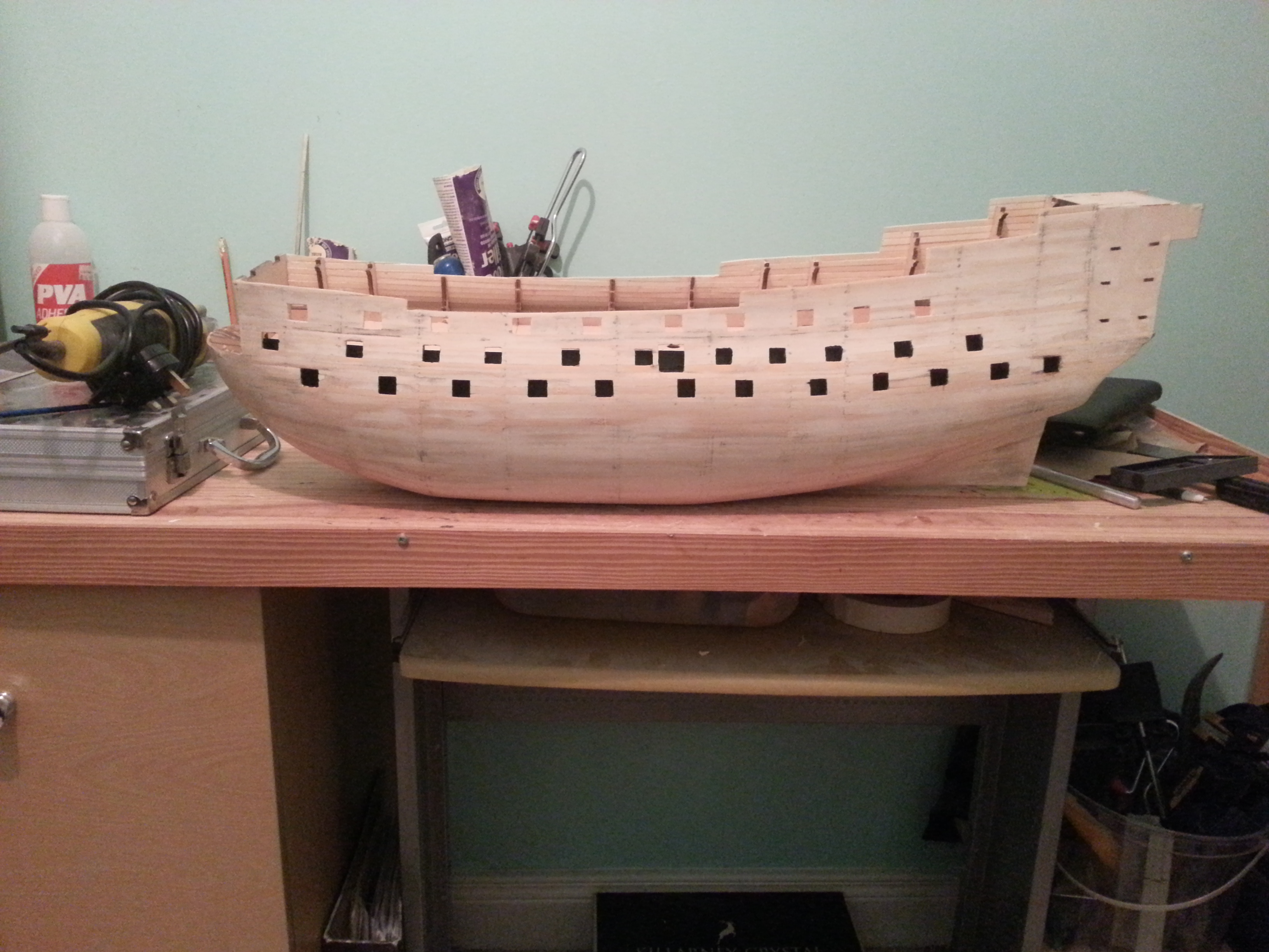 just finishing cutting the gun ports on one side of the hull. I must say I found this very tricky to do. I am reasonably happy with the outcome.