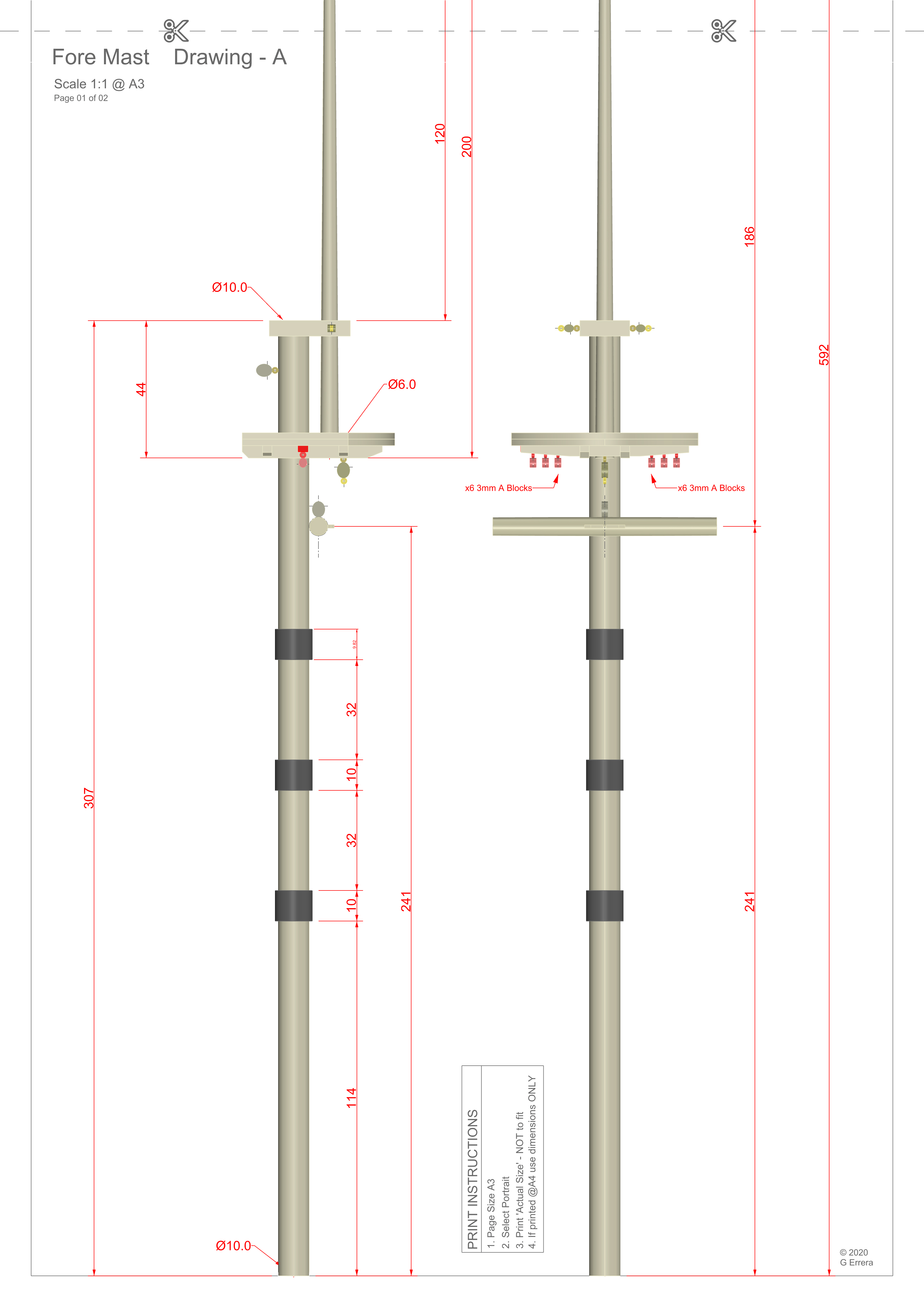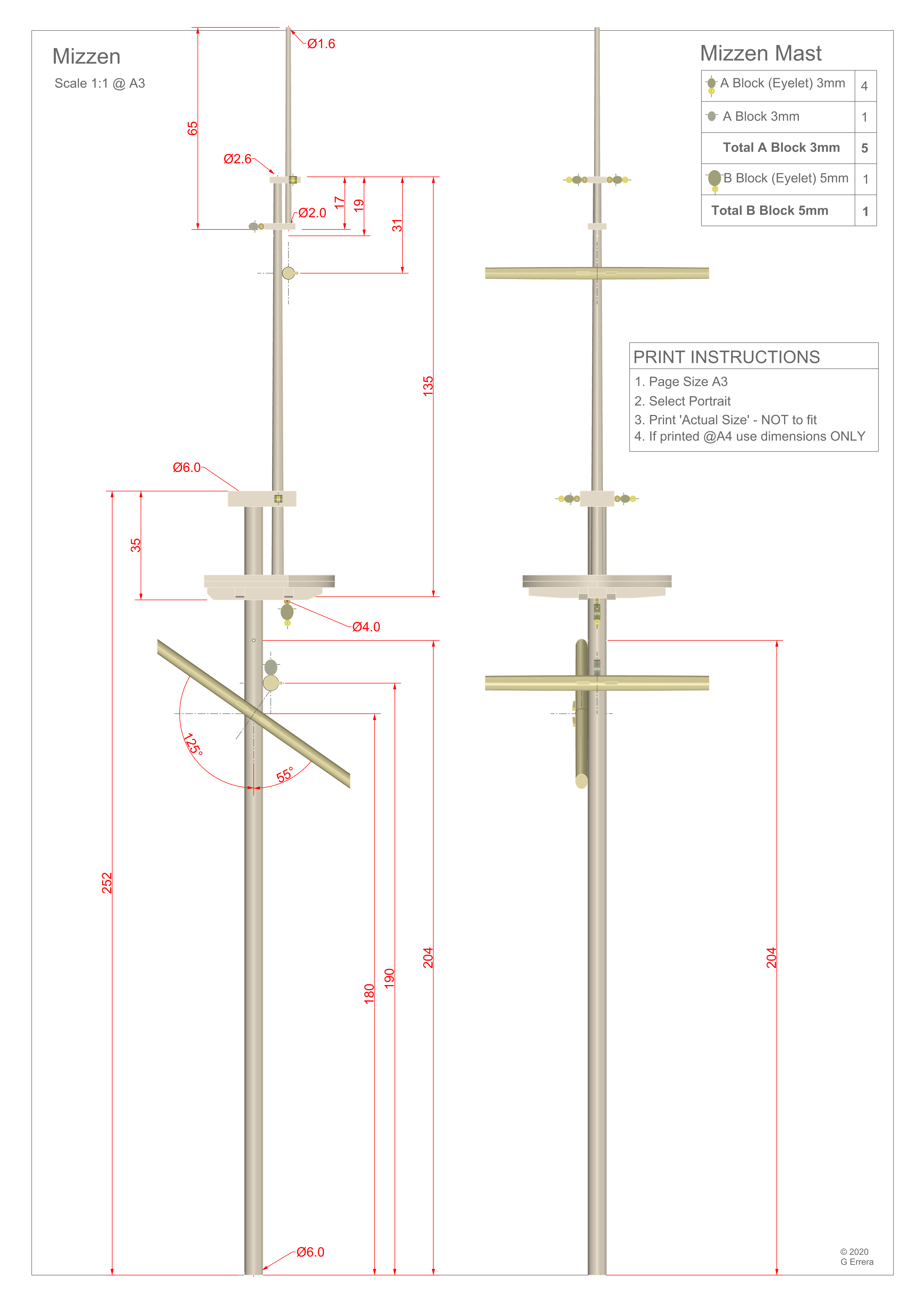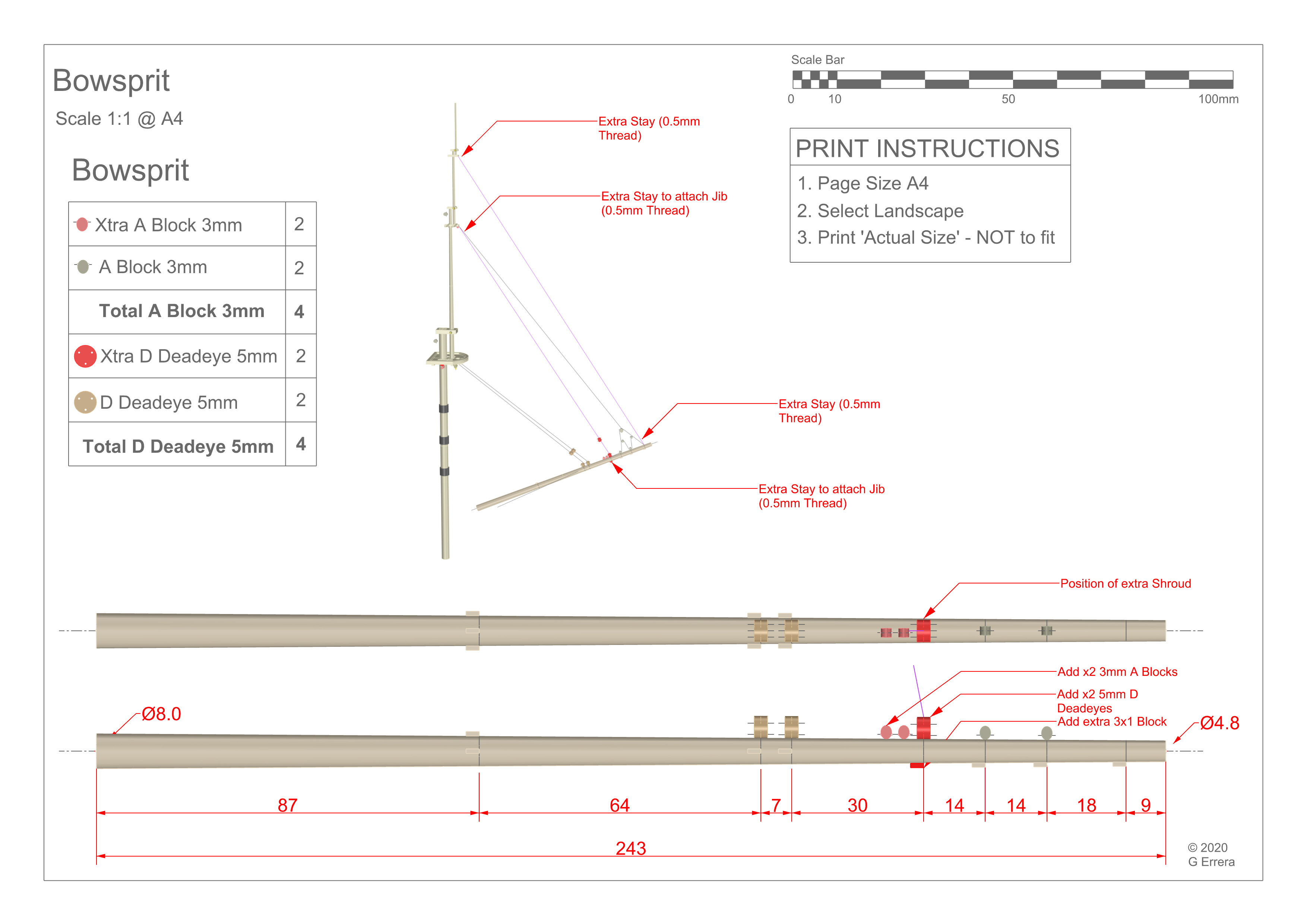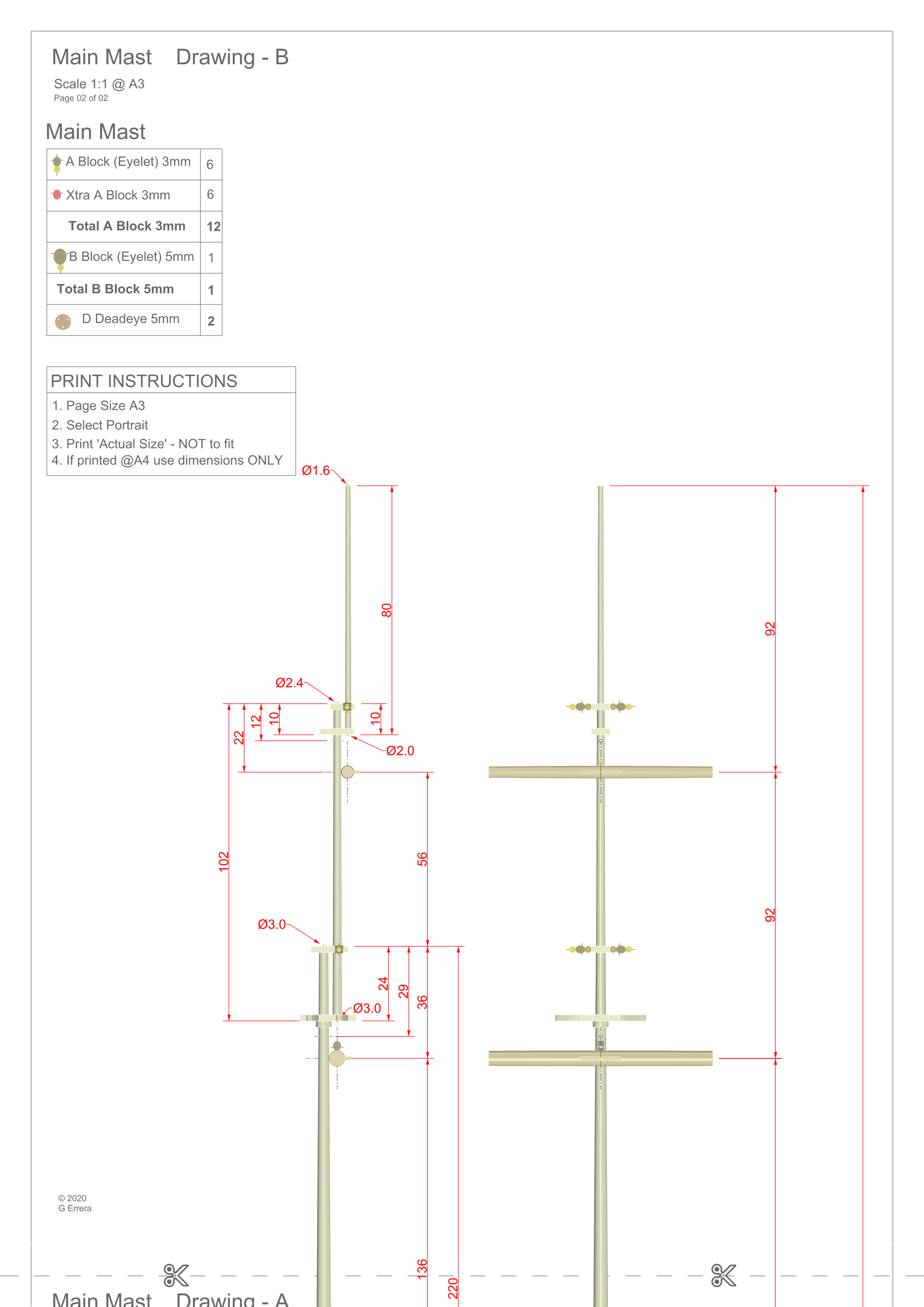 05 Masts & Bowsprit - Part 01 I am going to upload my first set of drawings. My intention is to have 2 of each drawing, one large and one small (that will display) Only download the _Large drawings if you are going to use them as a reference to build from – no point in wasting data. Hope this works. Apologies for the pixeled small drawings, they don’t resize as well as images. If anybody is going to follow my rigging plans, please note the following: (on drawings - Fore & Main Mast Additions & Bowsprit) - Fit one 3mm block under the cross tree on the fore mast – jib running rigging - Fit 6 3mm blocks under the fighting tops of the fore and main mast – fore & mainsail running rigging - Fit 2 3mm blocks to the bowsprit - jib running rigging - Fit 1 5mm D deadeye – extra stay to secure new jib - Note the position of the two new stays – purple line I will post some images of my progress in the next couple of days. Kind regards, Garth File Attachment(s): Garth attached the following image(s): "Measure twice, cut once!!!" Finished!!! HMS Victory, Current build: Black Pearl. On hold: Bismarck, Golden Hind, Flying Scotsman, Victory Cross Section, SOTS, Tiger 1. Wish list: USS Constitution.