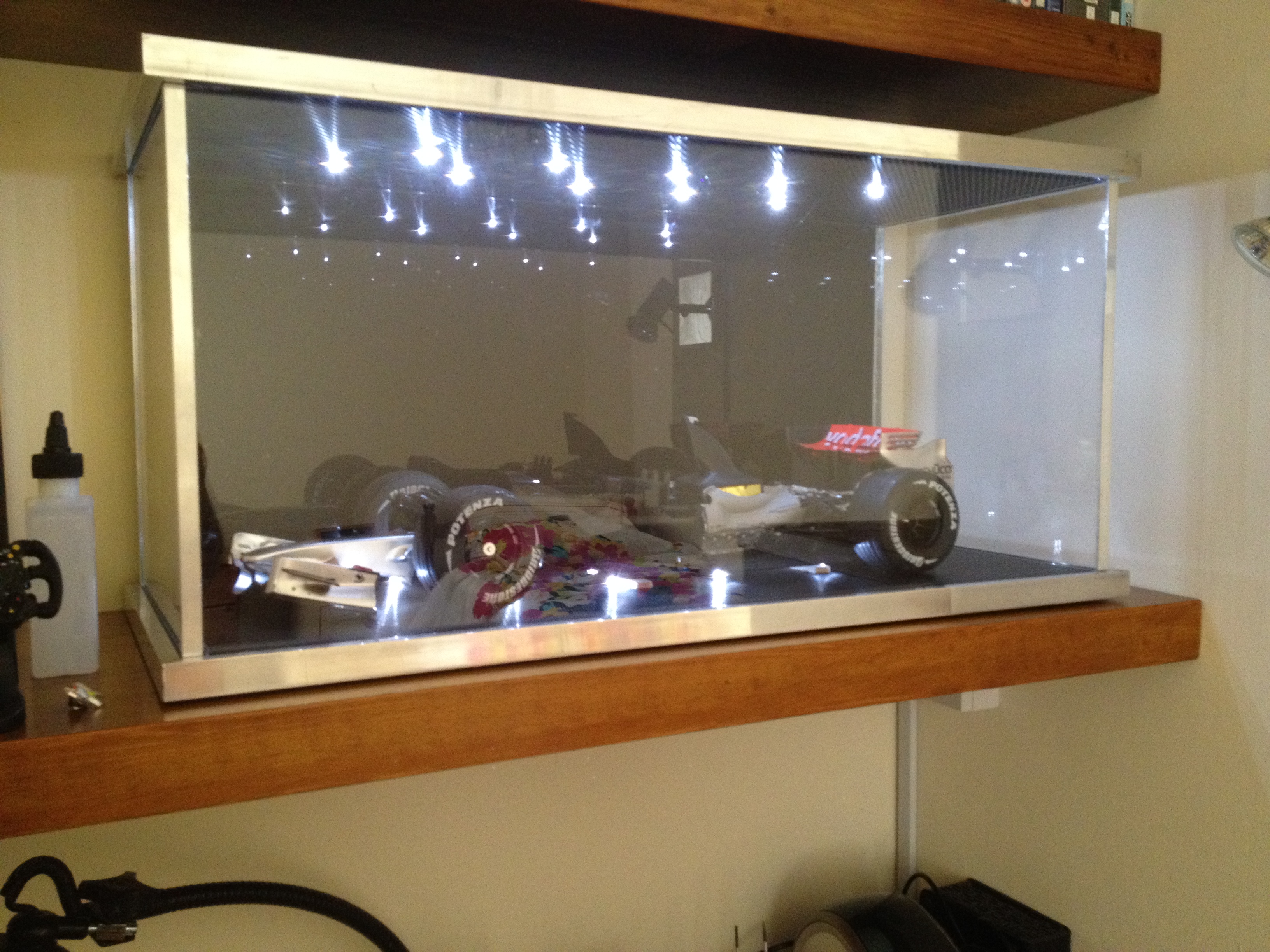 For the base i got 3mm hardboard cut to 4 x 730mm x 330mm. then 18mm x 40mm sawn timber. I stuck the saw timber around the hardboard then stuck another piece of hardboard on top to sandwich the timber. The base should then be 24mm thick. I bought 3D textured carbon fibre vinyl from ebay, using a hair dyer to soften the vinyl then peeling and sticking it to the top of the base. The top is the same principle apart from drilling 5 holes into the bottom of the top Base to put the LED's in, and putting the carbon fibre vinyl on both top and bottom of the top base. I also left the top hardboard of the top base unstuck so I could access the LED's.
