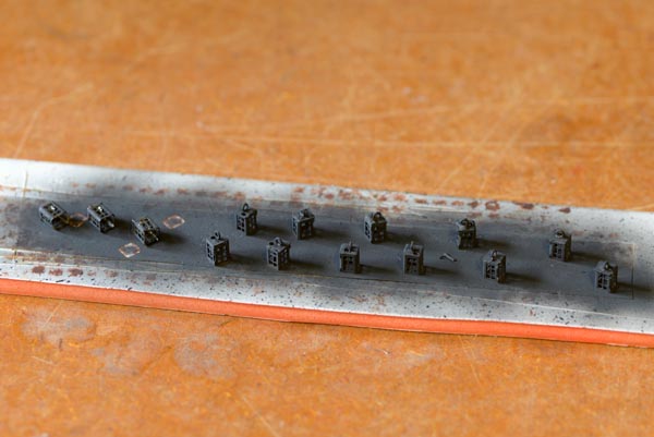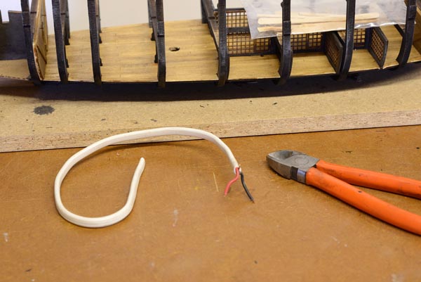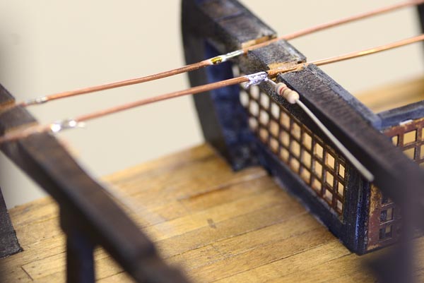 The LED’s for the lanterns will each require a resistor. It will be possible to make a small pc board and hide it behind the aft bulkhead, but I did not relish the idea of running (and keeping track of the polarity of all those tiny wires).