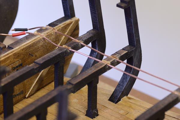I decided to light the lanterns using surface mounted LED’s. They fit comfortably inside the lanterns body. Unfortunately, I have used up all my thin wire that I used on the Victory’s lanterns and have had to use Armature wire instead.
