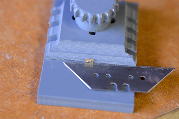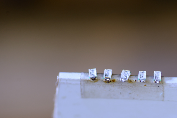 I stuck the LED’s to a piece of scrap styrene with double sided tape to hold them and tinned the ends. Hold the tinned end of the wire to the led and touch the soldering iron tip to the joint. Note: I cut one wire slightly shorter and soldered this to the Negative side of the LED. This just helps with the keeping track of the polarity during the installation.